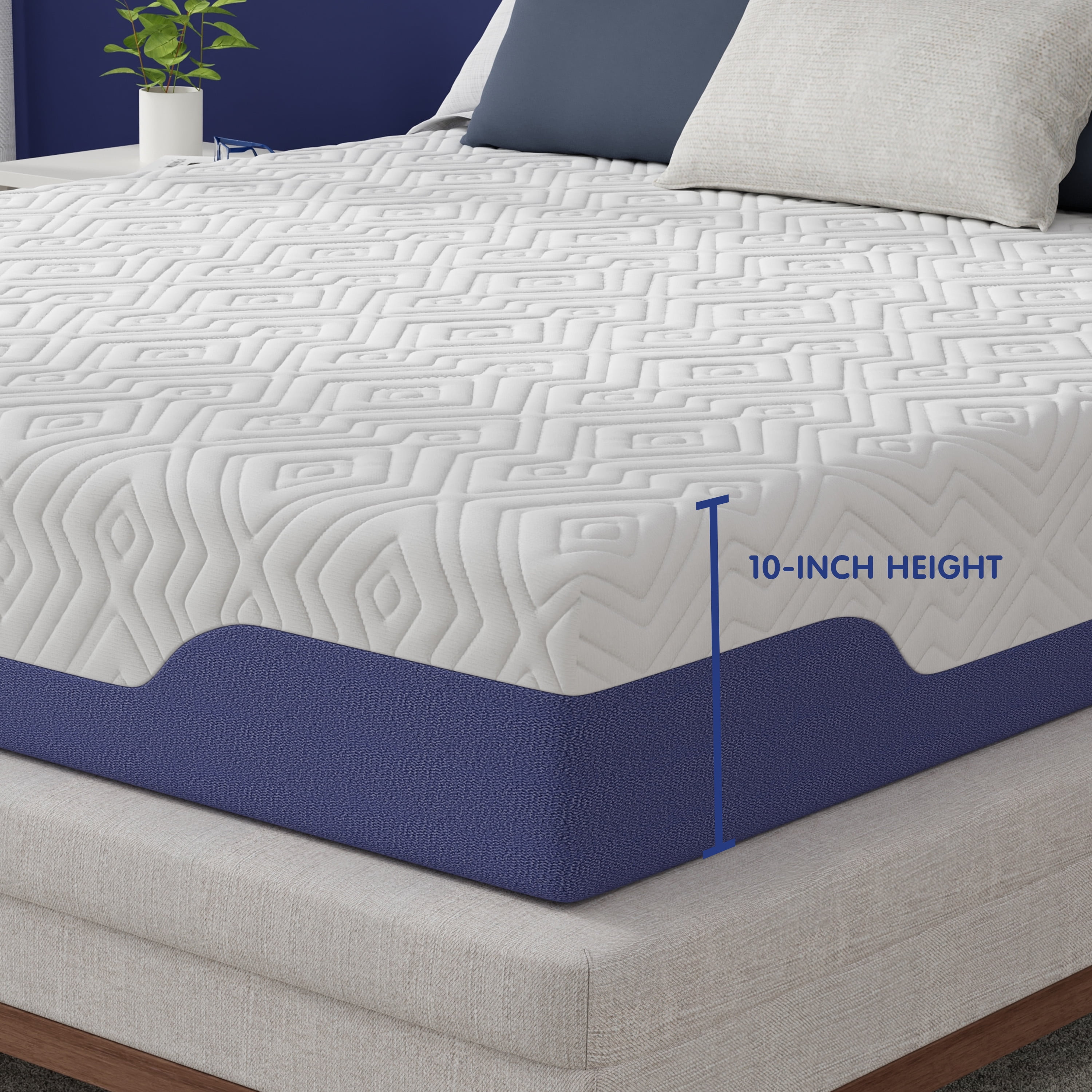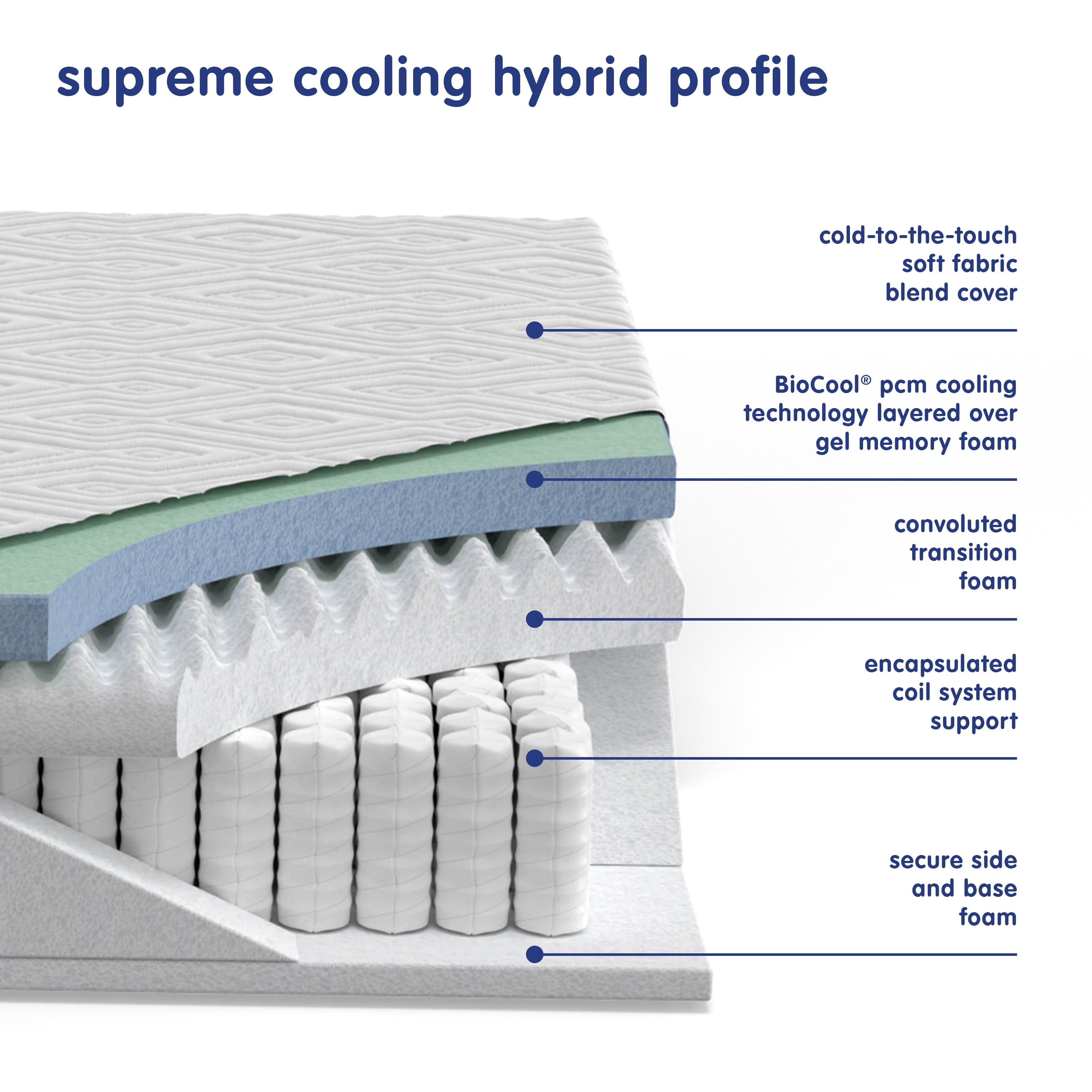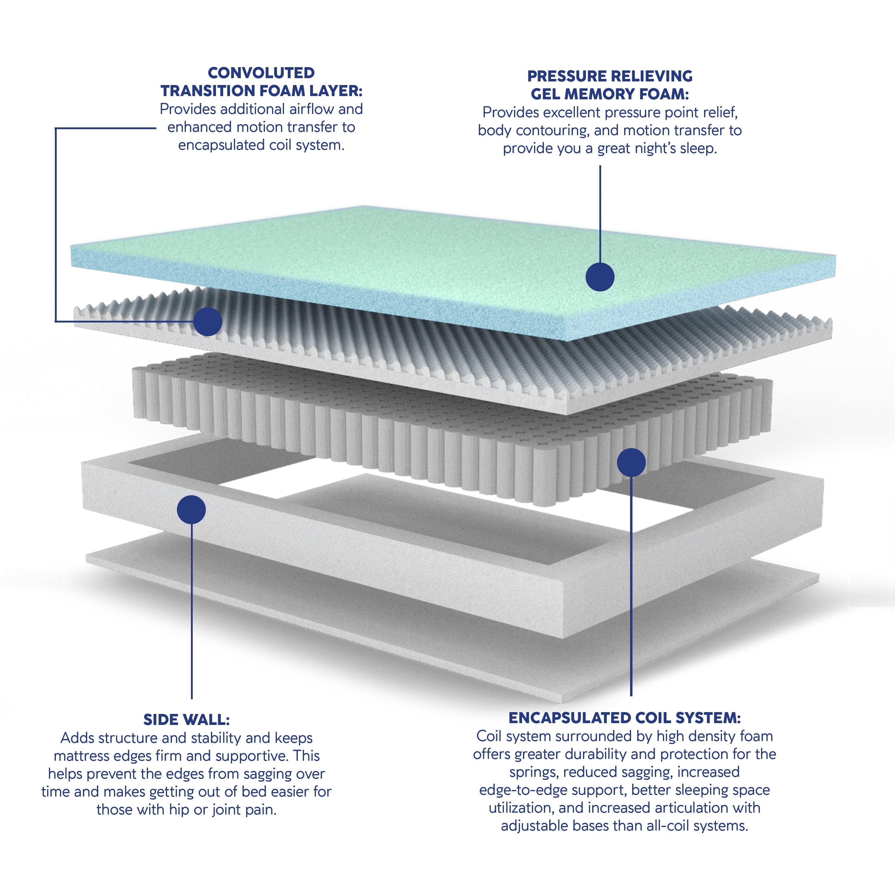 10” cooling hybrid mattress featuring cold-touch fabric cover, BioCool technology, and 3-layer memory foam and encapsulated coil system PRESSURE RELIEVING GEL MEMORY FOAM: Provides excellent pressure point relief, body contouring, and motion transfer to provide you a great night’s sleep CONVOLUTED TRANSITION FOAM LAYER: Provides additional airflow and enhanced motion transfer to encapsulated coil system. ENCAPSULATED COIL SYSTEM: Coil system surrounded by high density foam offers greater durability and protection for the springs, reduced sagging, increased edge-to-edge support, better sleeping space utilization, and increased articulation with adjustable bases than all-coil systems. GOOD VIBE GUARANTEE: This mattress features a 10 Year Limited Manufacturer’s Warranty CERTIFIED FOAMS: All foams are tested by the rigorous standards of the CertiPUR-US and OEKO-TEX Standard 100 programs ensuring the foams are tested by independent labs for content, emissions, durability, and performance, have low VOC emissions and are made without harmful chemicals. ECO-FRIENDLY PACKAGING: Reduced carton size from traditional mattress-in-a-box products with 100% Forestry Stewardship Council (FSC) Certified corrugated, all cartons are made from 30% recycled materials, and cartons are curbside recyclable. Ideal for all sleep styles Unpackaged Dimensions: Twin Dimensions: 75” x 39” x 10”, Twin XL Dimensions: 80 x 39” x 10”, Full Dimensions: 75” x 54” x 10”, Queen Dimensions: 80” x 60” x 10”, King Dimensions: 80” x 76” x 10”, Cal King Dimensions: 84” x 72” x 10” Age Group: All Ages, Universal.