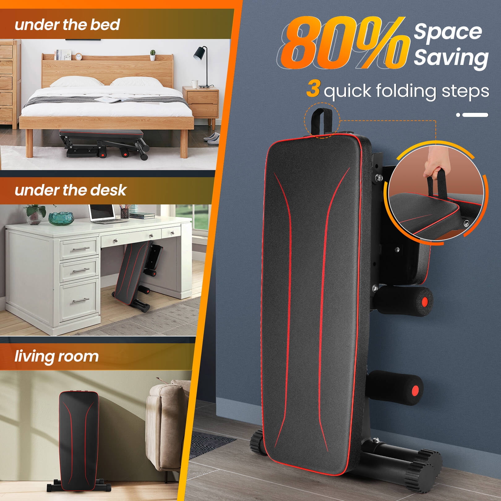 Foldable weight bench saves 80% of space 8 backrest positions for quick adjustment Wider backrests and cushions, comfort and easy maintenance Add two extra leg support foams to protect the popliteal fossa High-quality steel, triangular design, 660lbs load capacity Key Features: [80% Space Saving] — This weight bench is foldable, with dimensions of 31.49×19.29×10.23 inches when folded. It’s compact, space-saving, and portable. After exercising, you can quickly fold and store it in a corner of your living room, a closet, under a table, or under a bed, making it ideal for apartments, small offices, or limited spaces. [Quick Adjustable Workout Bench] — This adjustable fitness bench features 8 back adjustments, allowing it to function as an incline, decline, or flat bench. You can perform bench presses, flyes at various angles, rowing, crunches, arrow squats, incline curl, tricep dips, and more. The snap-on ladder-type adjustment is quick and secure. [Ergonomic & Comfortable] — The 12″ wider backrest and seat provide ample lumbar support and are made of thickened, upgraded, breathable, waterproof, and sweatproof leather. This makes the workout bench easy to maintain and clean. Ideal for home workouts, it ensures a clean environment without concerns about gym hygiene and experiences comfort with soft foam padding. [660LBS True Capacity] — Made of high-grade steel with a double triangle structure, this folding weight bench is extremely strong and durable. Adjustable non-slip foot caps ensure stability on various floor types. It won’t wobble during workouts and can hold up to 660 lbs, making it perfect for home use. [Easy Assembly] — When you receive the package, simply follow the instructions to assemble the weight bench. It’s very easy to put together, so don’t worry about not being able to finish it. If you have any issues, please feel free to contact us. We’ll resolve your problem promptly and ensure your complete satisfaction. Specification: Brand: VIBESPARK Color: Black Backrest Angle: -31°, 0°, 10°, 25°, 38°, 51°, 67° Item Weight:22.04lbs Weight Capacity: 660 lbs Frame Material: Alloy Steel, Leather, Metal Product Dimensions: 50.78″ x 13″ x 43″ Item Package Dimensions: 32″ x 13″ x 7″ Folded Product Dimensions: 31“ x 19″ x 10″ Style: Sporty Style Sport Type: Exercise and Fitness Muscle Group: Abdominal, Arms, Back, Biceps, Chest, Glutes, Legs, Shoulders Applicable Population: Adults & Teen Package: 1 x VIBESPARK Weight Bench (the Barbell and weight plates are not included) 1 x Screw Pack 1 x Accessory Kit 1 x Instruction