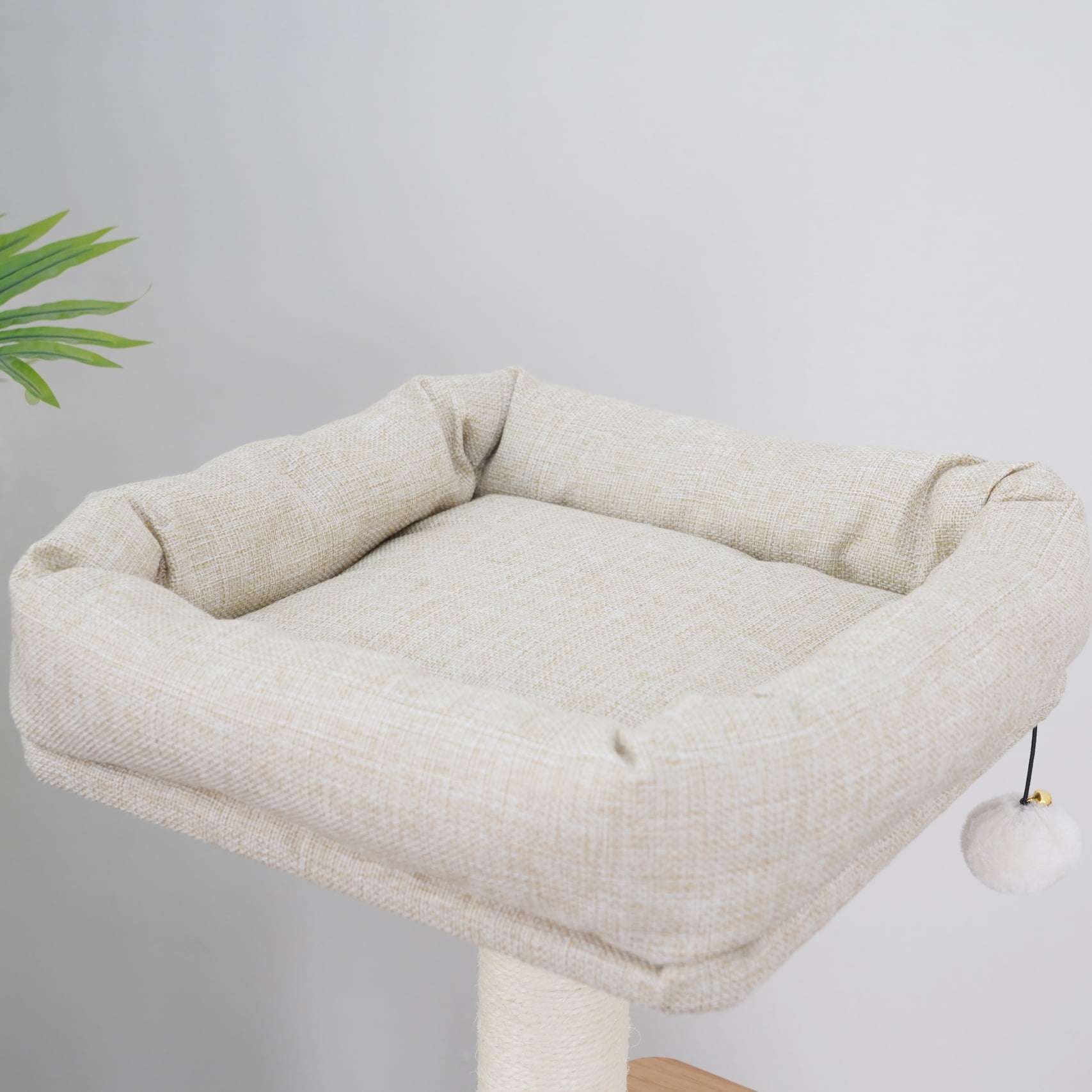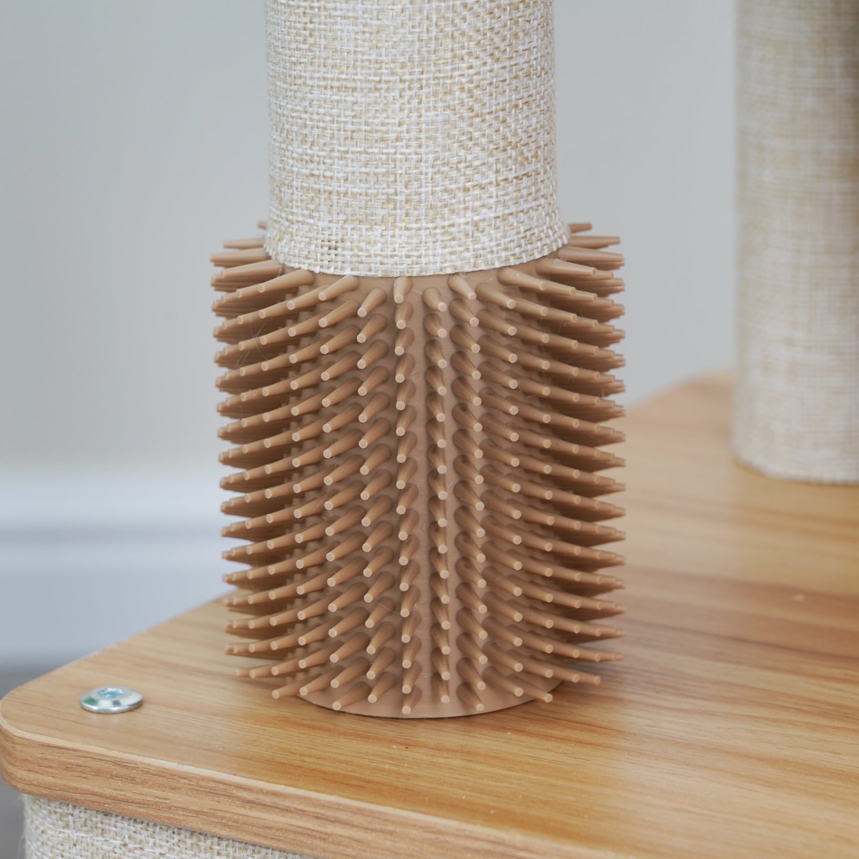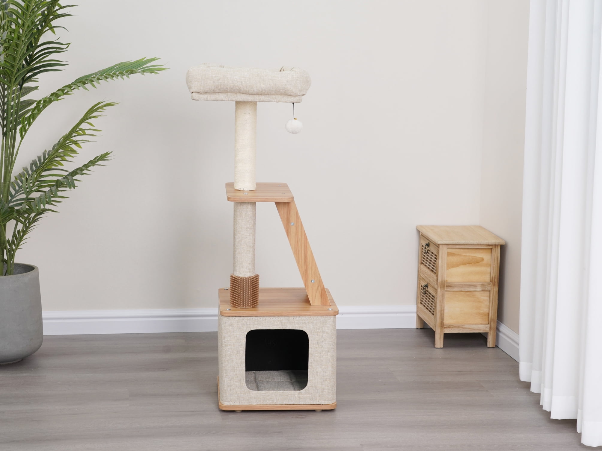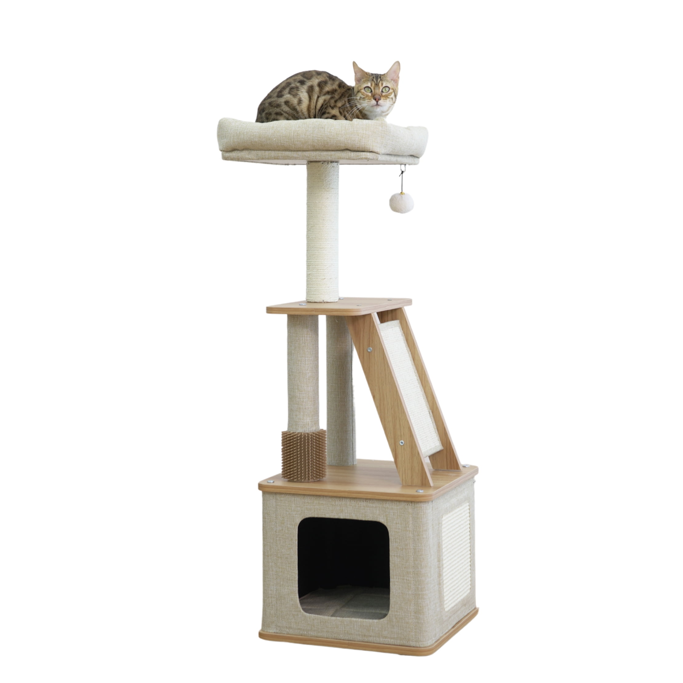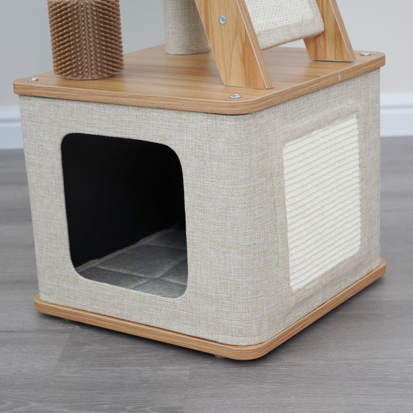 Vibrant Life 4-Level 42″ two steps laminated board cat furniture; New design special for indoor cats; Includes a removable soft plush bed perch; Double natural sisal scratching post and a sisal scratching mat; One rubber grooming brush for self-grooming sessions; One dynamic teaser cat toy for interactive fun.