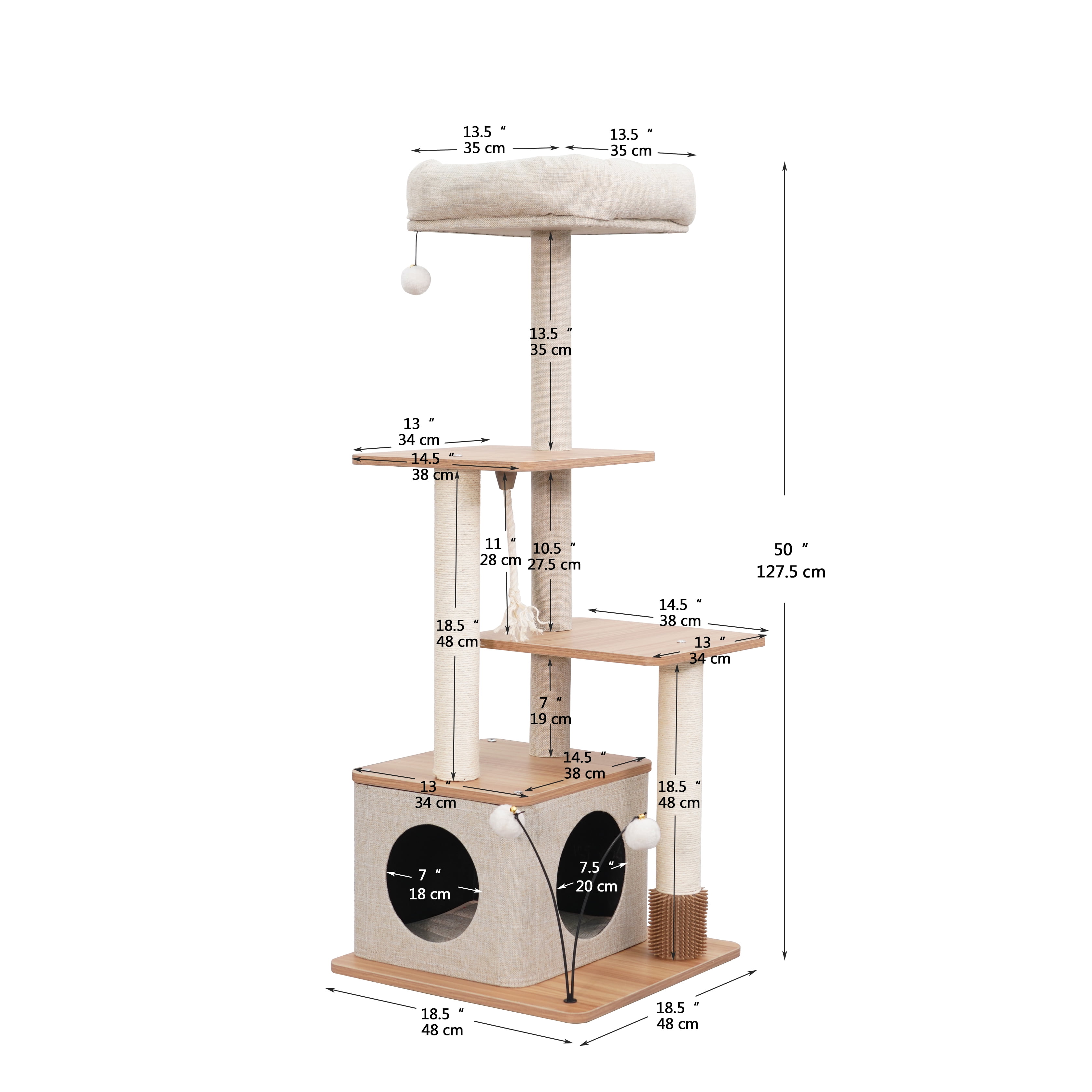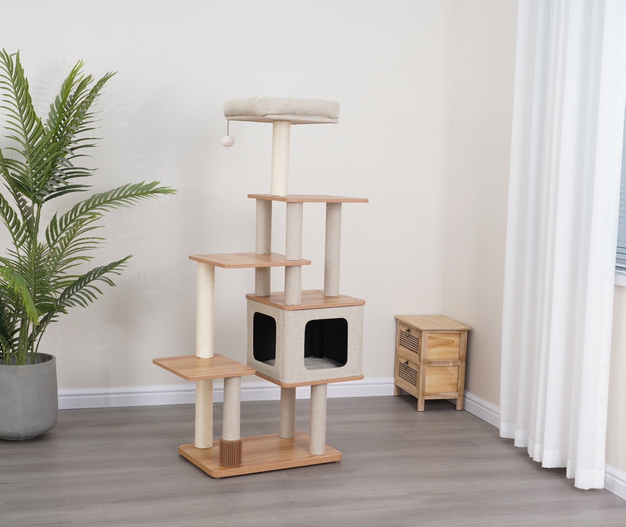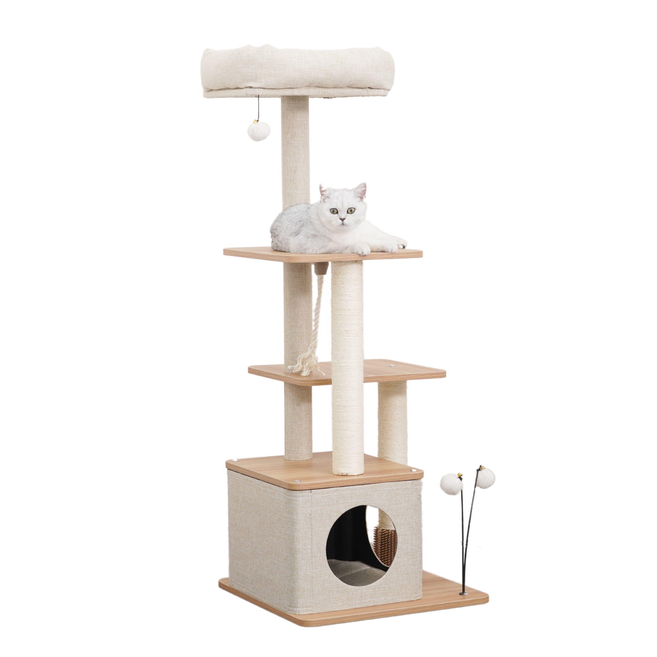 Vibrant Life 5-level 50″ multi-functional cat tree; A lofty six-tier arrangement for endless climbing fun Two all-natural sisal posts to promote healthy scratching A cozy condo and sofa bed perch for the ultimate resting experience An integrated rubber groomer for self-grooming convenience An enticing teaser cat toy for active play sessions Durable laminated wood board finish for a touch of modern elegance and easy cleaning