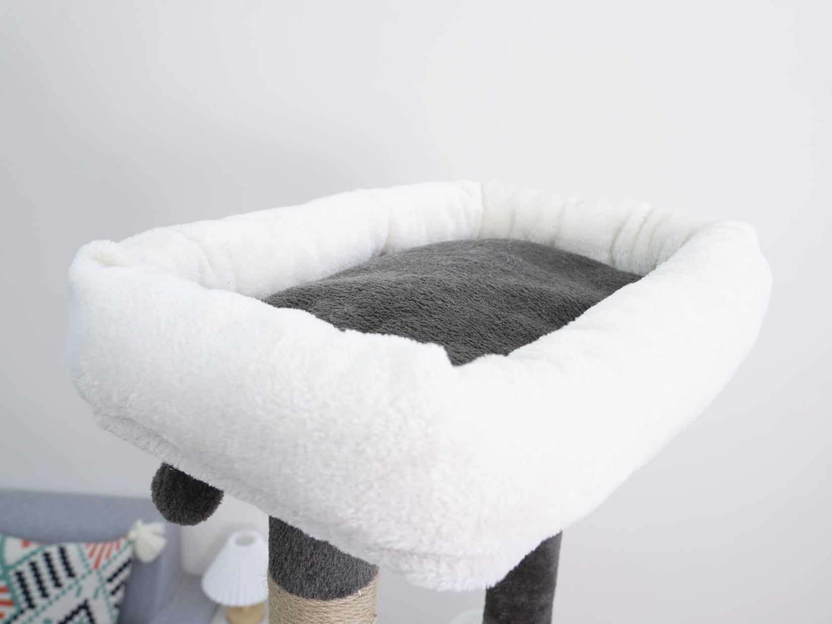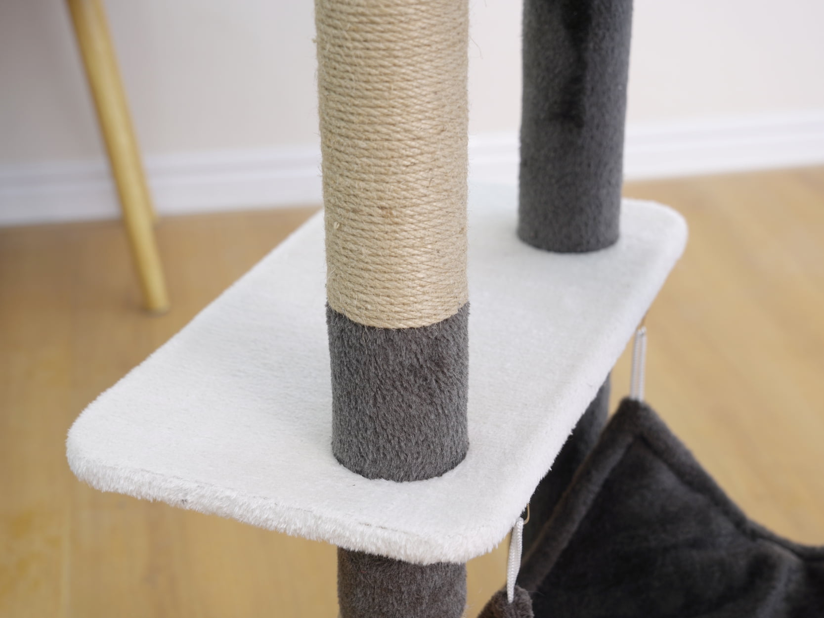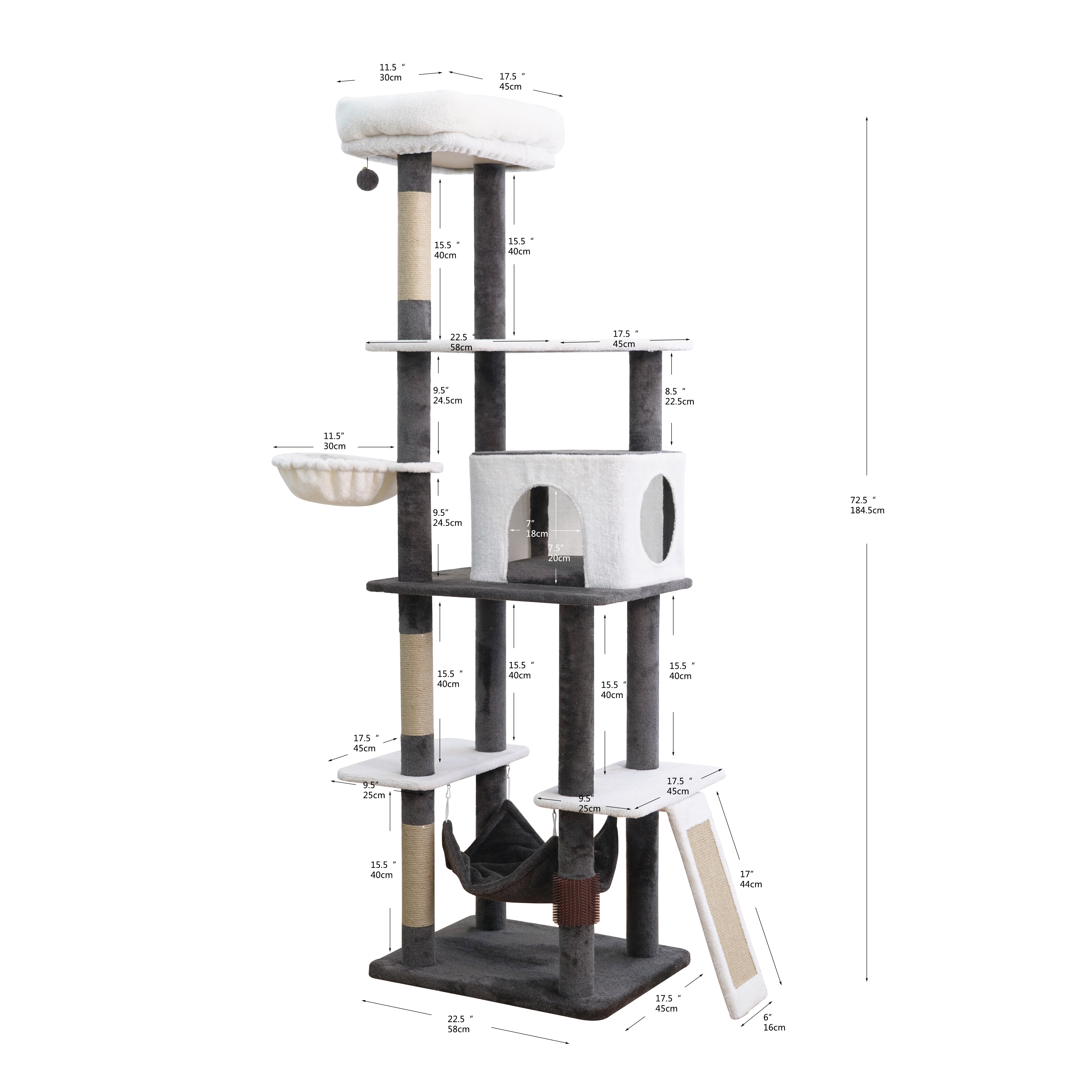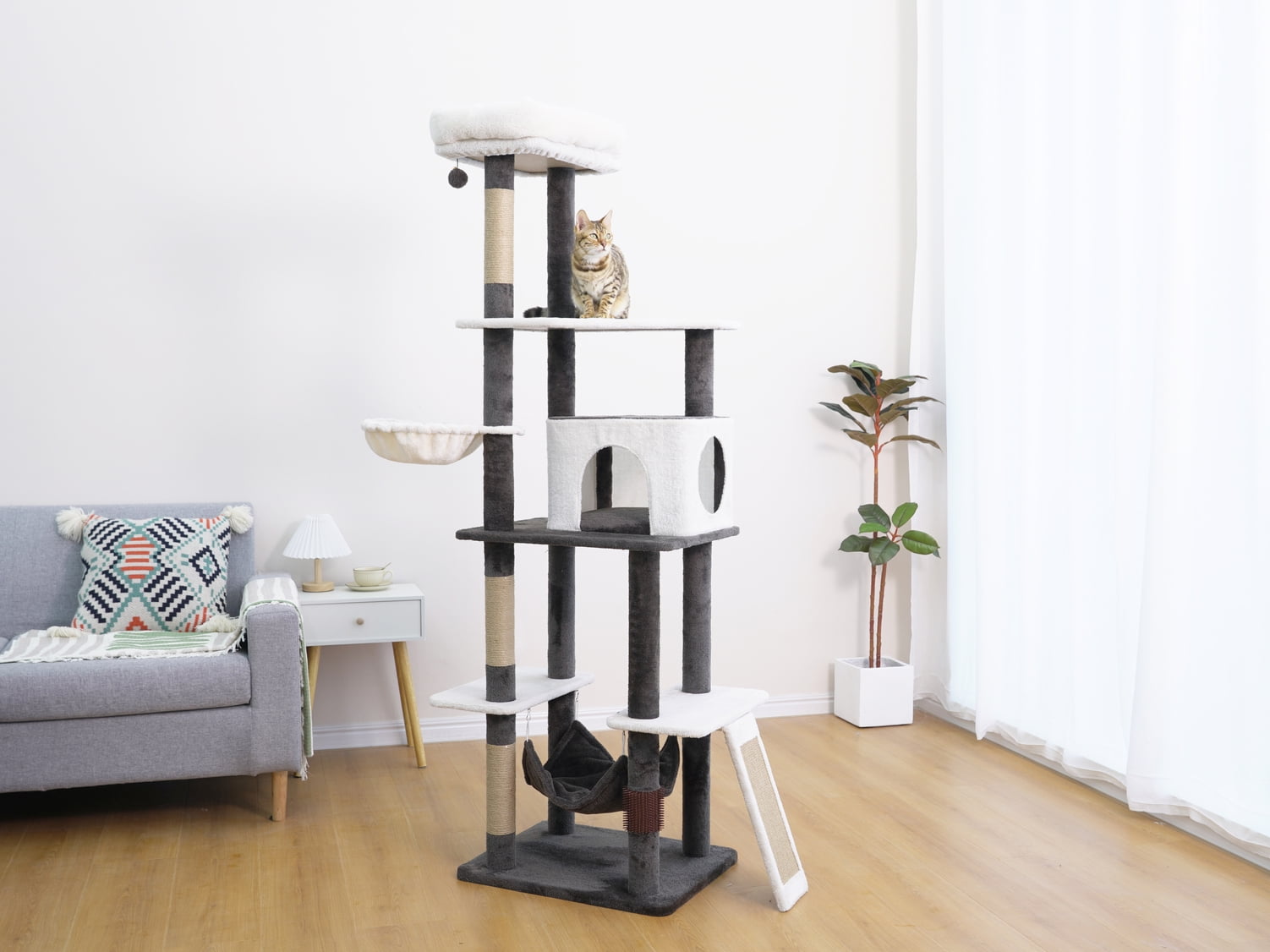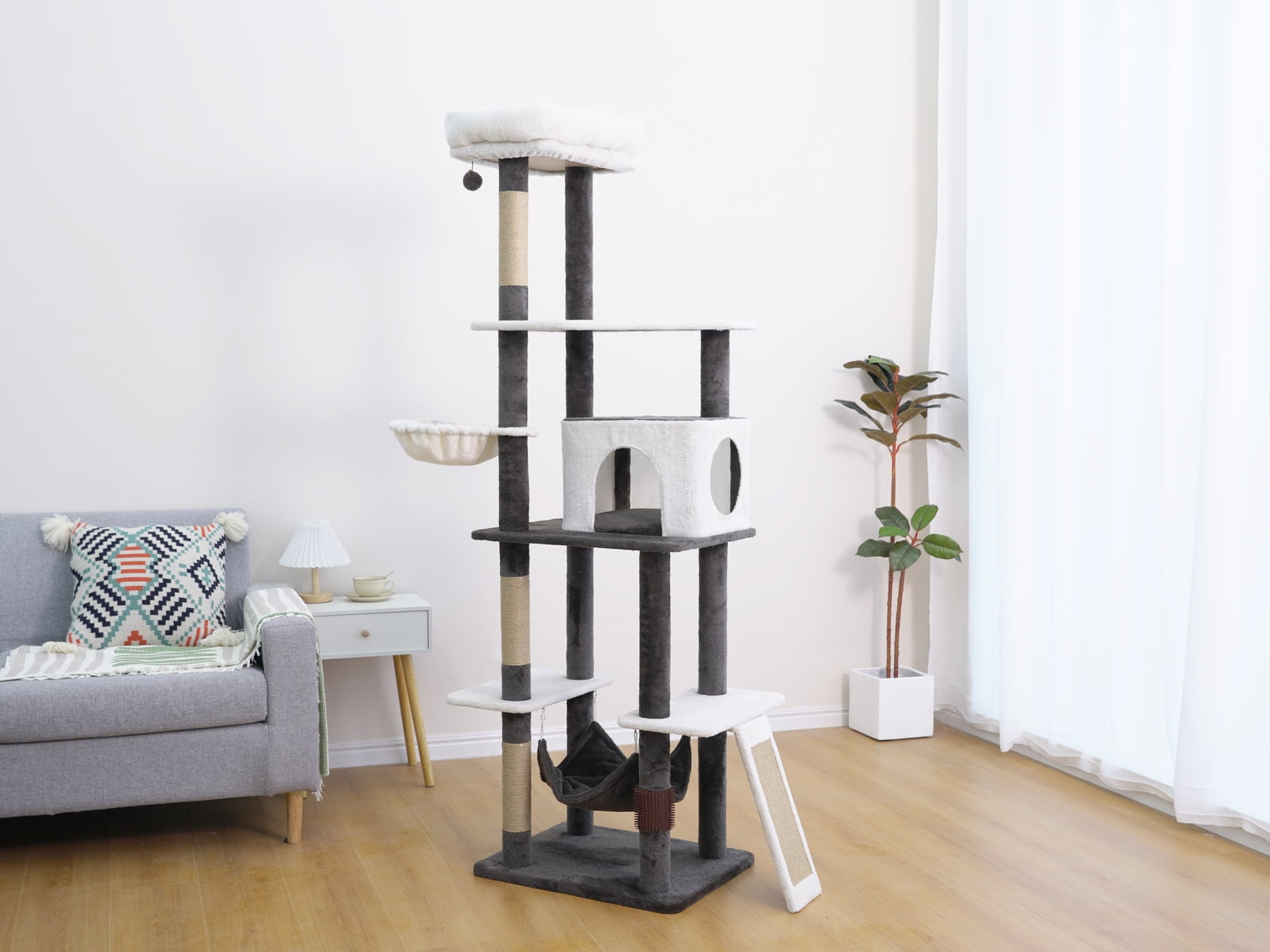 Vibrant Life 5-Level 72″ tall cat tree sanctuary A grand condo for tranquil solitude A plush sofa bed perch and two inviting hammocks for ultimate comfort Three jute scratching posts alongside a sisal mat for extensive scratching A playful teaser cat toy for stimulating activity