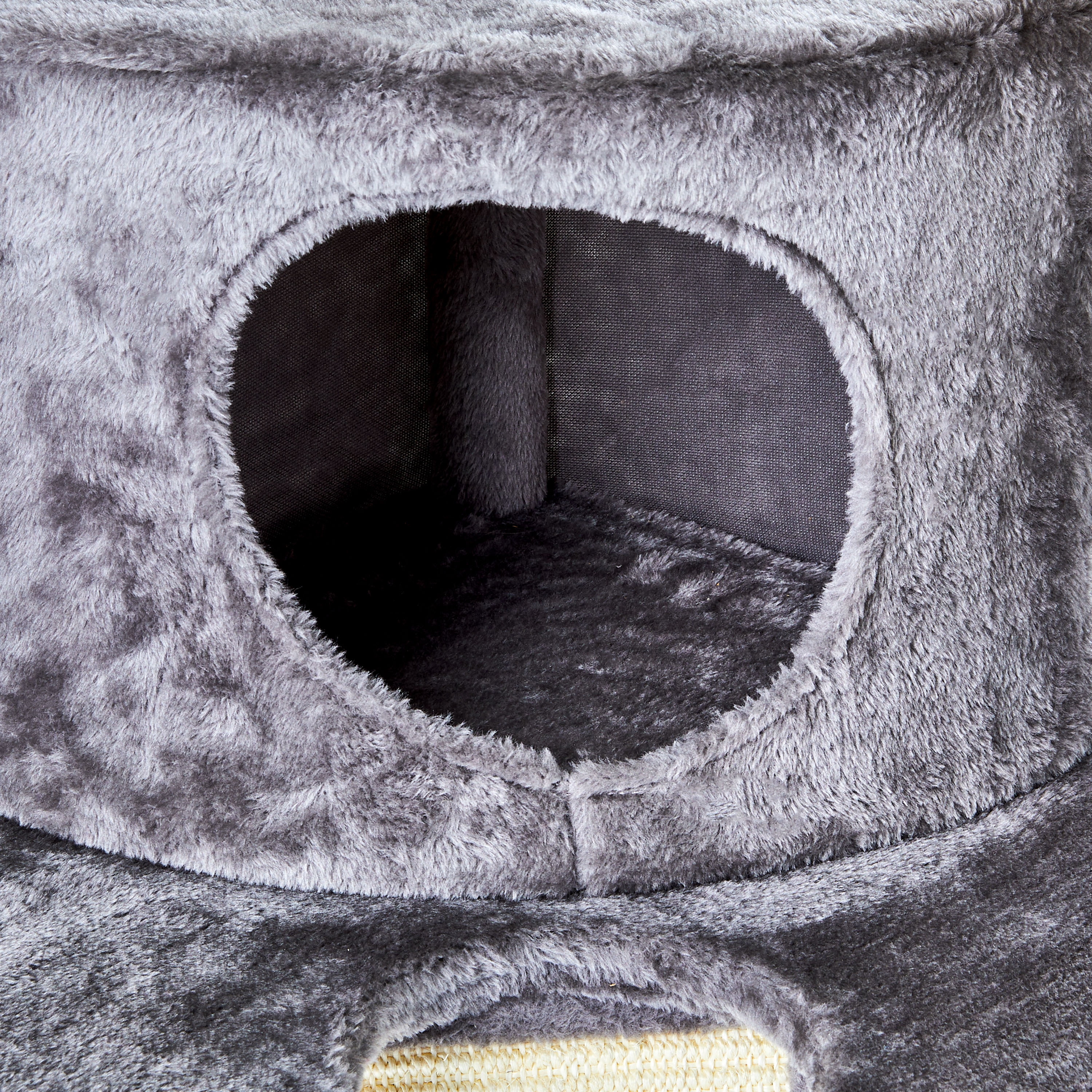 5 Levels of fun for jumping, climbing, scratching and lounging Faux-fur and sisal-wrapped posts Jump-through platform Plush-lined cat condo Sisal scratching ramp Two perches with hanging cat toys Soft gray plush & sisal