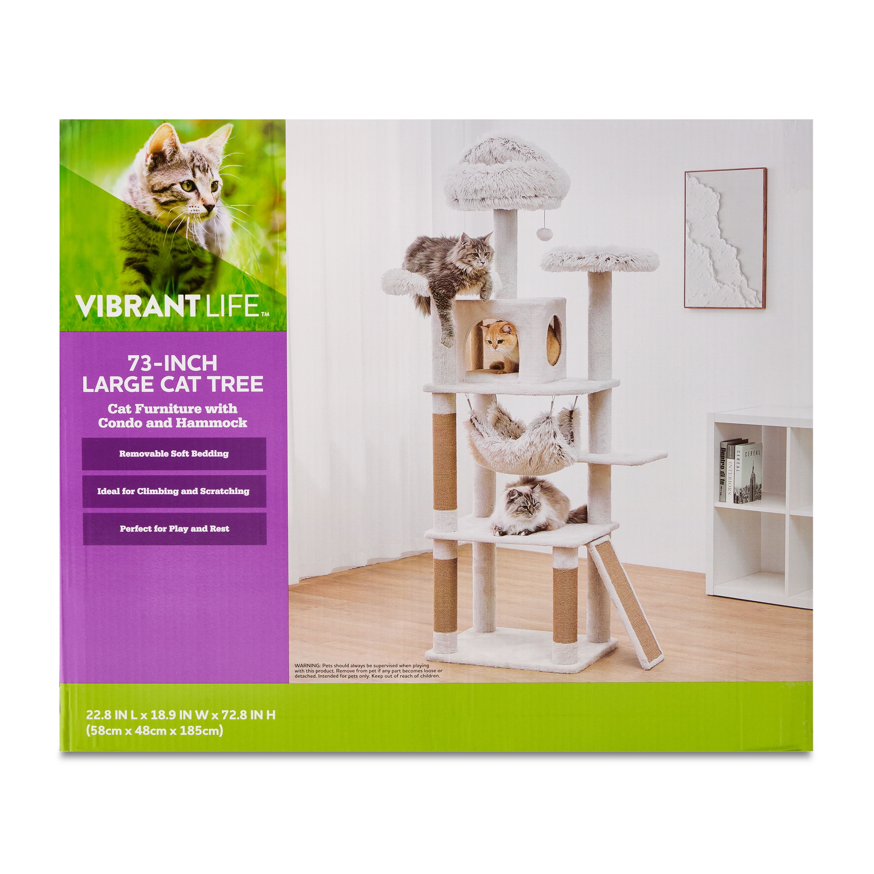 Vibrant Life Multi-Functional Cat Tree with Condo, Hammock and Scratching Posts, 72″ 72-inch tall multi-level cat tree with various platforms for climbing and lounging Includes a cozy enclosed condo for privacy and restful naps Soft hammock provides a comfortable suspended resting spot Durable sisal-wrapped posts encourage healthy scratching behavior Top perches are perfect for elevated lounging and bird-watching Neutral color palette complements most home décor Ideal for single or multi-cat households
