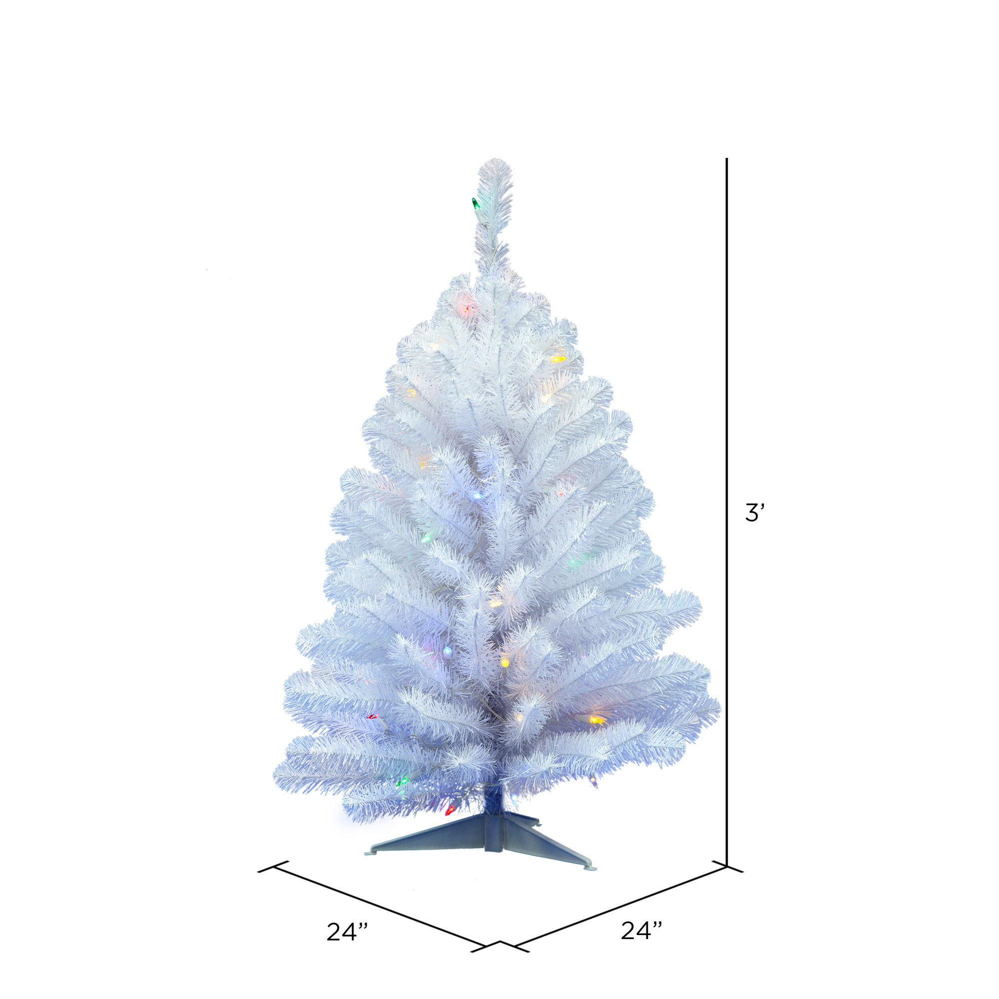 Vickerman 3′ x 24″ Crystal White Spruce Artificial Christmas Pencil Tree with 50 Italian LED Multi-colored Lights and 186 PVC Tips. A wonderful alternative to the traditional green Christmas tree, this brilliant tree comes prelit with Multi-Colored LED Mini Lights, has beautiful PVC tips on pull down branches, and a plastic tree stand is included.