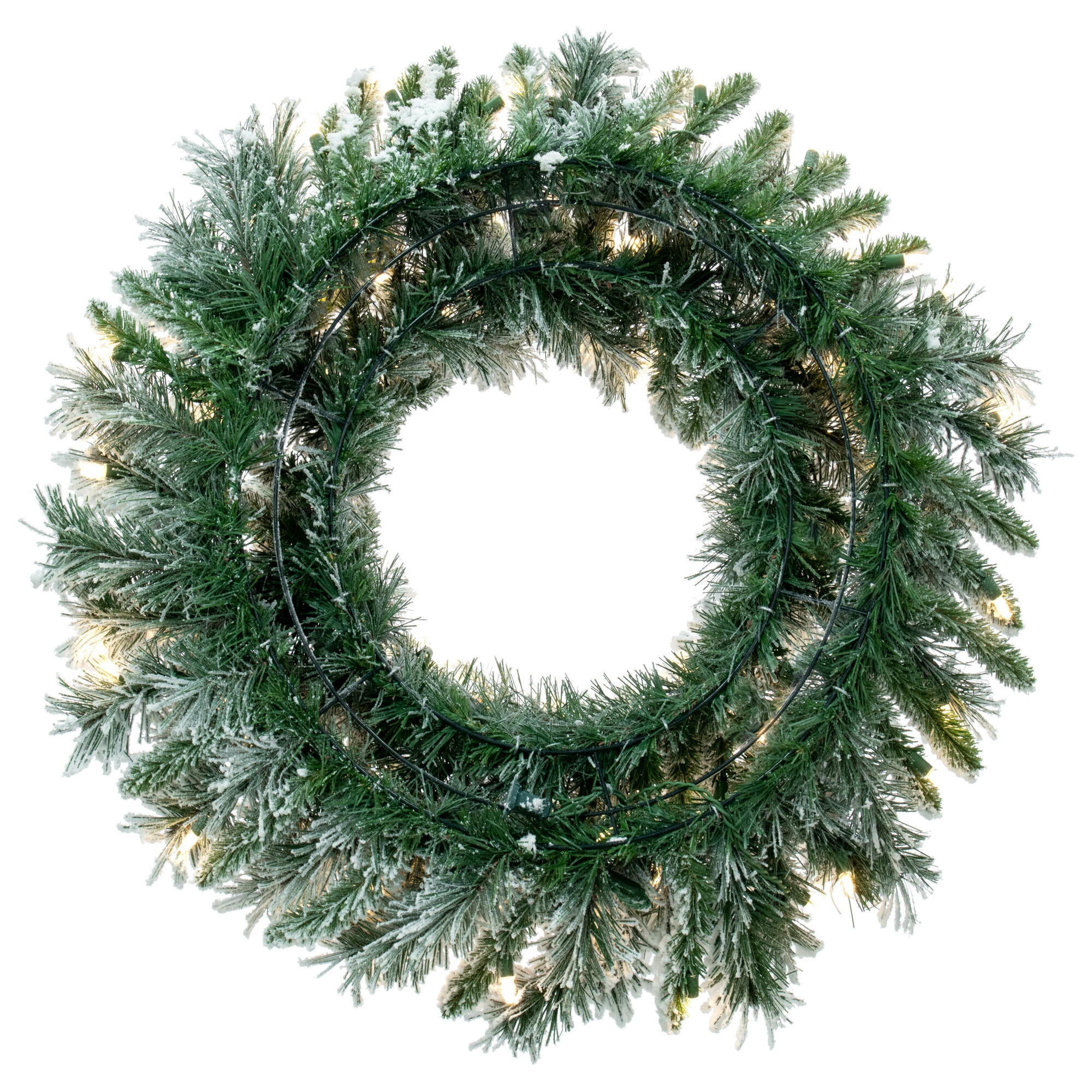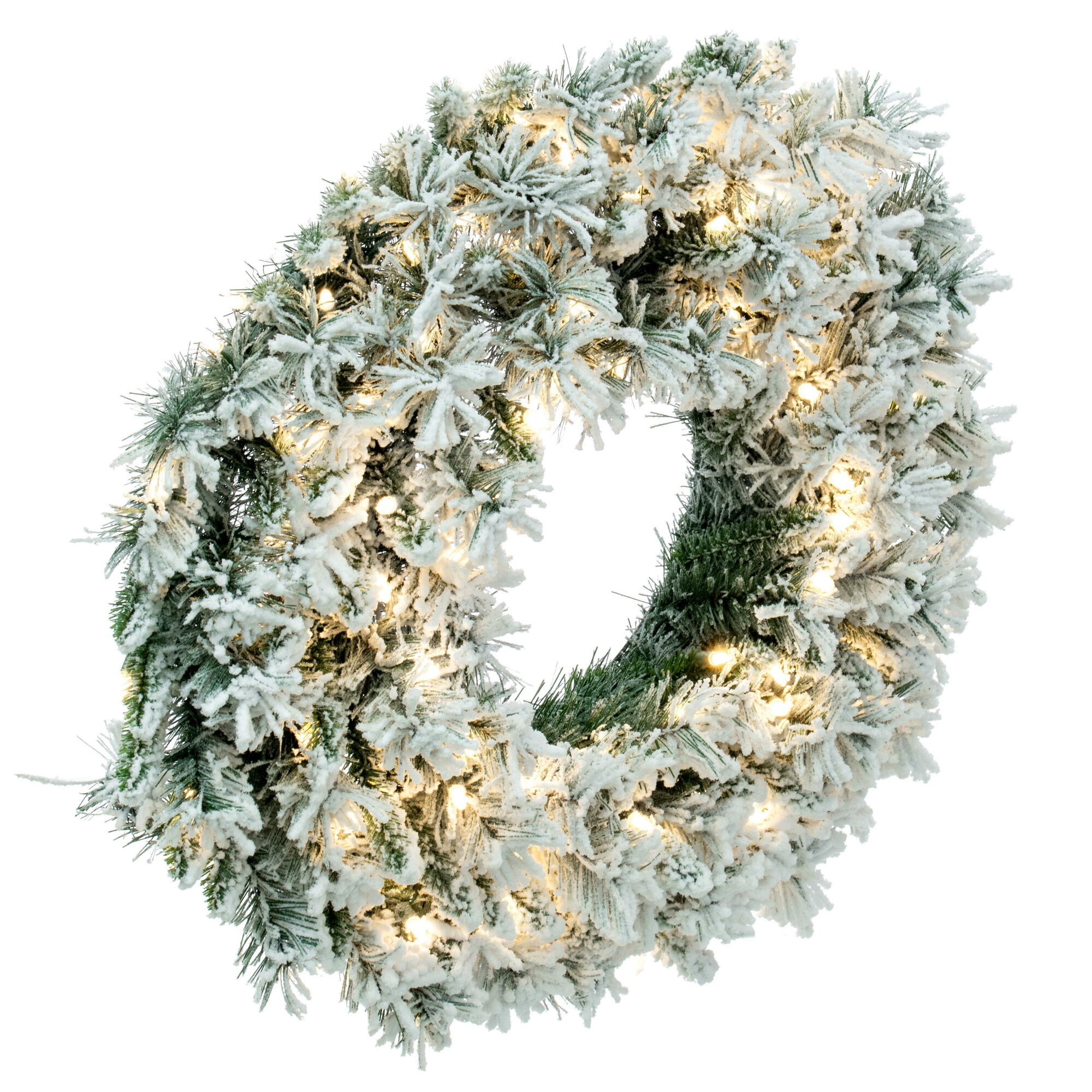 Vickerman 30″ Flocked Snow Ridge Artificial Christmas Wreath with 160 PVC Tips and 50 Warm White Single Mold LED Lights. Add some holiday spirit to your front door or mantle with this frosty wreath. This wreath comes prelit with Warm White LED Italian Mini Lights, features beautifully flocked PVC tips and measures 30″ across the diameter from the end of one tip to another. Runs on 120V AC