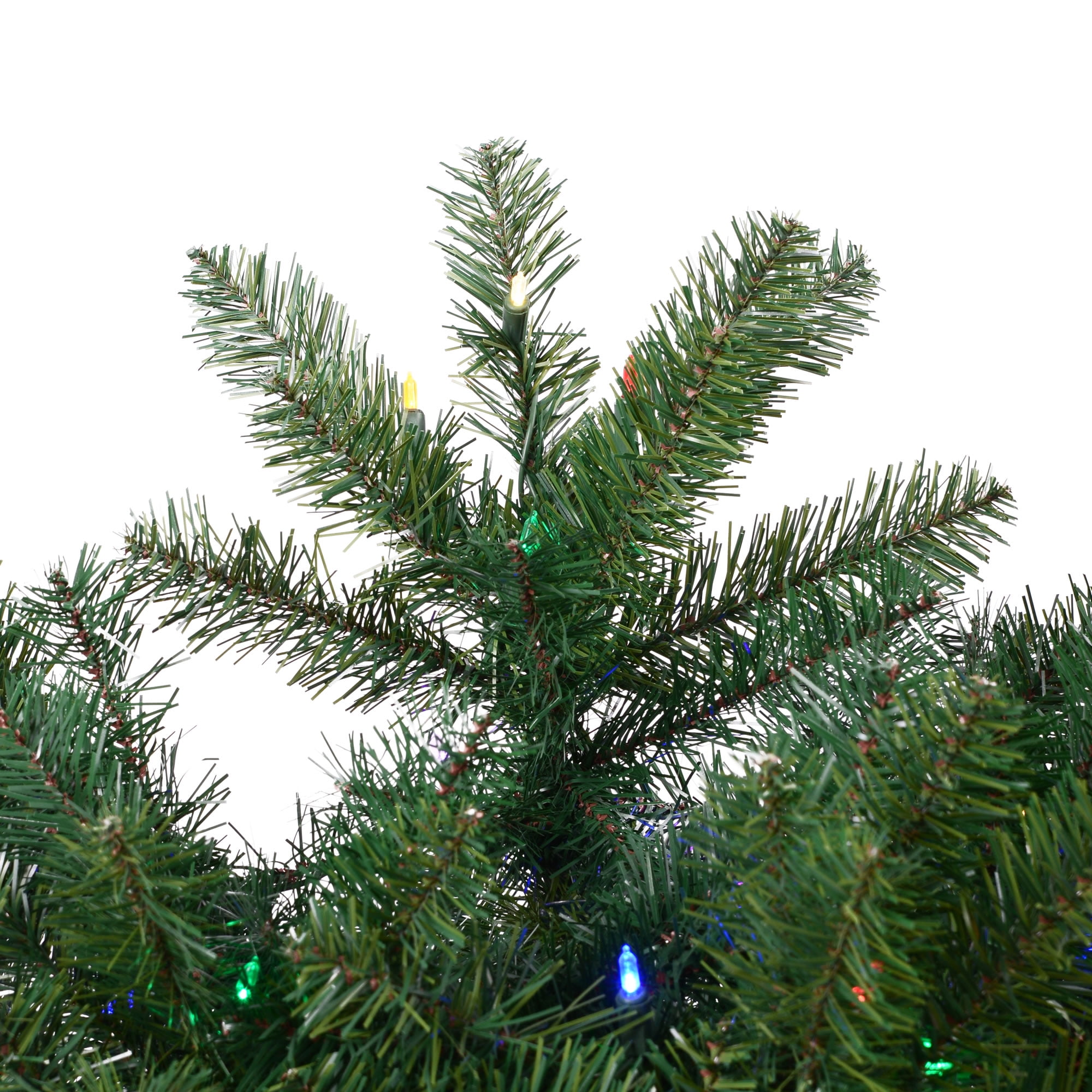 Vickerman 7.5′ x 36″ prelit Salem Pencil Pine Artificial Christmas Tree featuring 757 PVC tips and 400 Multi-colored Italian LED lights. This tree is made with beautiful green PVC tips on metal hinged branches and Comes with a metal tree stand.
