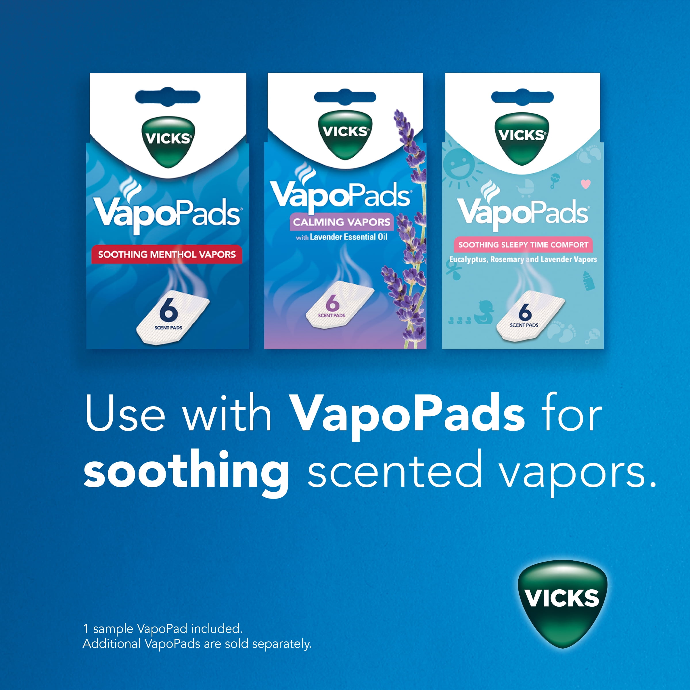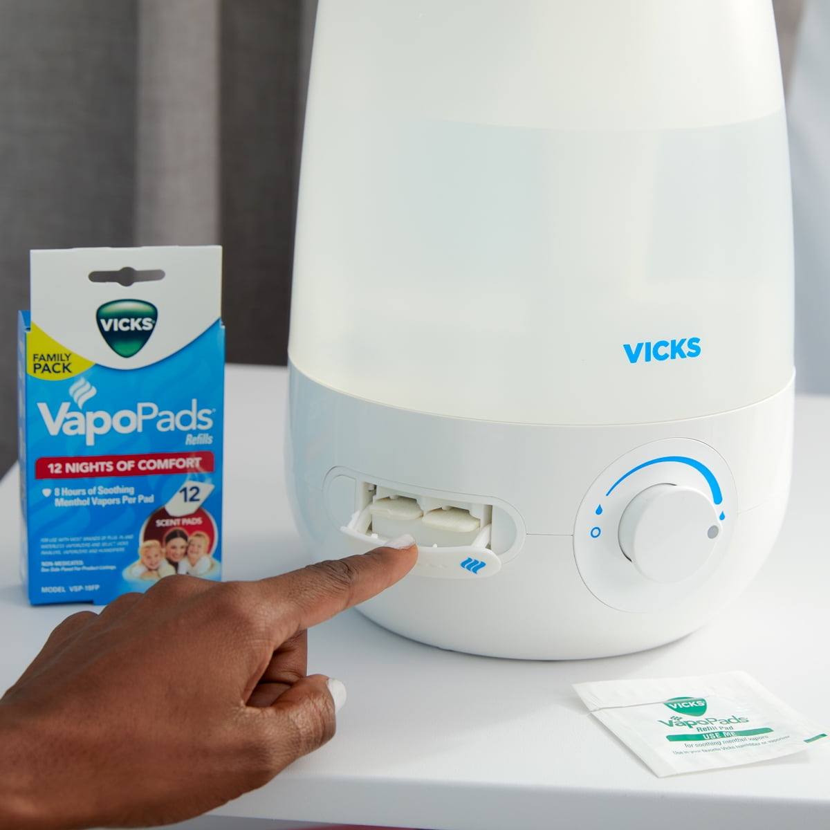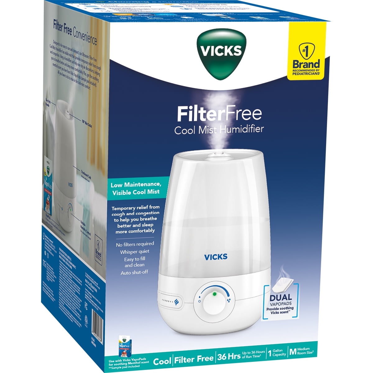 Designed to be easy to use and compact, our Vicks Ultrasonic Filter Free 1 Gallon Cool Mist Humidifier has a visible mist that provides temporary relief from cough and congestion. Using a humidifier can help ease dry air discomforts, helping you to breathe better and sleep more comfortably. The Vicks humidifier is genuinely easy to clean with a wide tank opening and removable mist nozzle. This Vicks appliance also offers a unique feature only found in Vicks Humidifiers, a scent pad door to accept Vicks VapoPads for added comfort. Vicks VapoPads come in a variety of scents – Menthol, Lavender, and a Sinus Relief formula (sample pad of the Menthol included). The Vicks humidifier will provide visible cool mist for up to 36 hours depending on the mist output setting. All you have to do is relax in the comforting environment created by the cool-mist & scent of Vicks VapoPads. Recommended for use in medium-sized rooms (400 sq ft. coverage area).