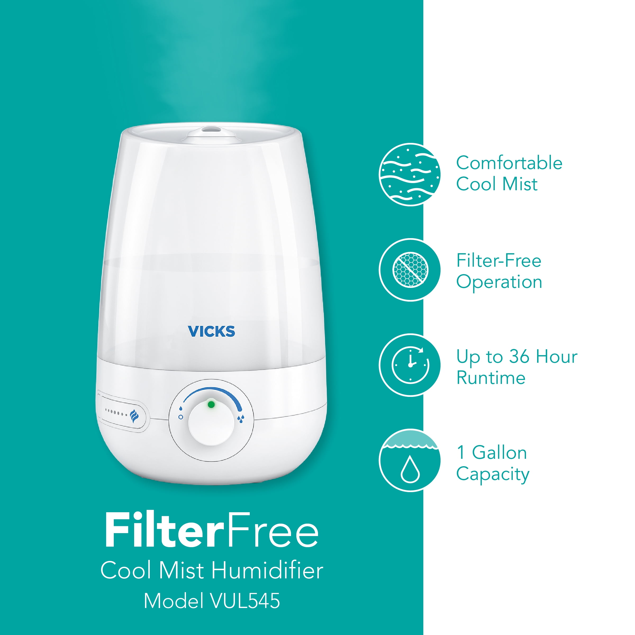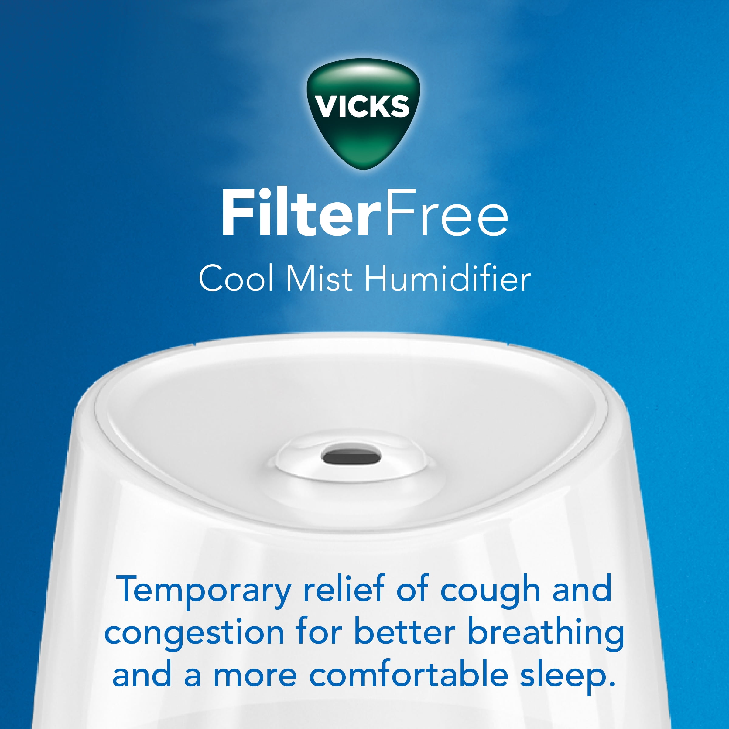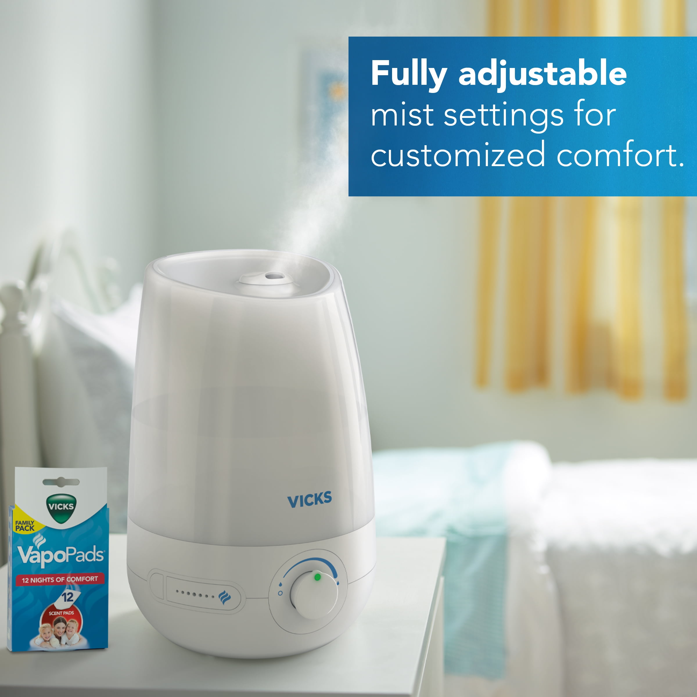 Soothing visible mist – Ultrasonic technology which is filter-free Wide tank for easy filling and cleaning Use Vicks VapoPads for added comfort & relief Whisper quiet operation Variable humidity control for customized output Auto shut-off Up to 36 hour runtime Perfect for a bedroom of nursery Coverage area: medium-sized rooms up to 400 sq ft