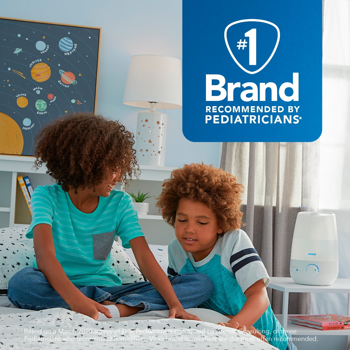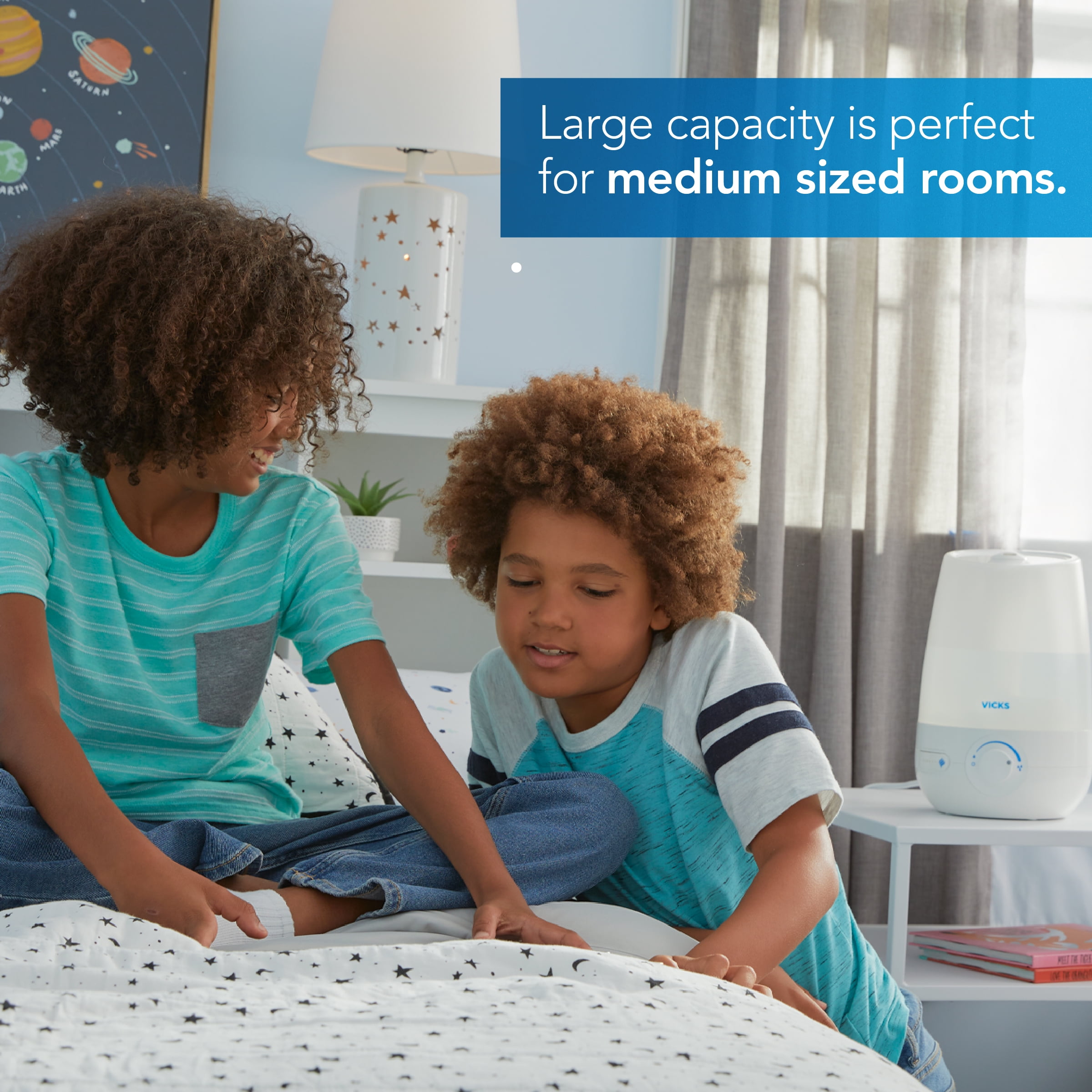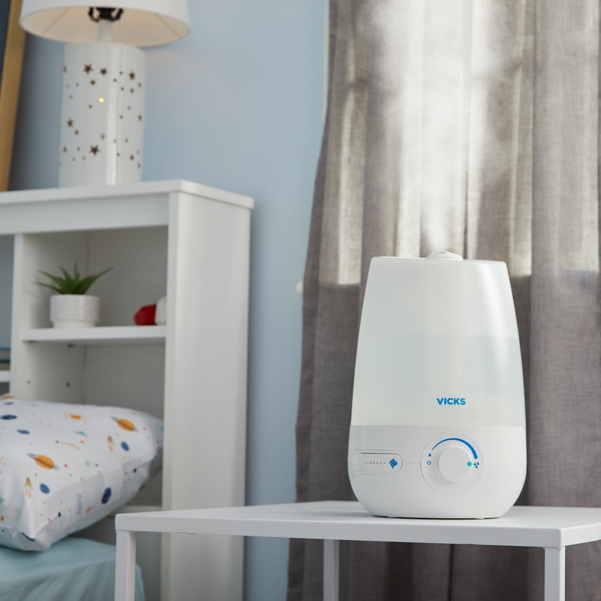 Soothing visible mist – Ultrasonic technology which is filter-free Wide tank for easy filling and cleaning Use Vicks VapoPads for added comfort & relief Whisper quiet operation Variable humidity control for customized output Auto shut-off Up to 36 hour runtime Perfect for a bedroom of nursery Coverage area: medium-sized rooms up to 400 sq ft