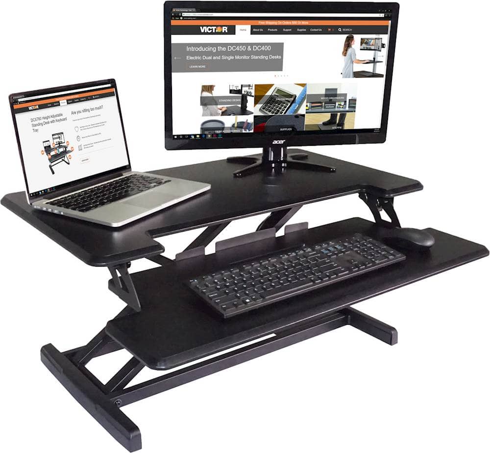 Maintain good posture at work with this Victor standing desk. The gas spring system and easy-to-use lever let you quickly return to a sitting position whenever you need a change, and the two-tiered design holds your computer, keyboard and supplies. The wood construction of this Victor standing desk has a sleek black finish for a professional appearance.