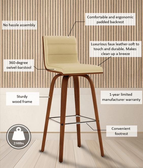 Stylish Swivel Barstool: The Vienna bar stool features a 360-degree swivel function, perfect for your kitchen island, counter, or bar table, ensuring effortless mobility and engagement. Mid-Century Modern Design: Elegant walnut or black wood finish pairs with plush faux leather upholstery for a timeless, sophisticated look. Comfortable & Supportive: High-density foam padding, a padded backrest, and a sturdy footrest provide ergonomic support for long-lasting comfort. Height Options for Any Space: Available in 26” counter height or 30” bar height, making it a versatile fit for kitchen islands, peninsulas, and pub tables. Durable & Easy to Maintain: Built with a sturdy wooden frame, steel footrest, and high-grade faux leather that is easy to clean and designed to last.