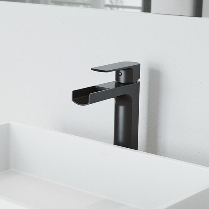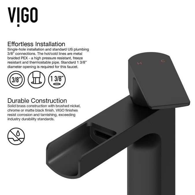 Take your daily ritual of using the bathroom sink faucet to the next level with the VIGO Amada vessel bathroom faucet in matte black. Statuesque in height to accommodate various vessel bathroom sinks, this sink faucet for the bathroom is incredibly versatile. It fits a variety of bathroom styles, from modern to traditional to contemporary and more. This waterfall faucet for the bathroom sink features a semi-open spout that creates a soothing waterfall stream for your vessel sink. This black bathroom faucet for the sink is made from solid brass construction and outfitted in a 7-layer plated finish to resist corrosion, tarnish, and rust. Its single hole installation is made incredibly easy with standard US plumbing 3/8 inch connections and metal-braided PEX hot/cold lines, which are thermostable as well as freeze and high-pressure resistant. This model has a ceramic disc valve that has been tested for 500,000 uses, further enhancing its durability. With a single handle operating both the water and temperature controls, this vessel bathroom sink faucet is ADA compliant. This faucet conserves water and meets WaterSense EPA compliance requirements, as well as CEC (Title 20) compliance regulations. A built-in drip-stop feature in the back of the spout to prevent leaks when the faucet is in the off position further enhances all that the Amada has to offer.