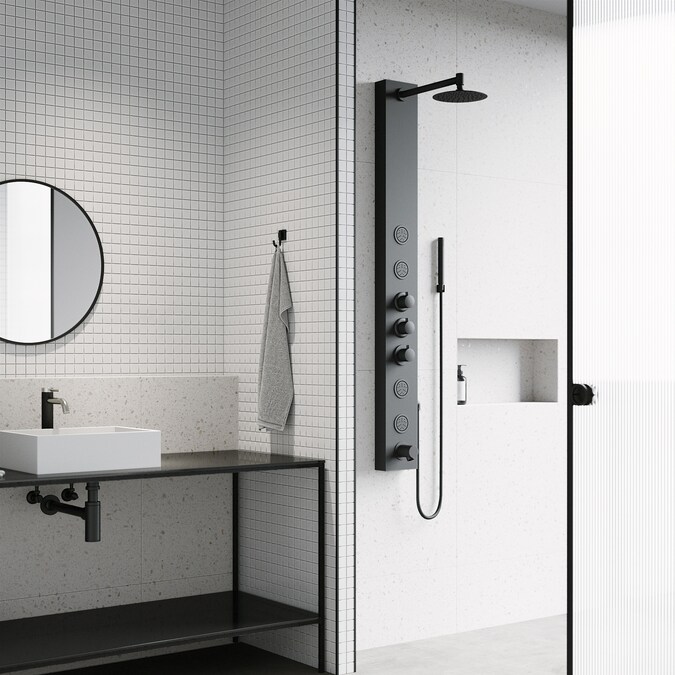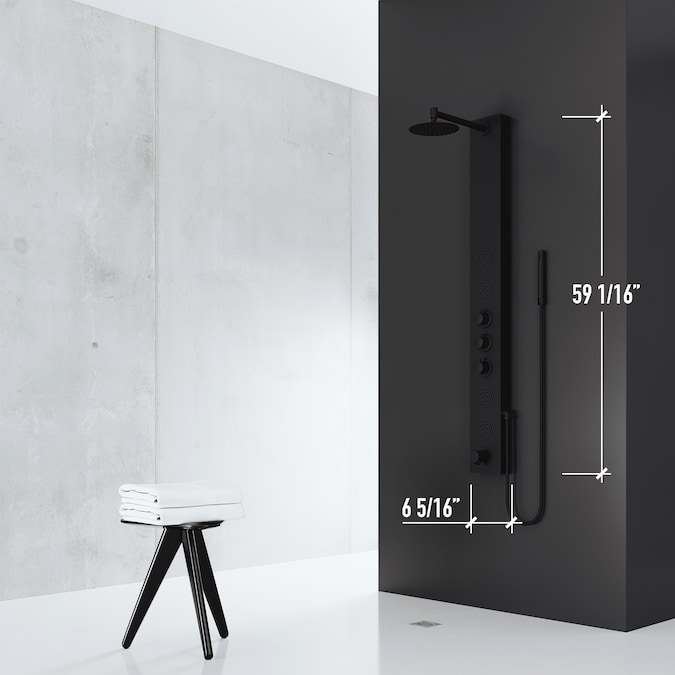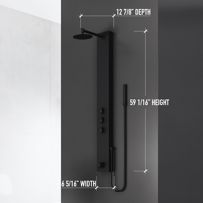 - DIMENSIONS: Measuring 59-in H X 6-in W, this wall-mounted matte black shower system stands out with its contemporary industrial aesthetic, instantly becoming the focal point of any bathroom