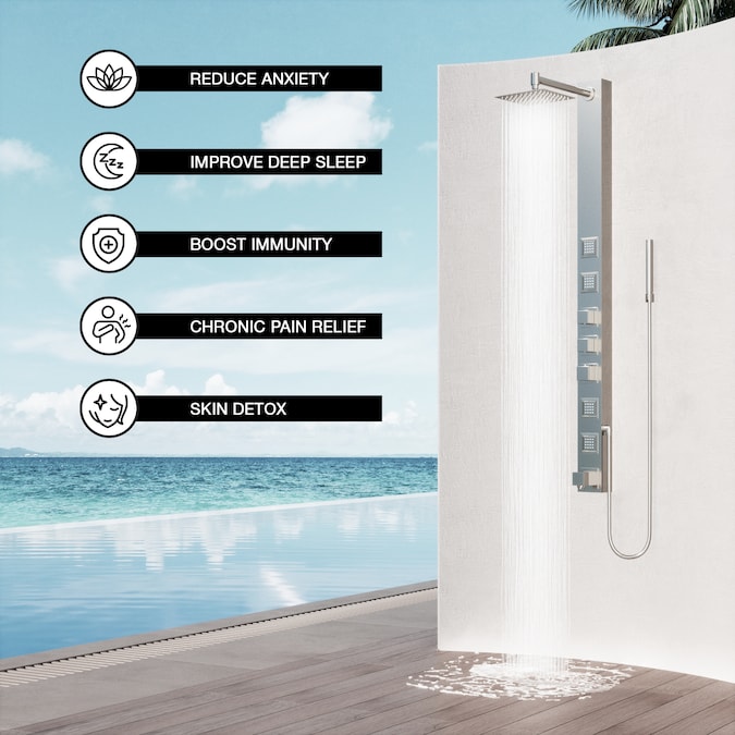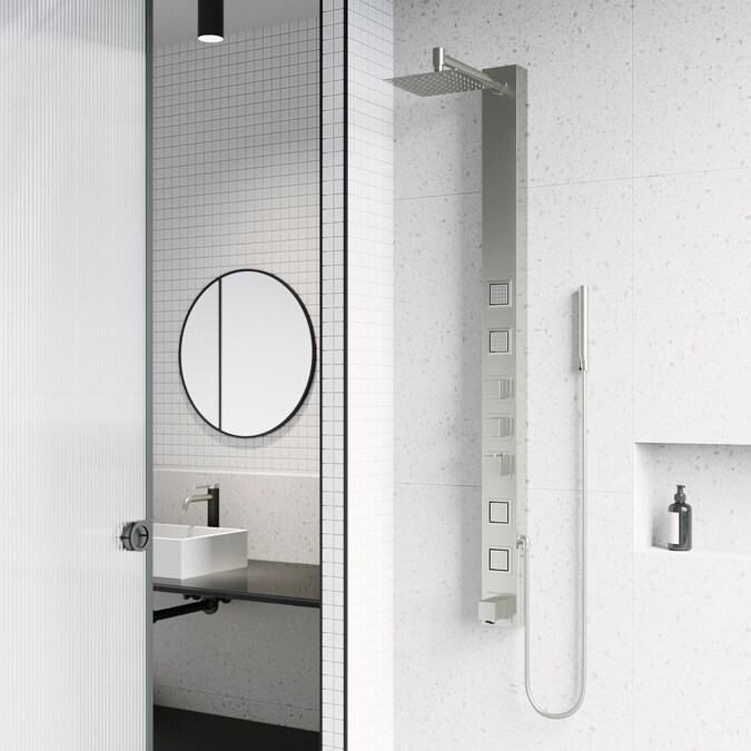 - DIMENSIONS: Measuring 58-in H X 4-in W, this wall-mounted stainless steel shower system stands out with its contemporary industrial aesthetic, instantly becoming the focal point of any bathroom