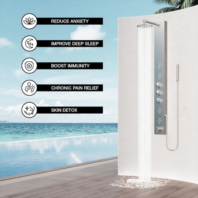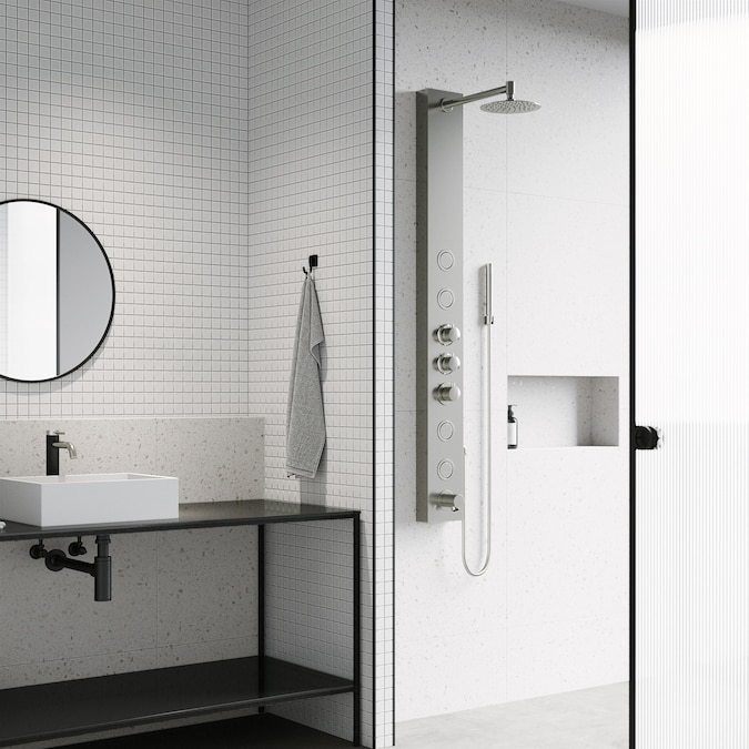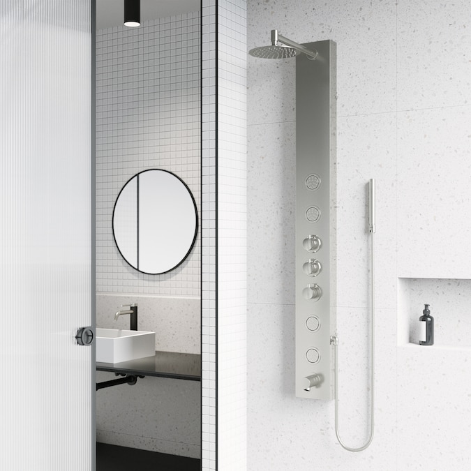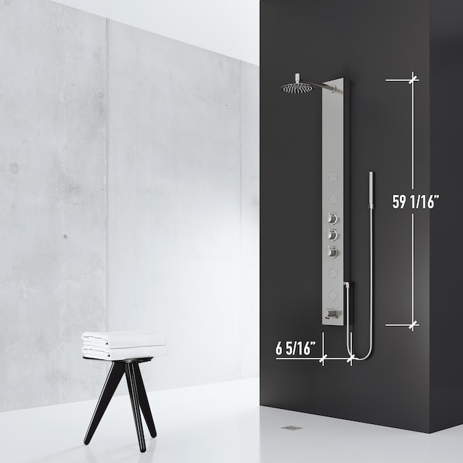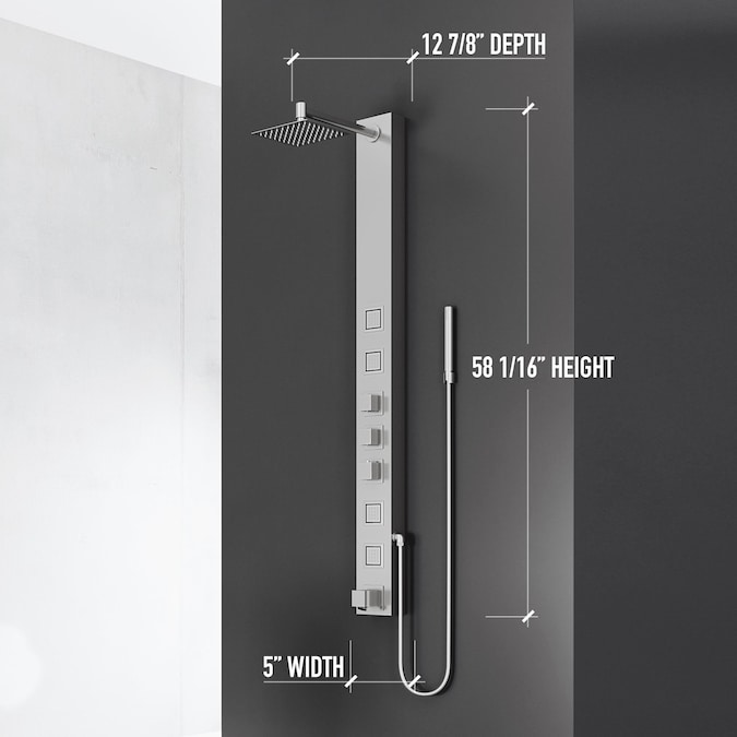 - DIMENSIONS: Measuring 59-in H X 6-in W, this wall-mounted stainless steel shower system stands out with its contemporary industrial aesthetic, instantly becoming the focal point of any bathroom