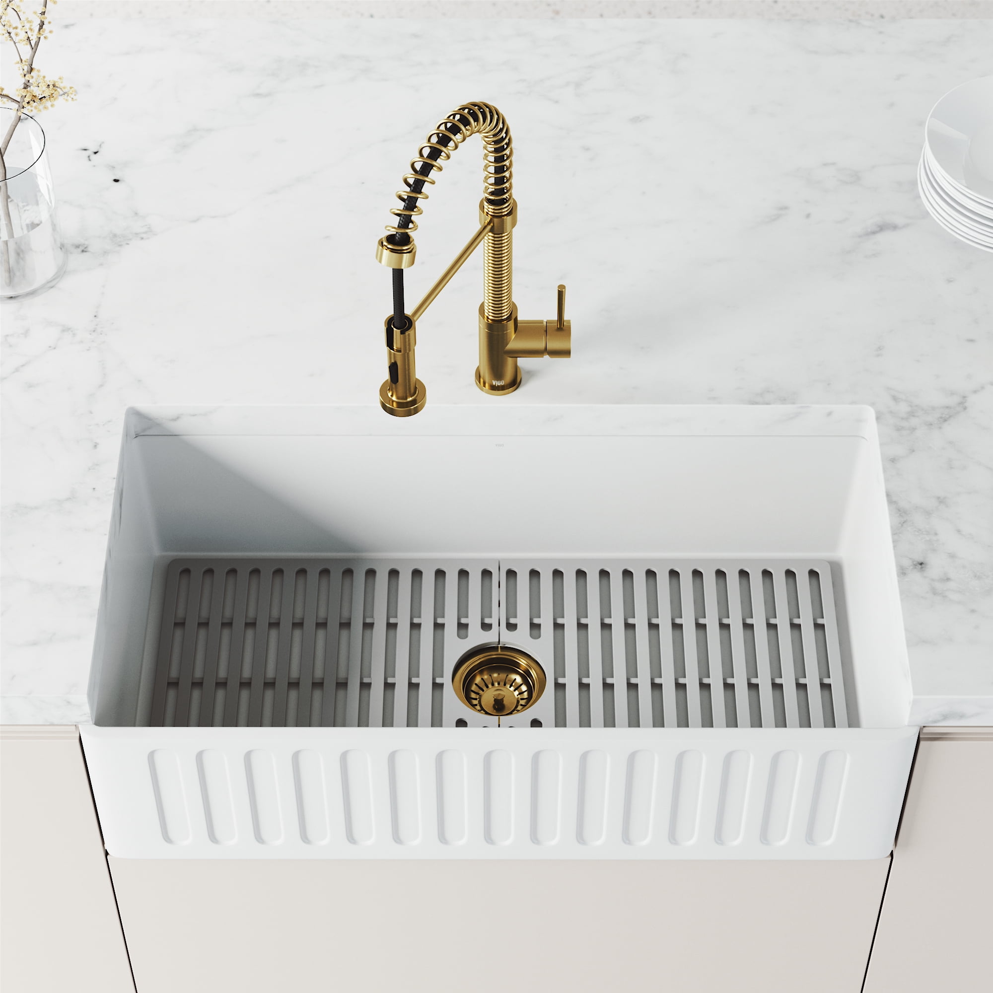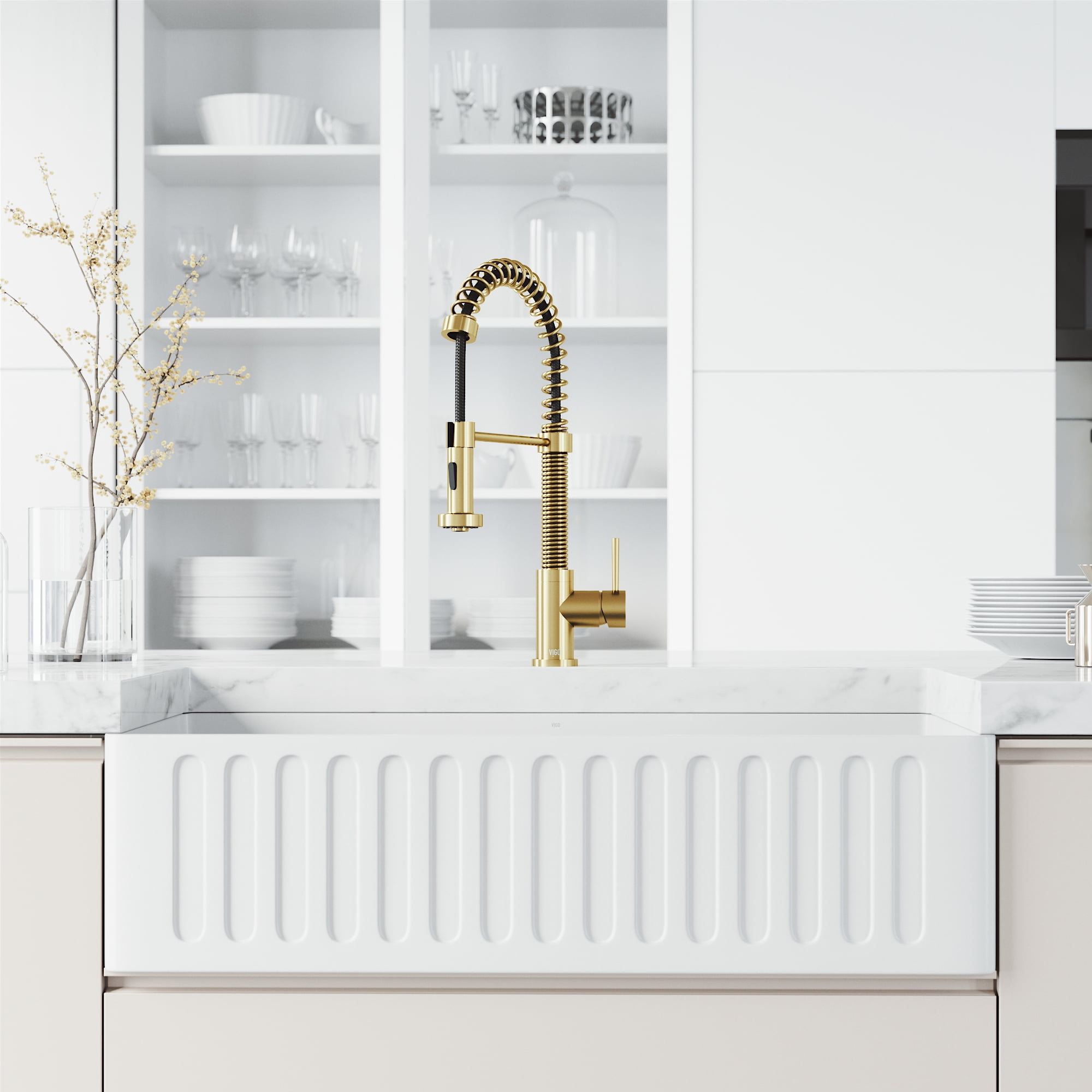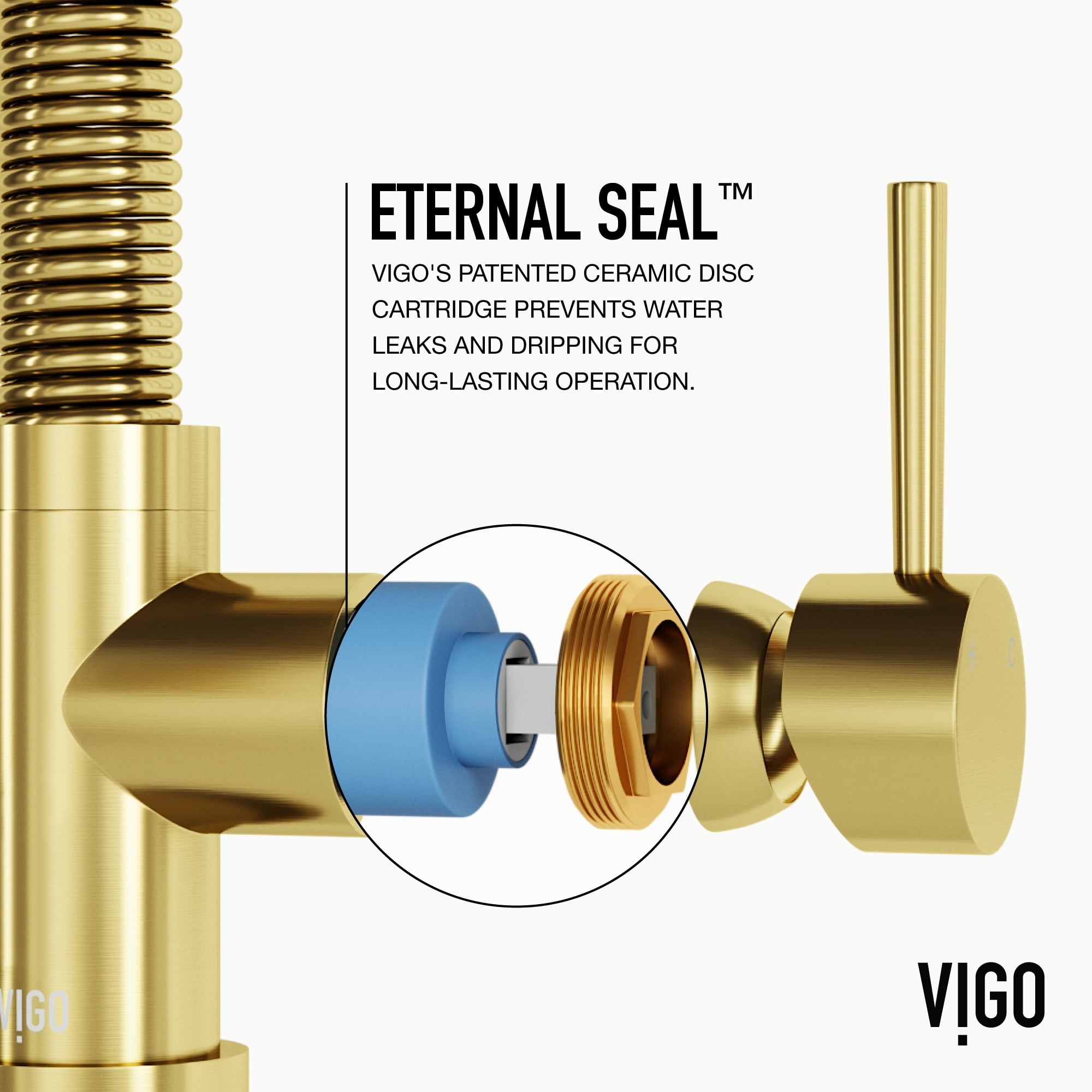 PERFORMANCE SPOUT TM: eco-friendly spout conserves water and reduces your water bill without sacrificing water pressure SWIVEL SPOUT TM: a 360-degree rotating faucet provides exceptional maneuverability making cooking and cleaning in the kitchen effortless ETERNAL SEAL TM: an expertly tested ceramic cartridge that prevents leaks and dripping FINISH PLATED TM: ensures the hardware finish is consistent throughout and guaranteed to match all other VIGO products DUAL-ACTION SPRAY HEAD: the multifunctional pull-down sprayer delivers an aerated flow of water or a powerful spray with the click of a button SECURE DOCKING: Sprayer Docking Station pulls the sprayer into place to secure it when not in use SINGLE HANDLE LEVER: one lever effortlessly controls the water pressure and temperature EASY TO CLEAN: the nozzle resists mineral buildup, making this kitchen faucet easy to clean EXTENDABLE HOSE: A retractable hose of up to 30 inches features a nylon braided hose for additional ease of use EXCEPTIONAL HARDWARE: Sedal ceramic disc valve has been tested for 500,000 uses UNMATCHED DURABILITY: solid brass construction and premium quality parts make this kitchen faucet tough, strong, and easy to clean PREMIUM FINISH: VIGO’s 7-layer coating ensures long-lasting brilliance that resists rust, corrosion and tarnish