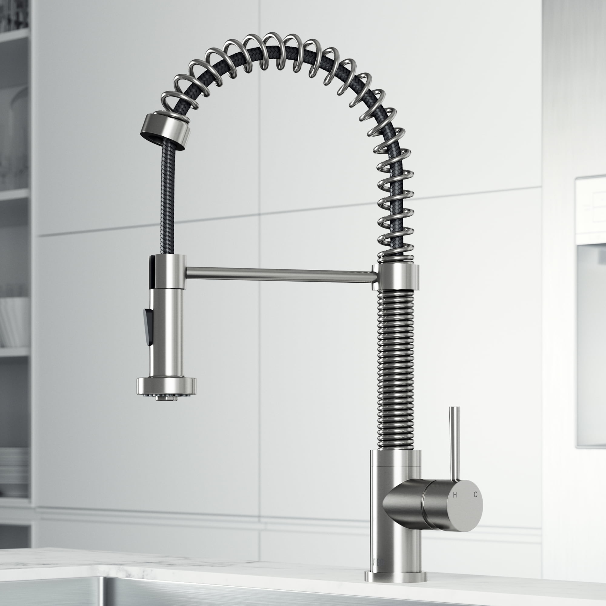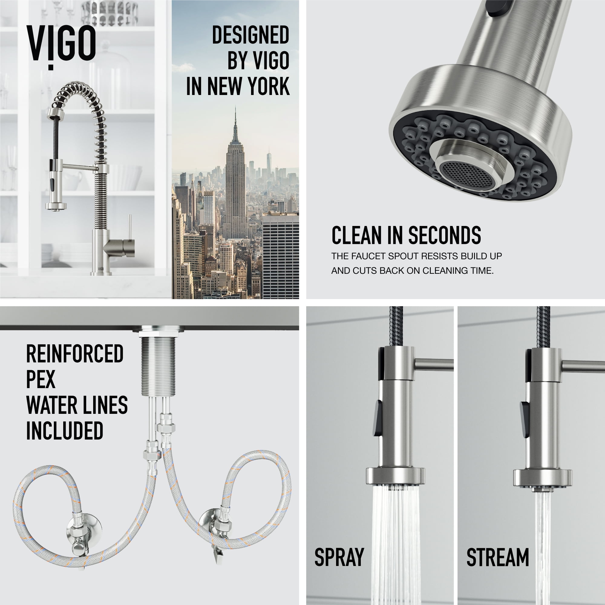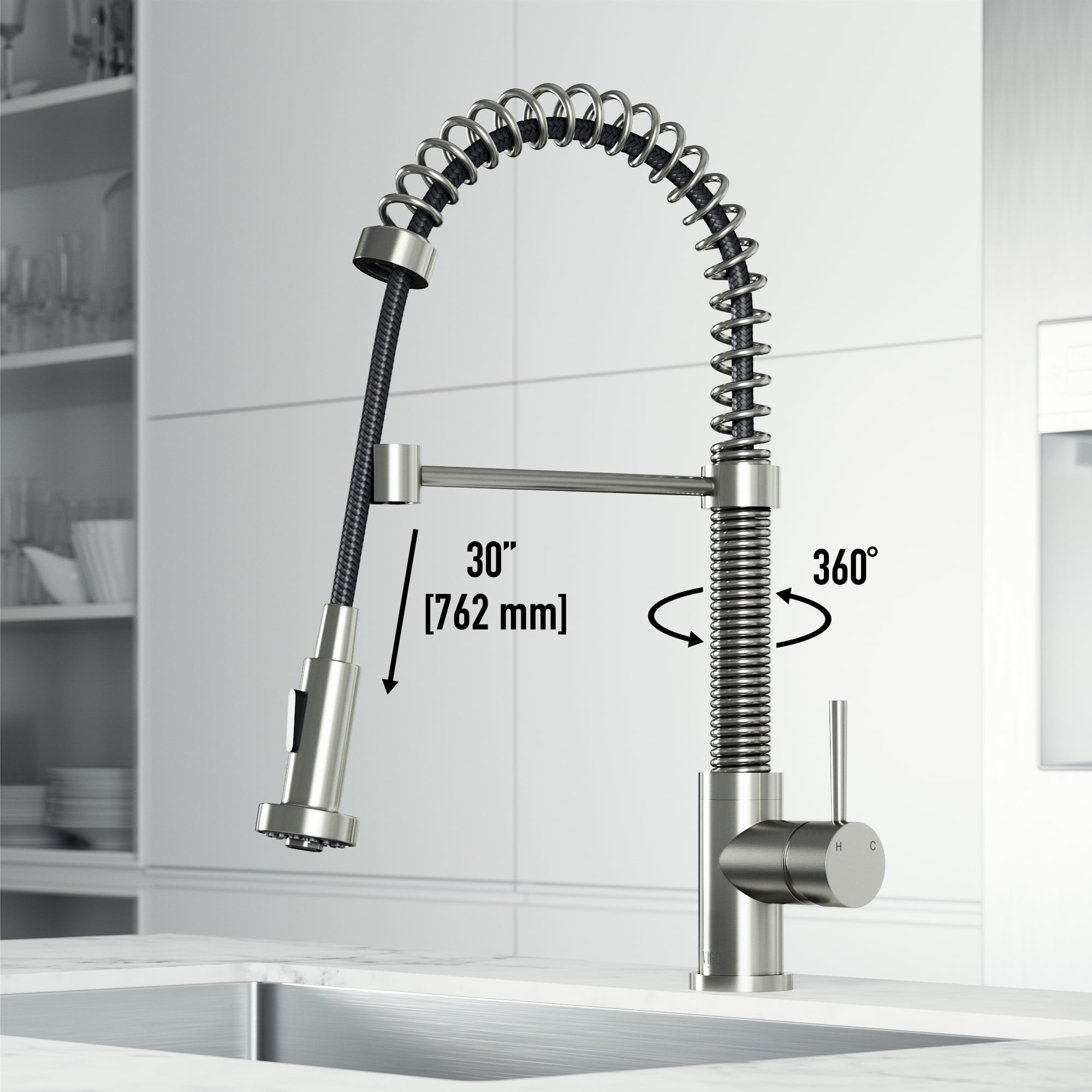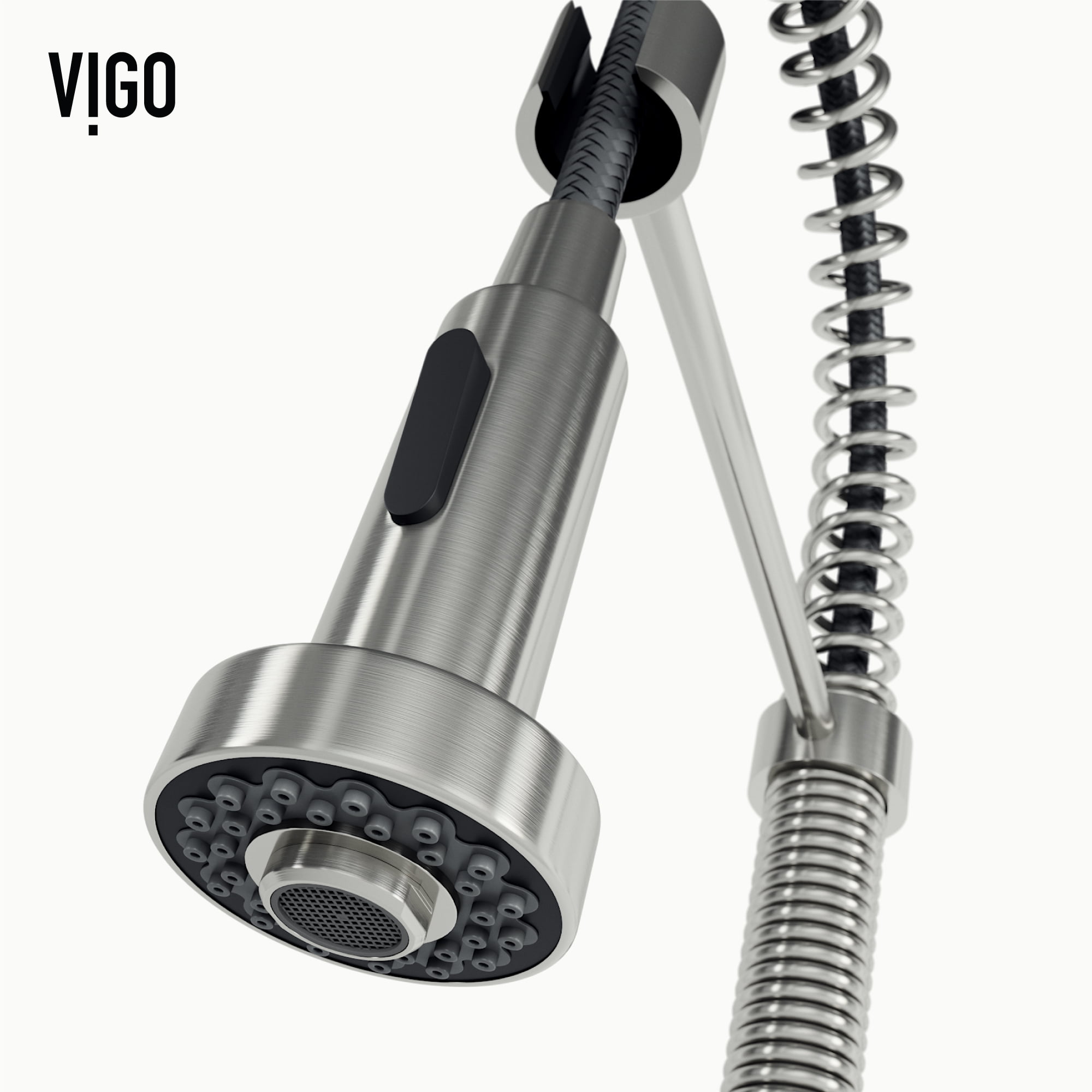 PERFORMANCE SPOUT TM: eco-friendly spout conserves water and reduces your water bill without sacrificing water pressure SWIVEL SPOUT TM: a 360-degree rotating faucet provides exceptional maneuverability making cooking and cleaning in the kitchen effortless ETERNAL SEAL TM: an expertly tested ceramic cartridge that prevents leaks and dripping FINISH PLATED TM: ensures the hardware finish is consistent throughout and guaranteed to match all other VIGO products DUAL-ACTION SPRAY HEAD: the multifunctional pull-down sprayer delivers an aerated flow of water or a powerful spray with the click of a button SECURE DOCKING: Sprayer Docking Station pulls the sprayer into place to secure it when not in use SINGLE HANDLE LEVER: one lever effortlessly controls the water pressure and temperature EASY TO CLEAN: the nozzle resists mineral buildup, making this kitchen faucet easy to clean EXTENDABLE HOSE: A retractable hose of up to 30 inches features a nylon braided hose for additional ease of use EXCEPTIONAL HARDWARE: Sedal ceramic disc valve has been tested for 500,000 uses UNMATCHED DURABILITY: solid brass construction and premium quality parts make this kitchen faucet tough, strong, and easy to clean PREMIUM FINISH: VIGO’s 7-layer coating ensures long-lasting brilliance that resists rust, corrosion and tarnish