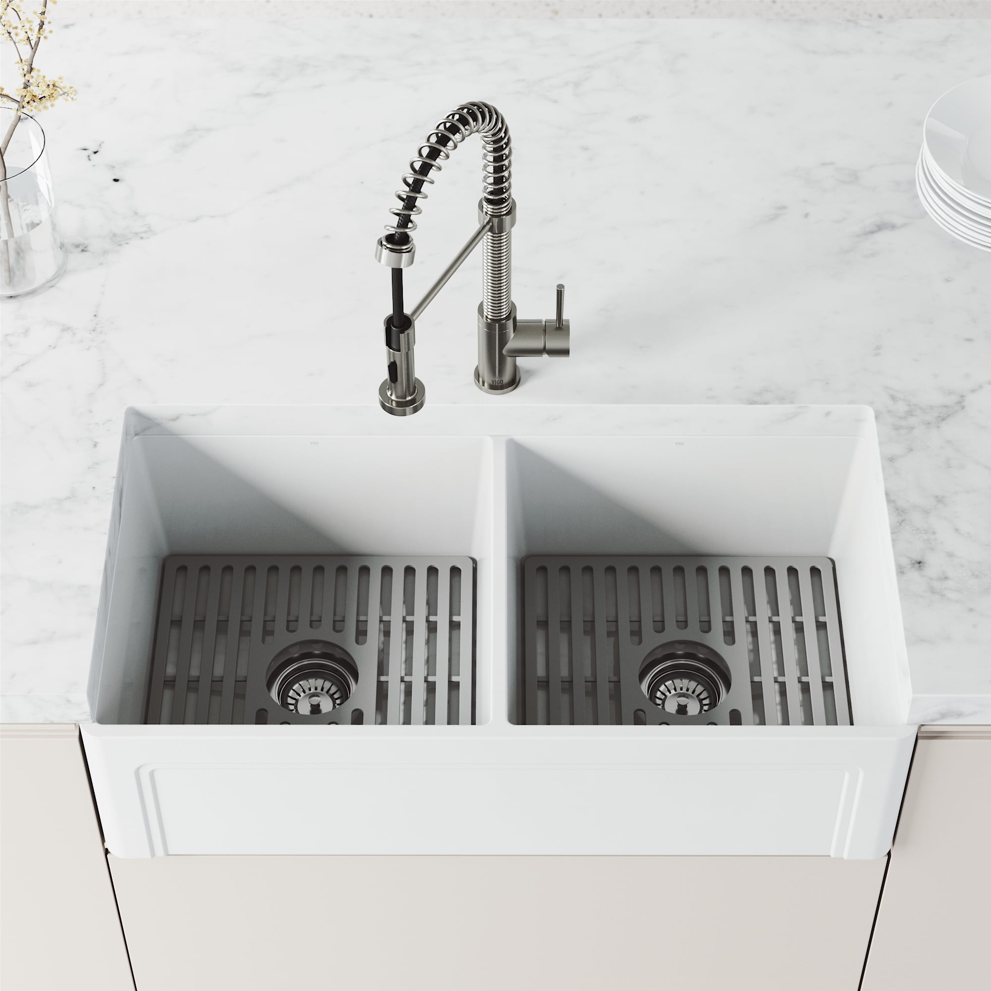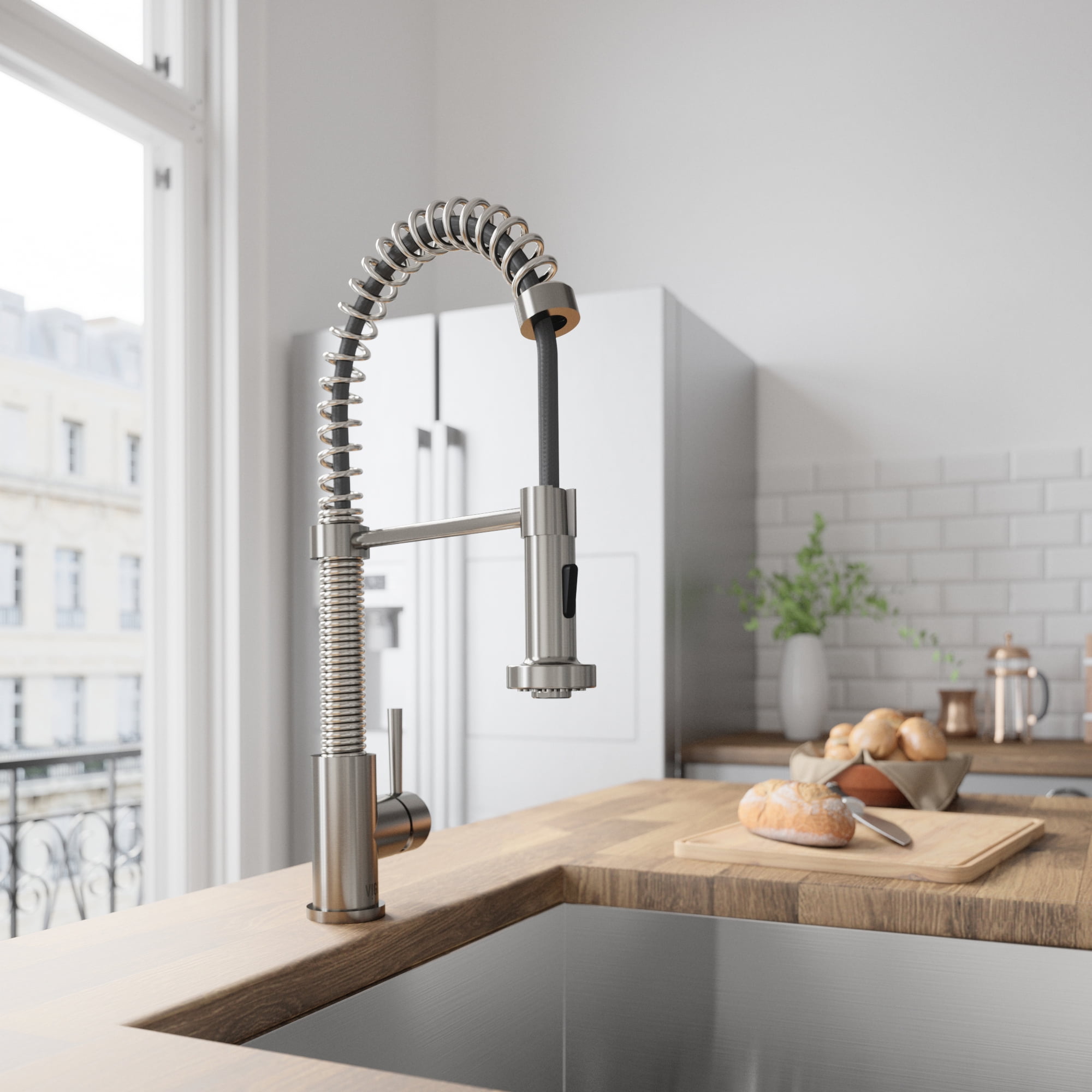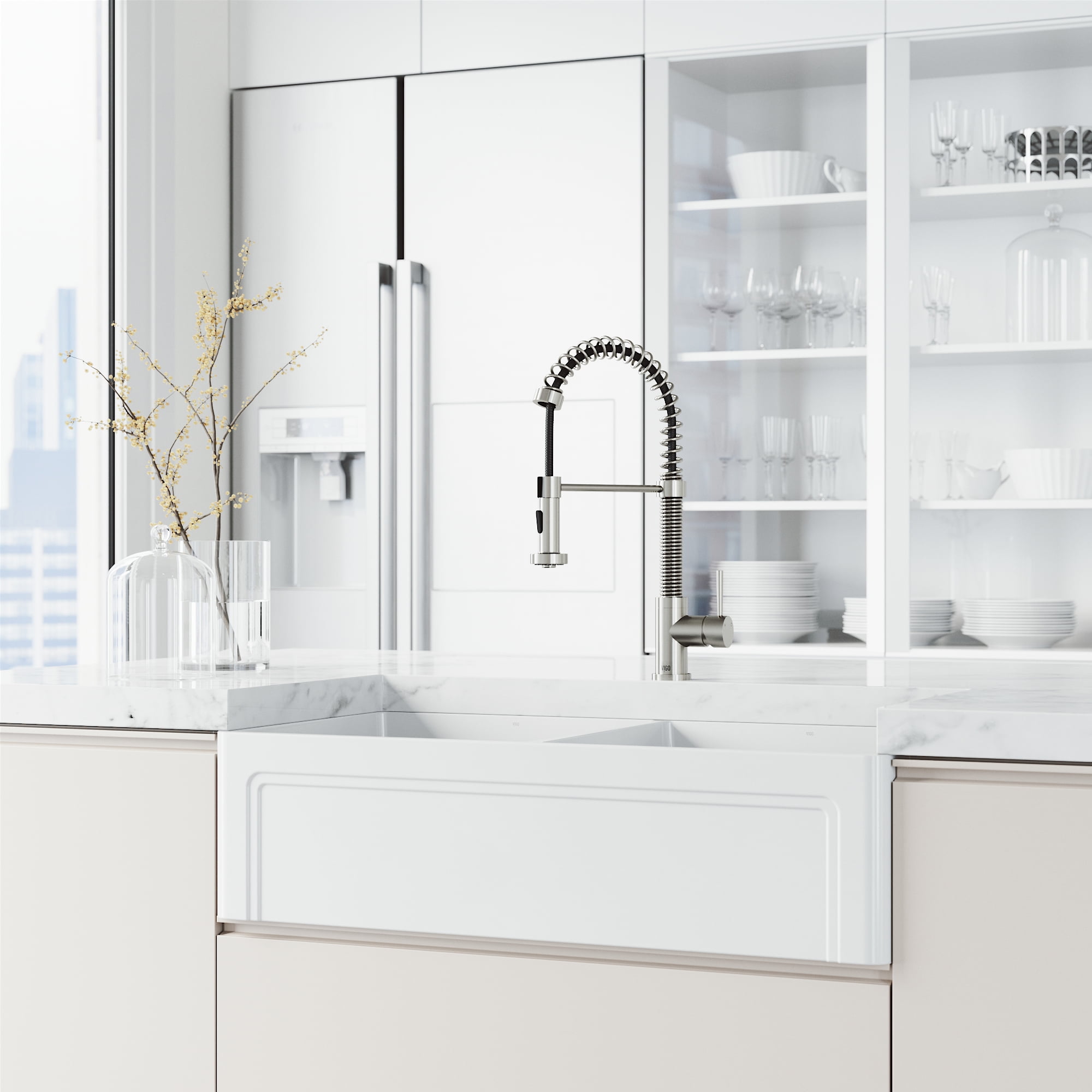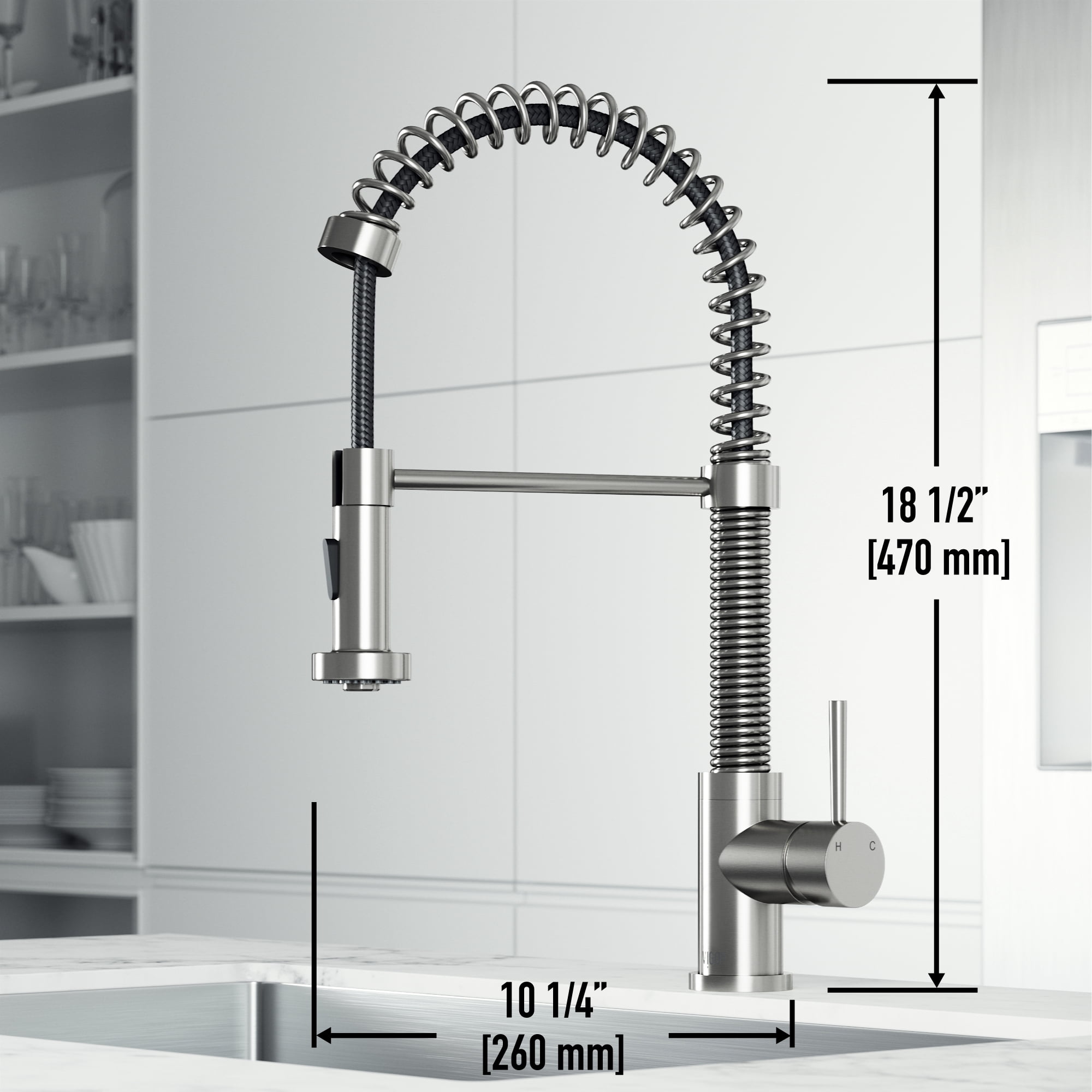 PERFORMANCE SPOUT TM: eco-friendly spout conserves water and reduces your water bill without sacrificing water pressure SWIVEL SPOUT TM: a 360-degree rotating faucet provides exceptional maneuverability making cooking and cleaning in the kitchen effortless ETERNAL SEAL TM: an expertly tested ceramic cartridge that prevents leaks and dripping FINISH PLATED TM: ensures the hardware finish is consistent throughout and guaranteed to match all other VIGO products DUAL-ACTION SPRAY HEAD: the multifunctional pull-down sprayer delivers an aerated flow of water or a powerful spray with the click of a button SECURE DOCKING: Sprayer Docking Station pulls the sprayer into place to secure it when not in use SINGLE HANDLE LEVER: one lever effortlessly controls the water pressure and temperature EASY TO CLEAN: the nozzle resists mineral buildup, making this kitchen faucet easy to clean EXTENDABLE HOSE: A retractable hose of up to 30 inches features a nylon braided hose for additional ease of use EXCEPTIONAL HARDWARE: Sedal ceramic disc valve has been tested for 500,000 uses UNMATCHED DURABILITY: solid brass construction and premium quality parts make this kitchen faucet tough, strong, and easy to clean PREMIUM FINISH: VIGO’s 7-layer coating ensures long-lasting brilliance that resists rust, corrosion and tarnish