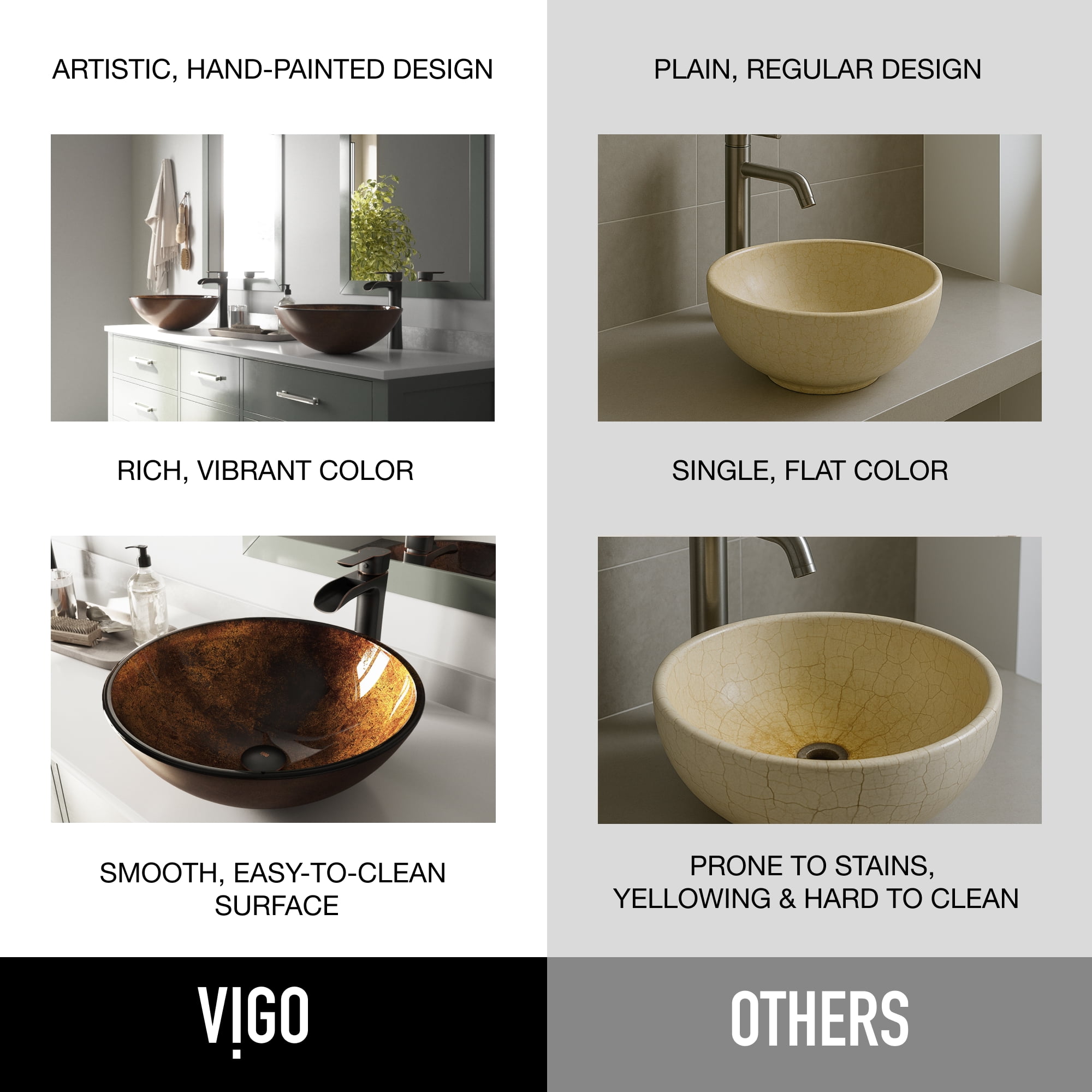 ABOVE COUNTER SINK: The VIGO vessel sink installs above the counter for easy access and a spacious layout REPELLENT SEAL TM: bacteria-resistant coating makes vessel sinks interior more hygienic QUICK DRAIN TM: innovative sealant promotes fast streamlined draining for a clog-free experience SCRATCH-FREE: Sink resists scratches and stains from household cleaners, toothpaste and cosmetics SILENT DROP TM: solid core construction mutes sound for a quieter bathroom experience FADE RESISTANT: Non-porous surface resists discoloration and fading TEMP GUARD TM: heat resistant technology safeguards the sink from hot tools and curling irons EASY TO CLEAN: Rounded edges and smooth construction make this sink easy to clean and maintain SPLASH-FREE: Deep vessel bowl guards against water splashing COMPATIBLE ACCESSORIES: This sink is compatible with any VIGO vessel or wall-mount faucet; VIGO compatible drain model is VG07001 HARDWARE INCLUDED: All mounting hardware and hot/cold waterlines are included CERTIFIED SAFE: Sink and hardware are cUPC certified