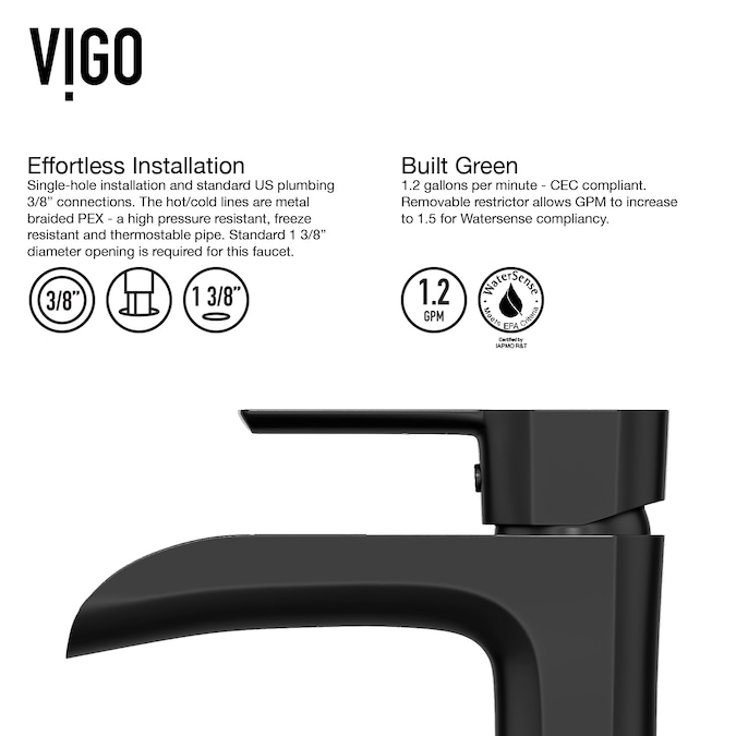 Character and style collide with the VIGO Niko bathroom vessel sink faucet in matte black. This waterfall faucet for the bathroom sink features an open waterway spout that allows water to gracefully cascade directly into the vessel bathroom sink beneath it, creating a soothing waterfall effect. The sink faucet for the bathroom is made from solid brass construction, making it incredibly durable and resistant to rust, corrosion, and tarnish. It is plated in 7 layers of finish to prevent unsightly scratches. A matching pop-up sink drain in the same finish can be purchased separately. This black bathroom sink faucet for sink’s single-hole installation is made incredibly easy with standard US plumbing 3/8 inch connections and metal braided PEX hot/cold lines that are high-pressure resistant, freeze-resistant, and thermostable. The VIGO Niko’s single handle controls both the water and temperature operations, making this model ADA compliant. Meeting cUPC, NSF-61, and AB1953 certifications by the IAPMO, this bathroom faucet for the sink are as safe as it is attractive. Enjoy All that the VIGO Niko has to offer by installing it in your modern bathroom today.