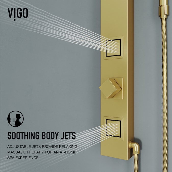 Fortify your health with The Orchid by VIGO, a shower panel system designed to ease your body and mind. VIGO integrated unique massage therapy and targeted water pressure into its design with two body massage jets and a rainfall showerhead that brings the soothing feel of nature into your bathroom. Targeted water pressure works to ease muscle tension and promote better sleep. It features a lightweight wall mount design, and it’s easy-to-connect system integrates with your existing shower controls providing easy installation for your bathroom remodel. VIGO’s unique 7-layer matte brushed gold hardware finish ensures a lifetime of brilliance and is guaranteed to match all other VIGO fixtures. Nourish your mind, body, and soul with The Orchid.