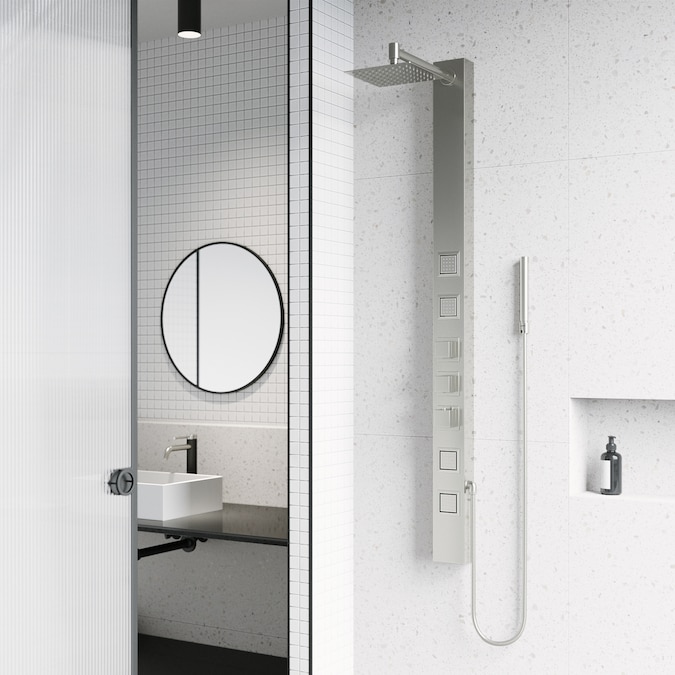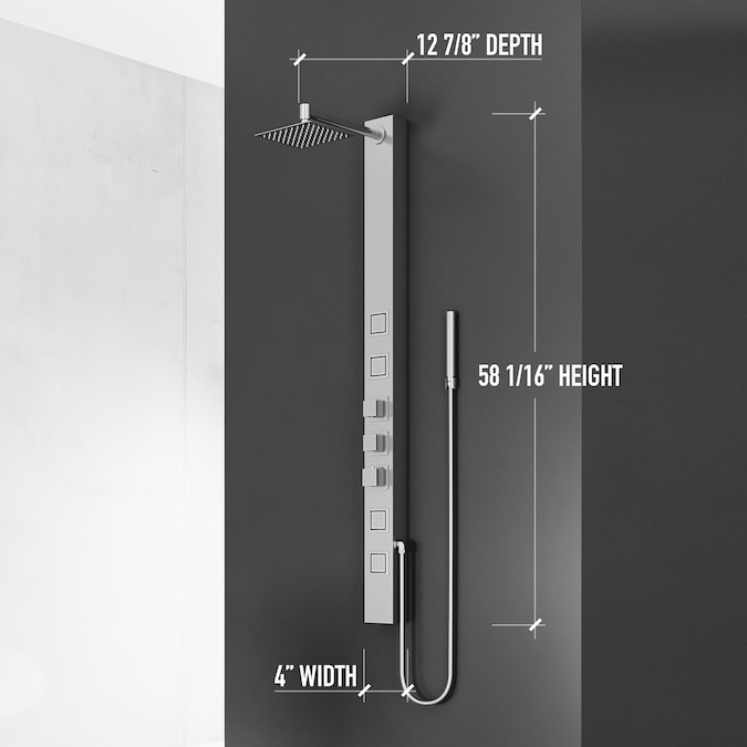 - DIMENSIONS: Measuring 58-in H X 4-in W, this wall-mounted stainless steel shower system stands out with its contemporary industrial aesthetic, instantly becoming the focal point of any bathroom