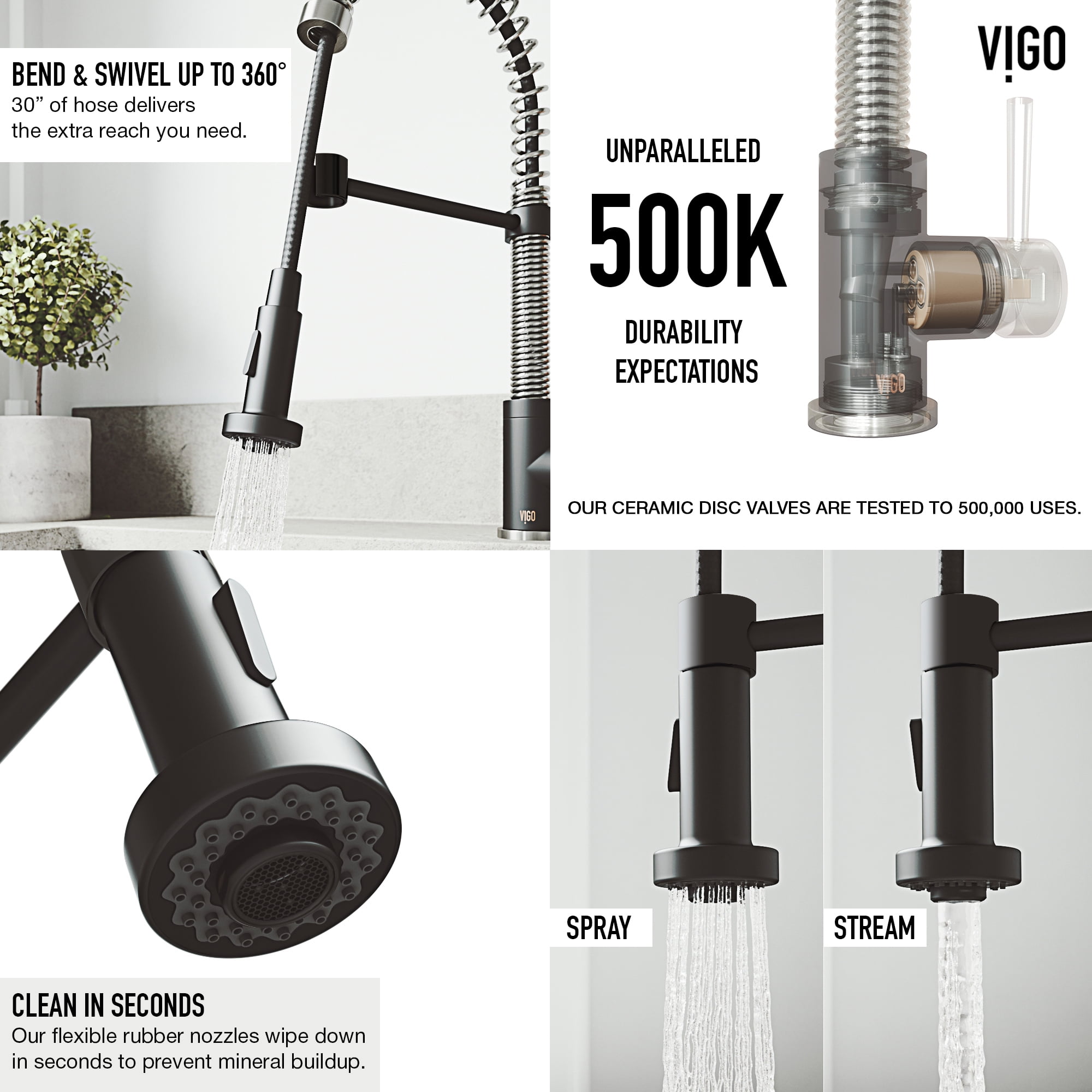 PERFORMANCE SPOUT TM: eco-friendly spout conserves water and reduces your water bill without sacrificing water pressure SWIVEL SPOUT TM: a 360-degree rotating faucet provides exceptional maneuverability making cooking and cleaning in the kitchen effortless ETERNAL SEAL TM: an expertly tested ceramic cartridge that prevents leaks and dripping FINISH PLATED TM: ensures the hardware finish is consistent throughout and guaranteed to match all other VIGO products DUAL-ACTION SPRAY HEAD: the multifunctional pull-down sprayer delivers an aerated flow of water or a powerful spray with the click of a button SECURE DOCKING: Sprayer Docking Station pulls the sprayer into place to secure it when not in use INCLUDED SOAP DISPENSER: soap dispenser has reservoir that sits underneath the countertop and a pump that is above the countertop, easily to refill from top SINGLE HANDLE LEVER: one lever effortlessly controls the water pressure and temperature EASY TO CLEAN: the nozzle resists mineral buildup, making this kitchen faucet easy to clean EXTENDABLE HOSE: A retractable hose of up to 30 inches features a nylon braided hose for additional ease of use EXCEPTIONAL HARDWARE: Sedal ceramic disc valve has been tested for 500,000 uses UNMATCHED DURABILITY: solid brass construction and premium quality parts make this kitchen faucet tough, strong, and easy to clean
