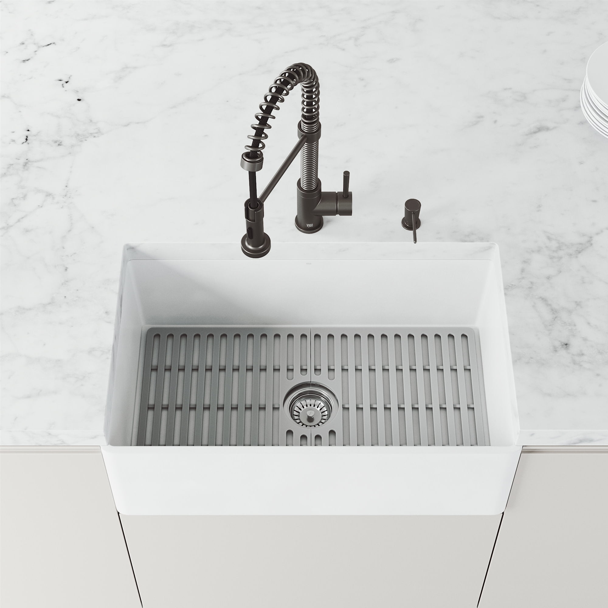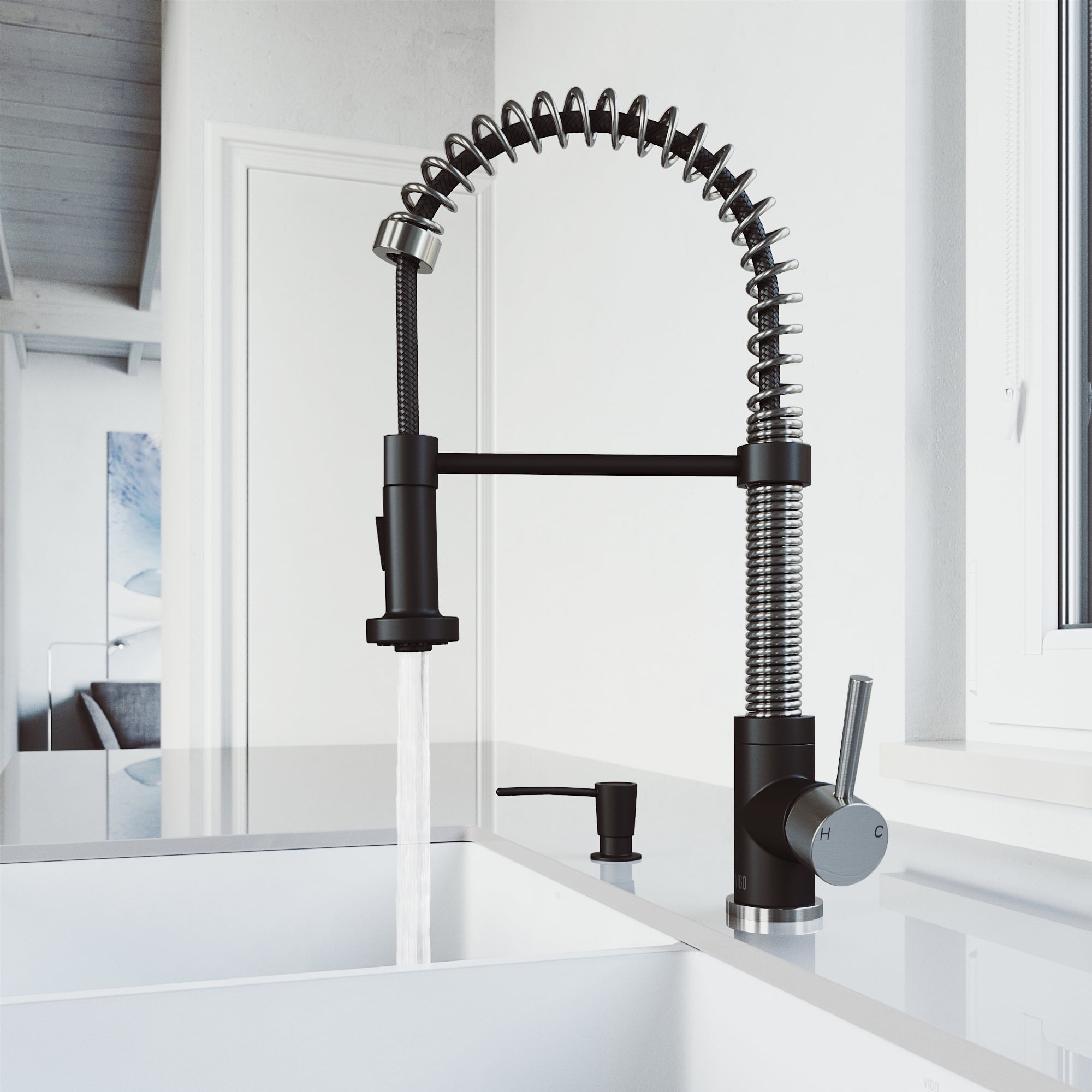 The pull-down, dual action spray head on the VIGO Edison Pull-Down Spray Kitchen Faucet allows for your choice of aerated flow or powerful spray for all your modern kitchen needs. The 360° swivel spout extends up to 30 inches, and its spiral details and solid brass construction make it a highly functional and beautiful statement piece. A matching matte black soap dispenser rounds out the set to make kitchen remodel even more convenient.
