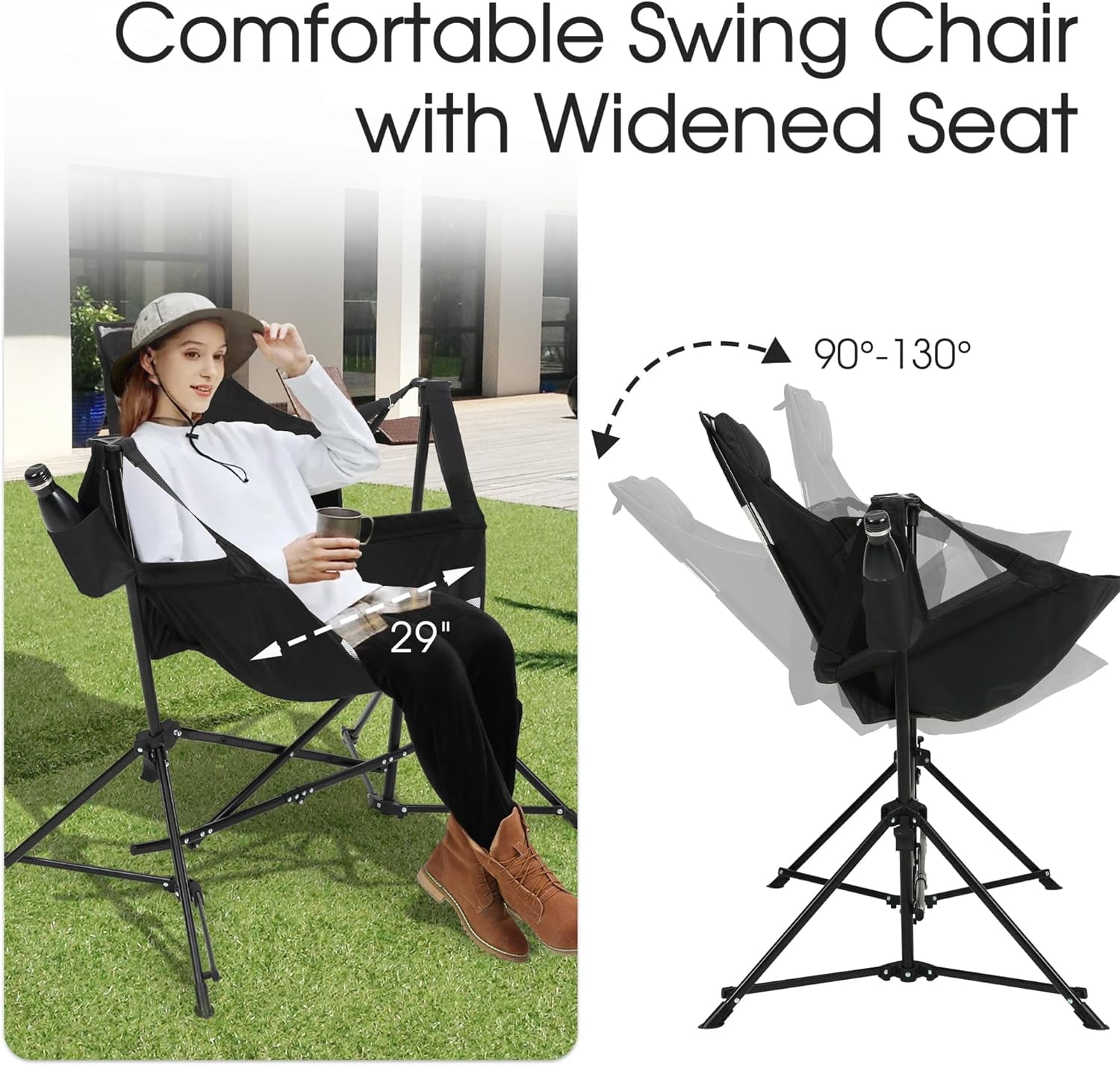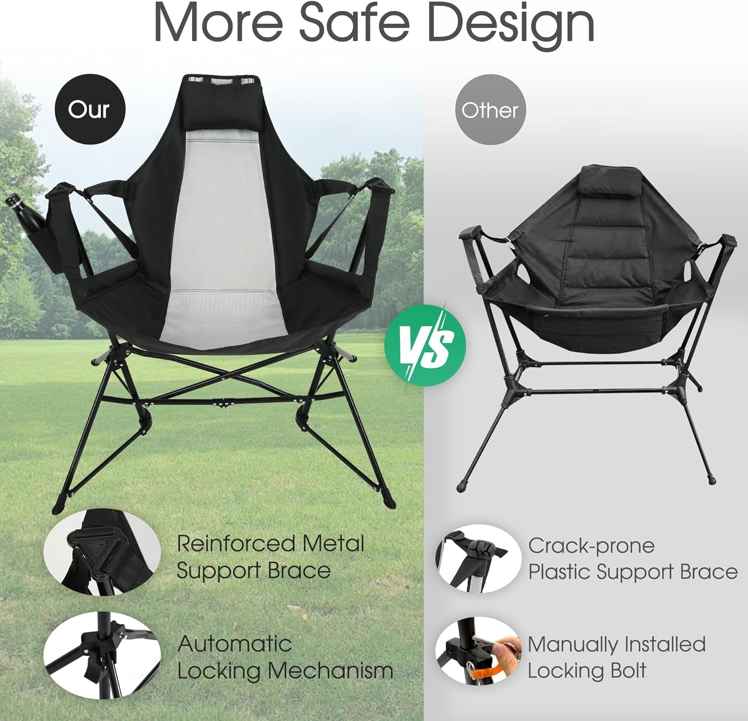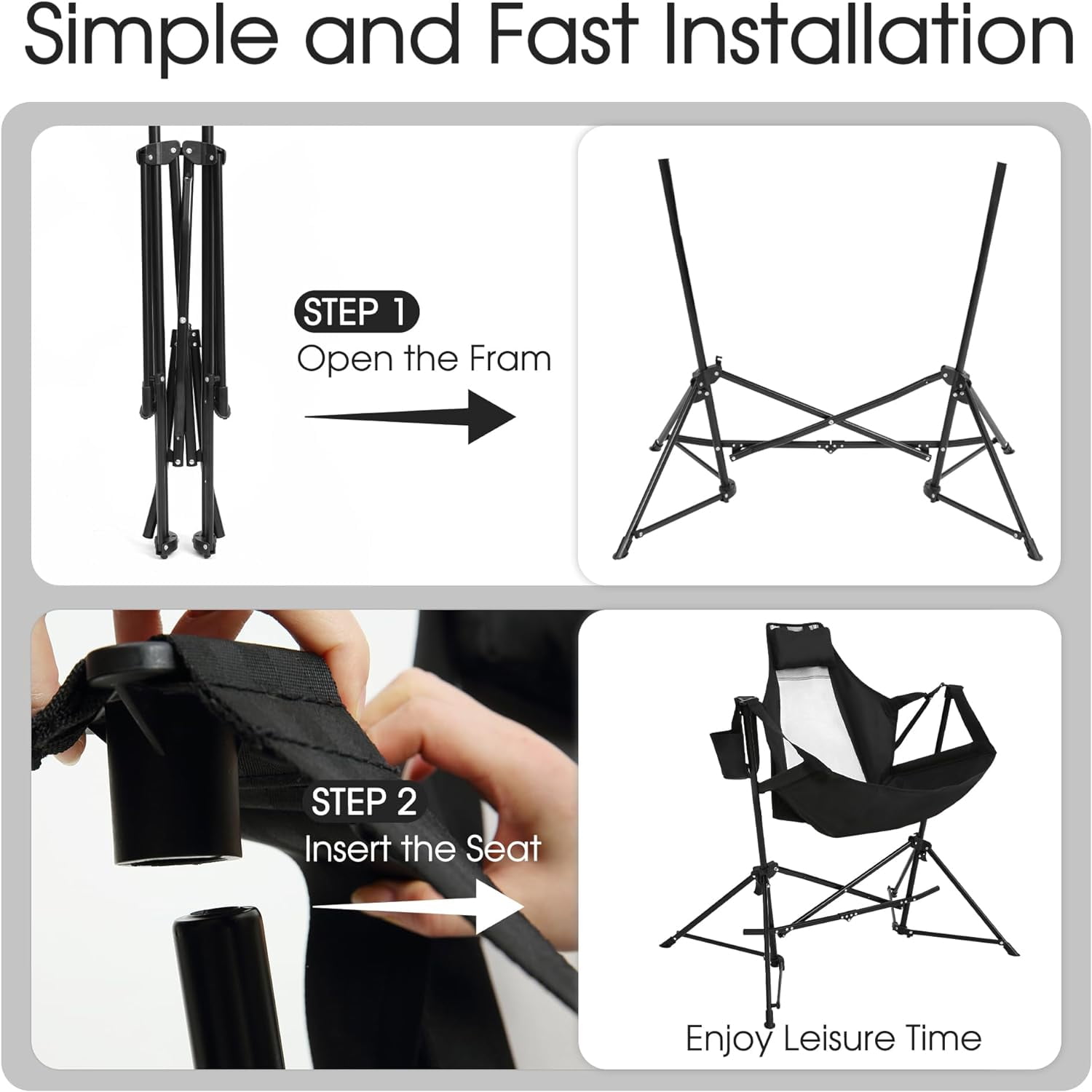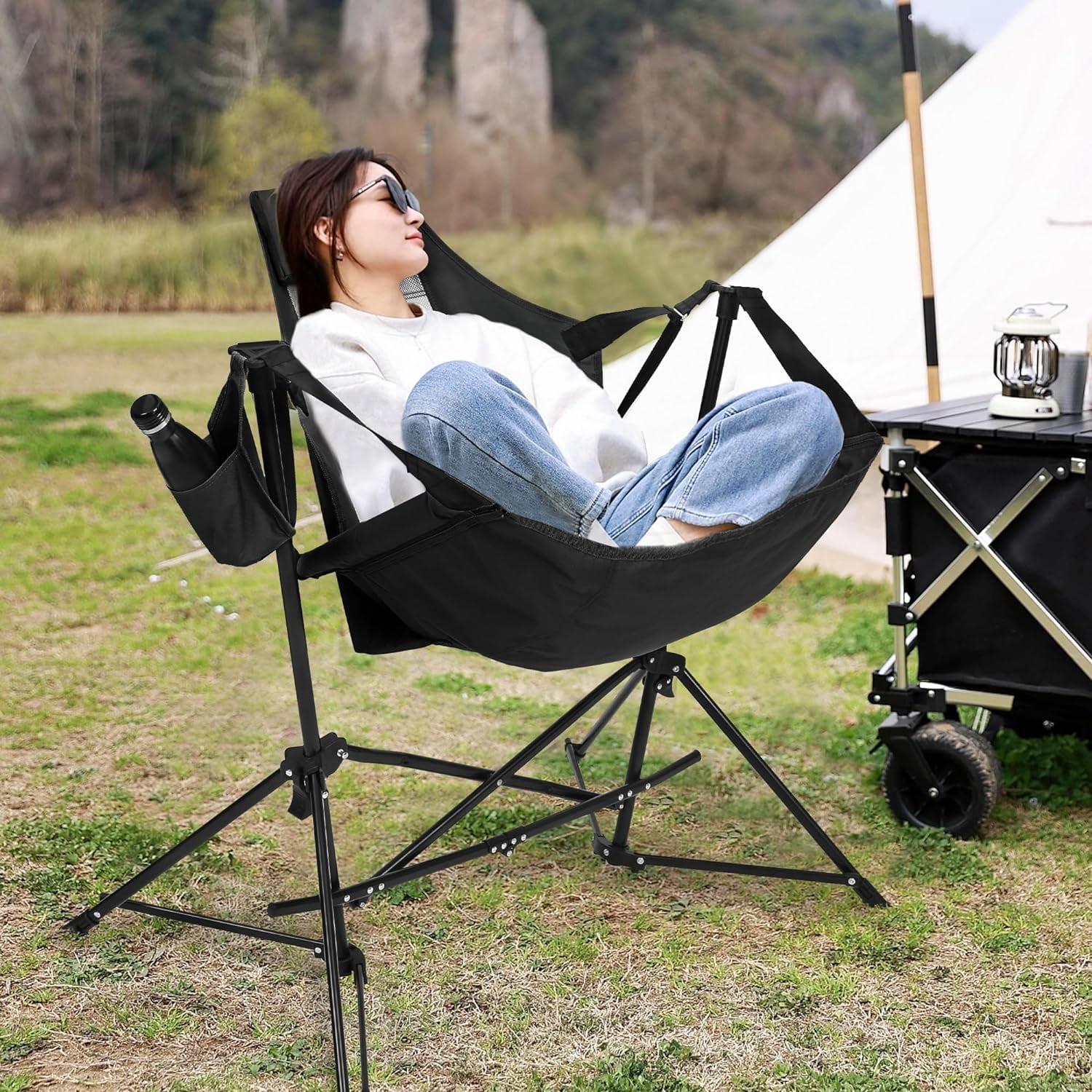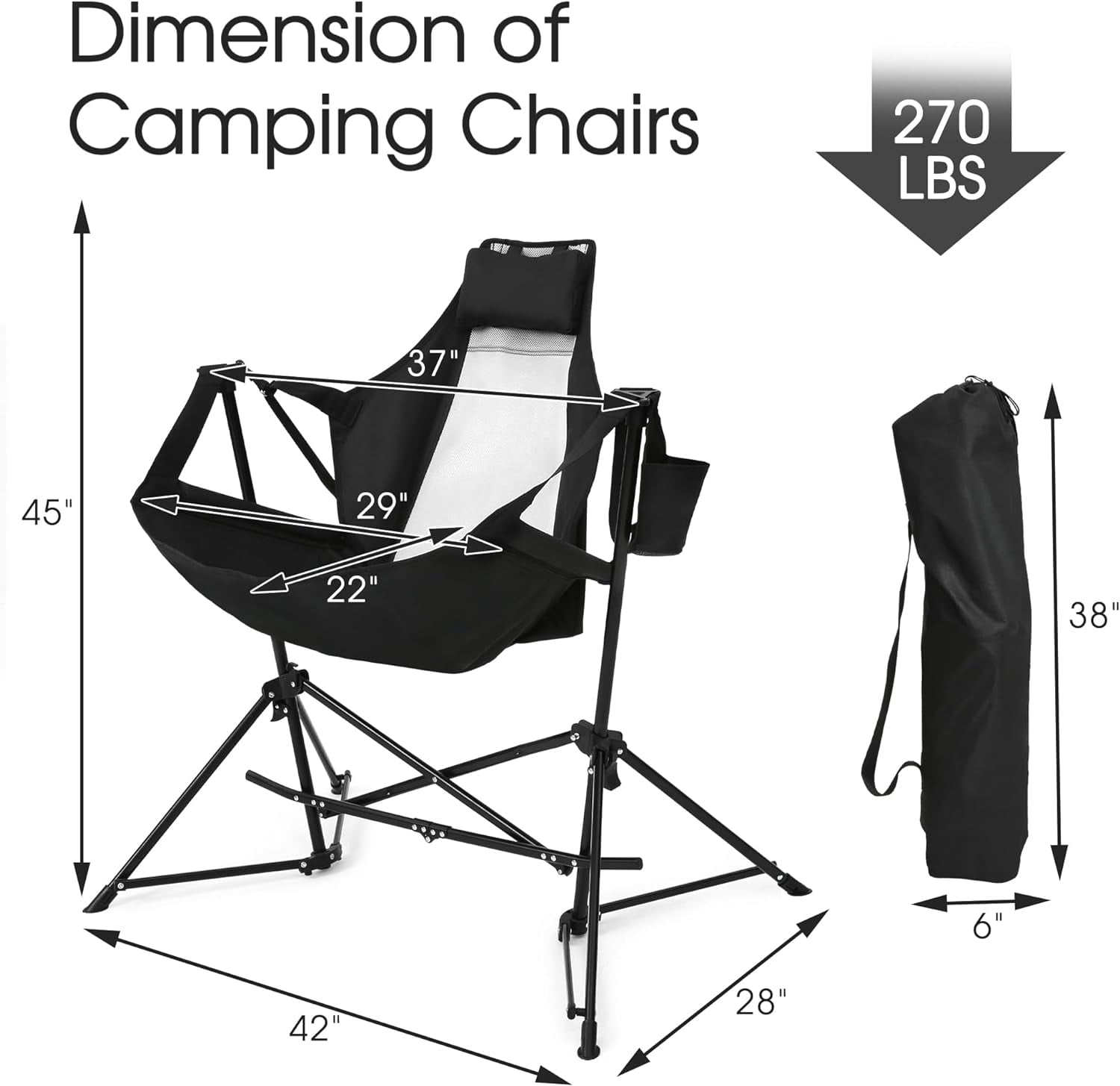 This oversized seat and high backrest from Villeston is made from PVC polyester fabric that is durable, abrasion and weather resistant for maximum comfort. The breathable fabric allows air to circulate for a comfortable seating experience, as well as allowing you to recline, relax and doze off. The folding and lightweight size does not occupy storage space for easy storage and is easy to be carried outdoors. With a folding design, you can fold the camping chair up to a compact size within seconds. The lightweight design allows you to move wherever you want Constructed with sturdy steel, this folding hammock chair is stable and solid enough to support up to 300lbs. Auto lock when fully open also ensures the stability and safety
