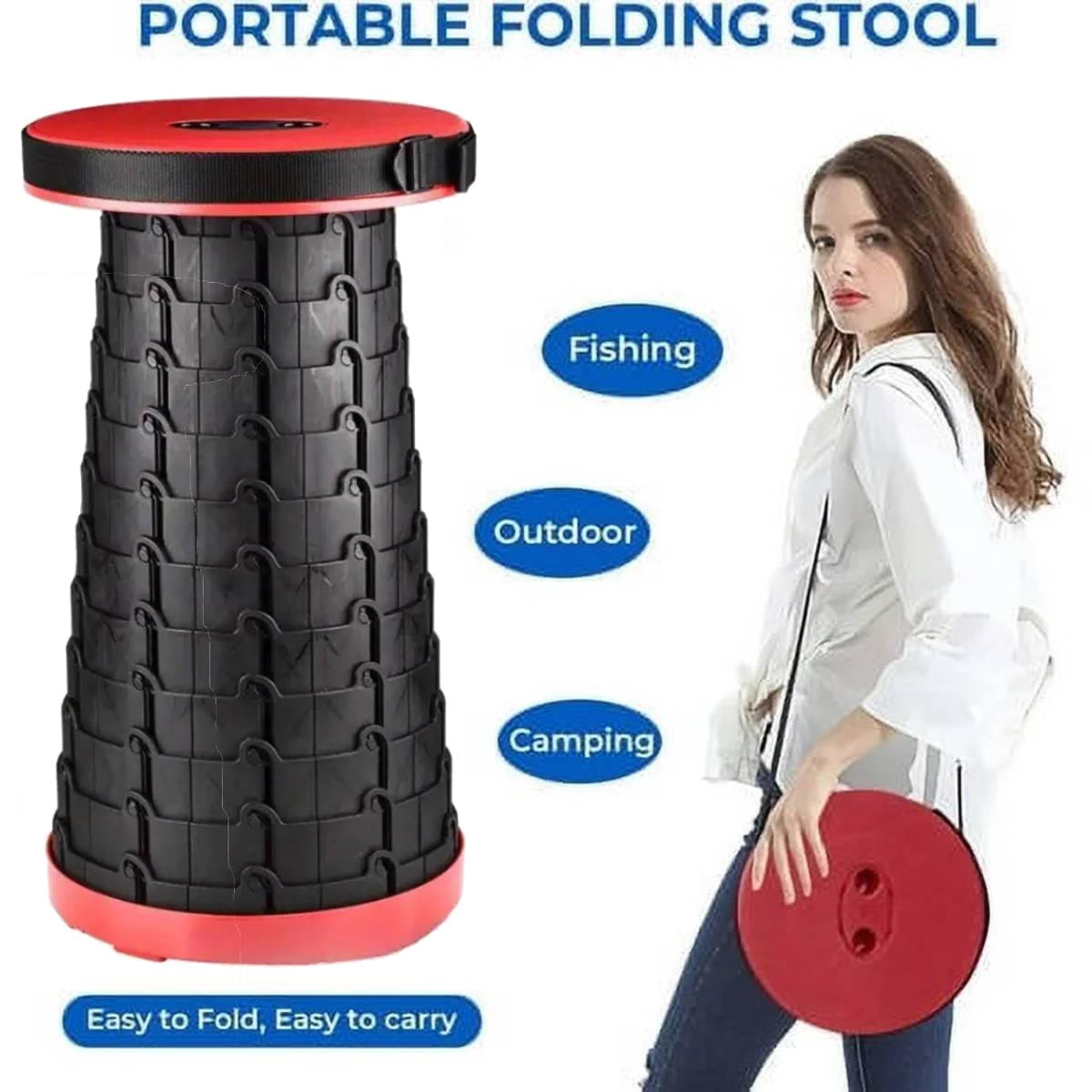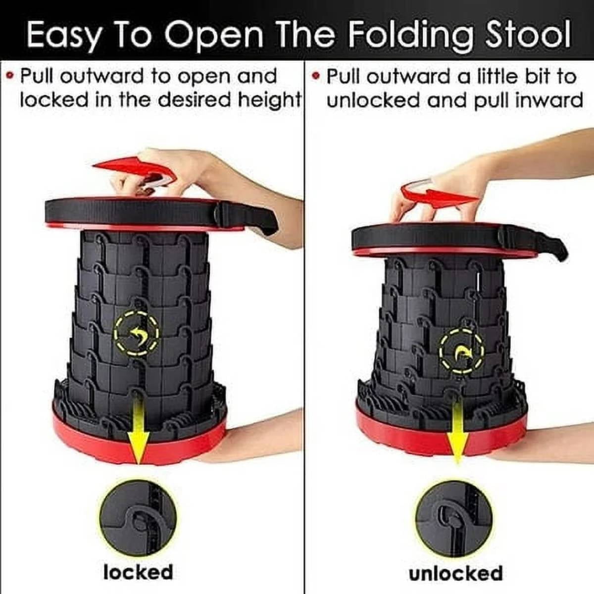 VINAUO Outdoor Collapsible Chairs,Collapsible Seat,Portable Stool Collapsible Adjustable Height for Fishing,Hiking Tours,BBQ,Parties,Outdoor Red 1. Height Adjustable :The portable stool collapsible can be adjusted to your desired height, ranging from 2.4 inch to 17.5 inch. This adjustability makes it suitable for both adults and children. 2. The adjustable shoulder strap makes it easy to carry or hang over the shoulder. You can fold the compact hiking stool up and put it in your bag. No matter where you go, you can sit anytime, anywhere. Hand straps and shoulder straps are available in two designs, Provide more ways to carry. 3. Holds Up to 500LBS:This newly upgraded telescoping stools is made of high-density thickened PP material, which is hard, stable, scratch-resistant and wear-resistant. Upgraded fish scale structure and reinforced 10-layer buckle design, increase collapsible stool strength, rigidity and stability. The load capacity reaches 500 lbs, and the product weighs only 2lbs. The bottom of the portable stool has a non-slip design, and the side support and anti-tilt ability have also been strengthened, making the stool more durable and safe. 4. Easy To Open And Use:The interior of this telescopic chair is designed with stiffeners to hold it in place, making the stool stronger and easier to open and close.The top and bottom of the collapsible seat are designed with two holes, you just need to hold the two holes, stretch and turn them clockwise/counterclockwise, and you can easily open and close them. 5. Wide Range Of Applications:This portable collapsible seat It is lightweight and portable, and it is very suitable for use in all aspects of life. When you go out, carry it on your back for hiking, fishing, traveling, camping, barbecue, outdoor concerts, or queuing, you can sit and rest anytime, anywhere, or use it as a small table. When you hold a party at home or have a lot of guests at the birthday party, you can take it out to sit, and put it away when not in use without taking up space. How To Open And Use Step 1: Stretch out both hands at the same time Step 2: Rotate clockwise and fish scale buckle locked Step 3: Turn counterclockwise and compress with both hands