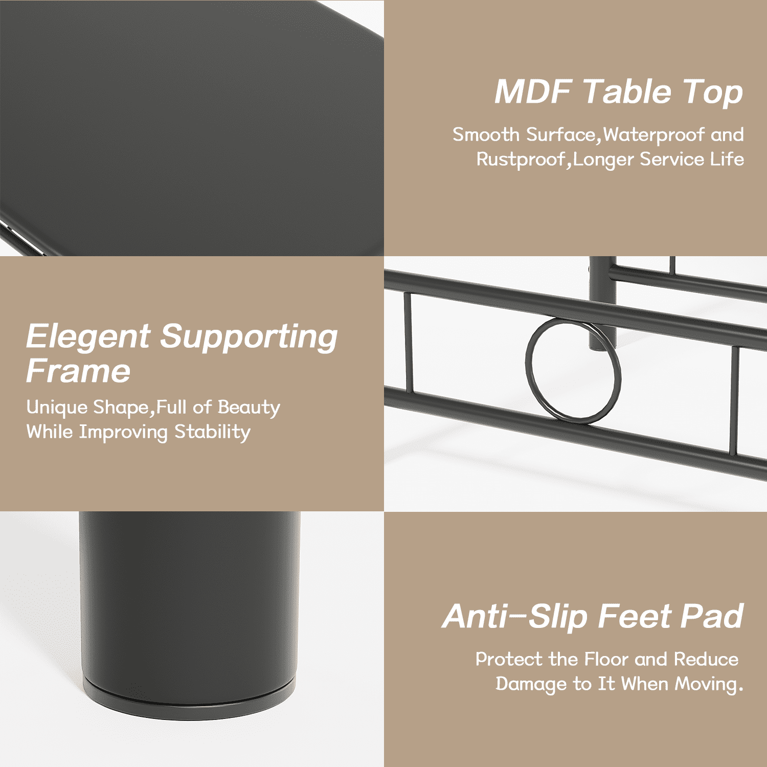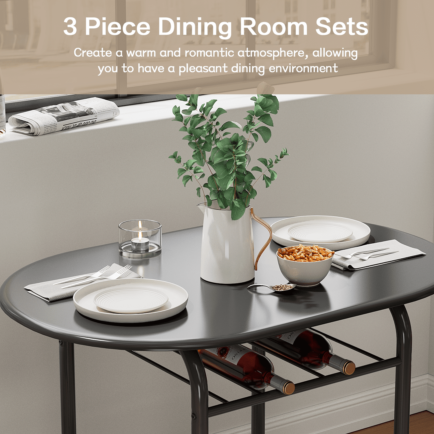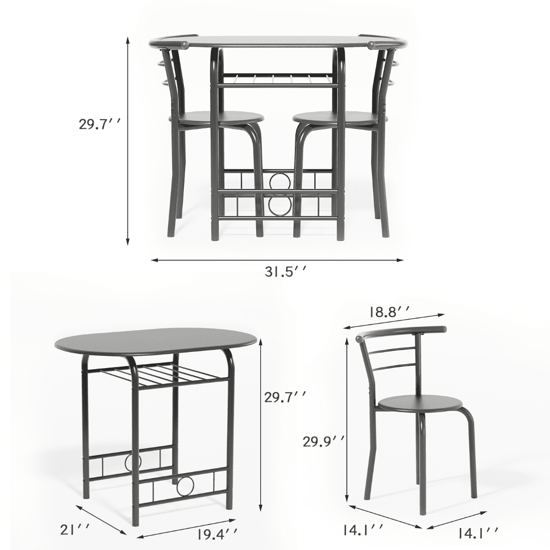 Quality Material:This three piece dining table is made of MDF and metal frame with painted iron tube surface, which not only increases the rust resistance but also increases the stability, easy to clean and maintain. Built-in Wine Rack: The table has an additional storage space that can be used as a wine rack to support up to 6 bottles or to put baskets and other tableware, and can also be used to hold newspapers and books. Space-Saving Design:The curve of each chair back and table corner are perfectly matched, so you can put the chair under the table when not in use; it improves the utilization of space. Multifunctional Use: This dining table has a compact size that does not take up space in your kitchen, apartment, dormitory, condo, balcony; it can also be used as a breakfast table for afternoon tea and coffee drinking. Easy to Install: detailed installation instructions are included and each part is numbered, so you can quickly complete the installation.