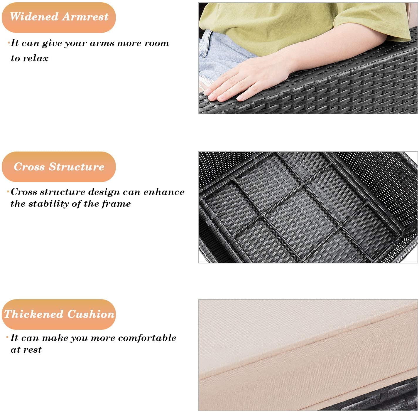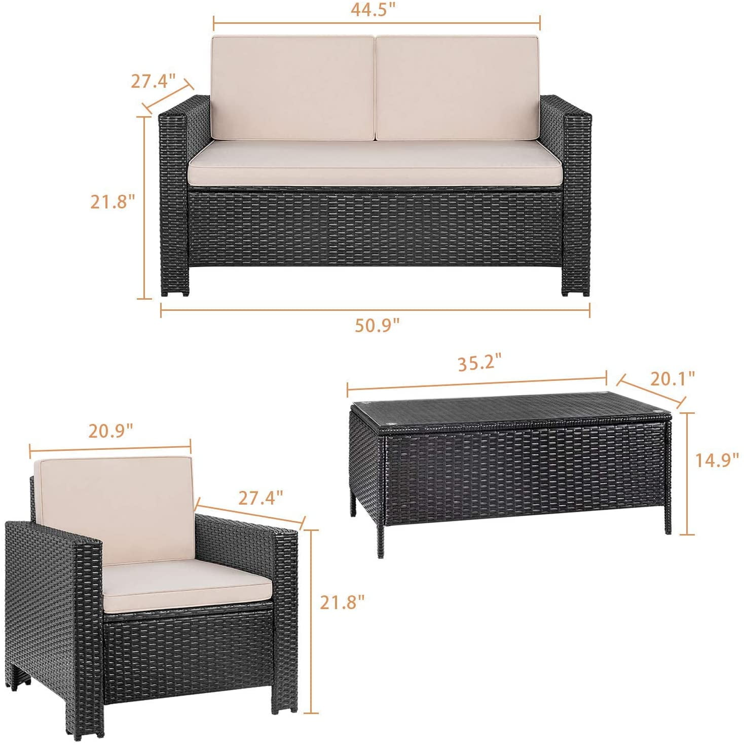 Features: Sturdy&durable: The sturdy frame and high-quality rattan make it resistant to any weather changes. The tempered glass is strong and easy to wipe, the removable and washable cushion allows you not to worry about accidentally getting it dirty. Free combination: This outdoor patio furniture set is composed of a loveseat, two armchairs and a coffee table. You can adjust it to the any form you want, singly use or use in combination, without worrying about being restricted by space. Terraces, gardens, poolsides, backyards, you can place them wherever you want to enjoy the ☀sun☀. Enjoy leisure time: The thickened cushions and the flexibility of the combination make you comfortable whether you are sitting or lying down. It is very suitable for family gatherings or entertaining guests. The table is equipped with tempered glass, you can put beverages, fruits, books, etc. (Please note: the waterproof capacity of the cushion is insufficient, so it is recommended that you can put them away or cover them when not in use) ????If you have any questions, please feel free to contact us~ Customer service email: [email protected] Attention Please: 1.If you put it outdoor, advise you to put it outside with a cover to protect it in rain or snow weather, avoid reducing service life. 2.There are 2 boxes that you will receive, the transportation speed is about 3-10 days normally. 3. None of the cushions support machine washing, which can cause stitches to break. Specifications: Table Removable tempered glass top All weather black PE rattan wicker and strong steel frame Table dimensions: 35.8″L x 20.3″W x 15″H Tempered glass top dimensions: 35.8″L x 20.3″W Chairs Weight capacity: 330 LBS per chair All weather black PE rattan wicker and strong steel frame Armchair dimensions: 27.7″L x 27″W x 21.9″H Loveseat dimensions: 44.5″L x 27.2″W x 21.9″H Cushions Beige polyester fabric and sponge padded Removable cushion cover Single sofa dimensions: 27″L x 27″W x 2″H Double sofa dimensions: 44.5″L x 27.2″W x 2″H Manufacturer’s Information: Available in multiple colors of finish and cushion Minimal assembly required 1-Year limited warranty Arrives in two boxes Box one dimensions: 44.89″L x 13.19″W x 27.76″H; Weight: 80.47LBS Box two dimensions: 44.69″L x 7.88″W x 28.15″H; Weight:36.37LBS