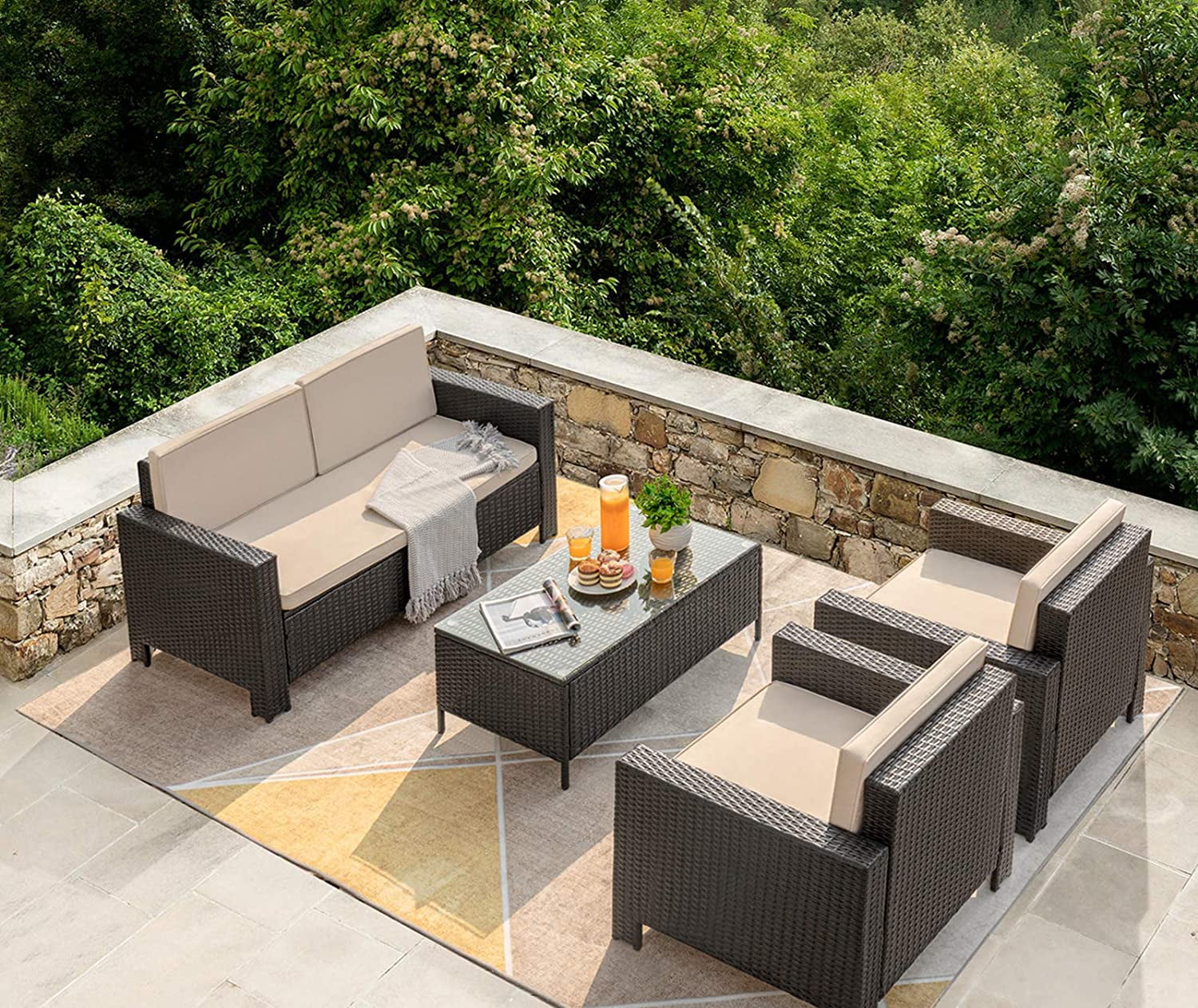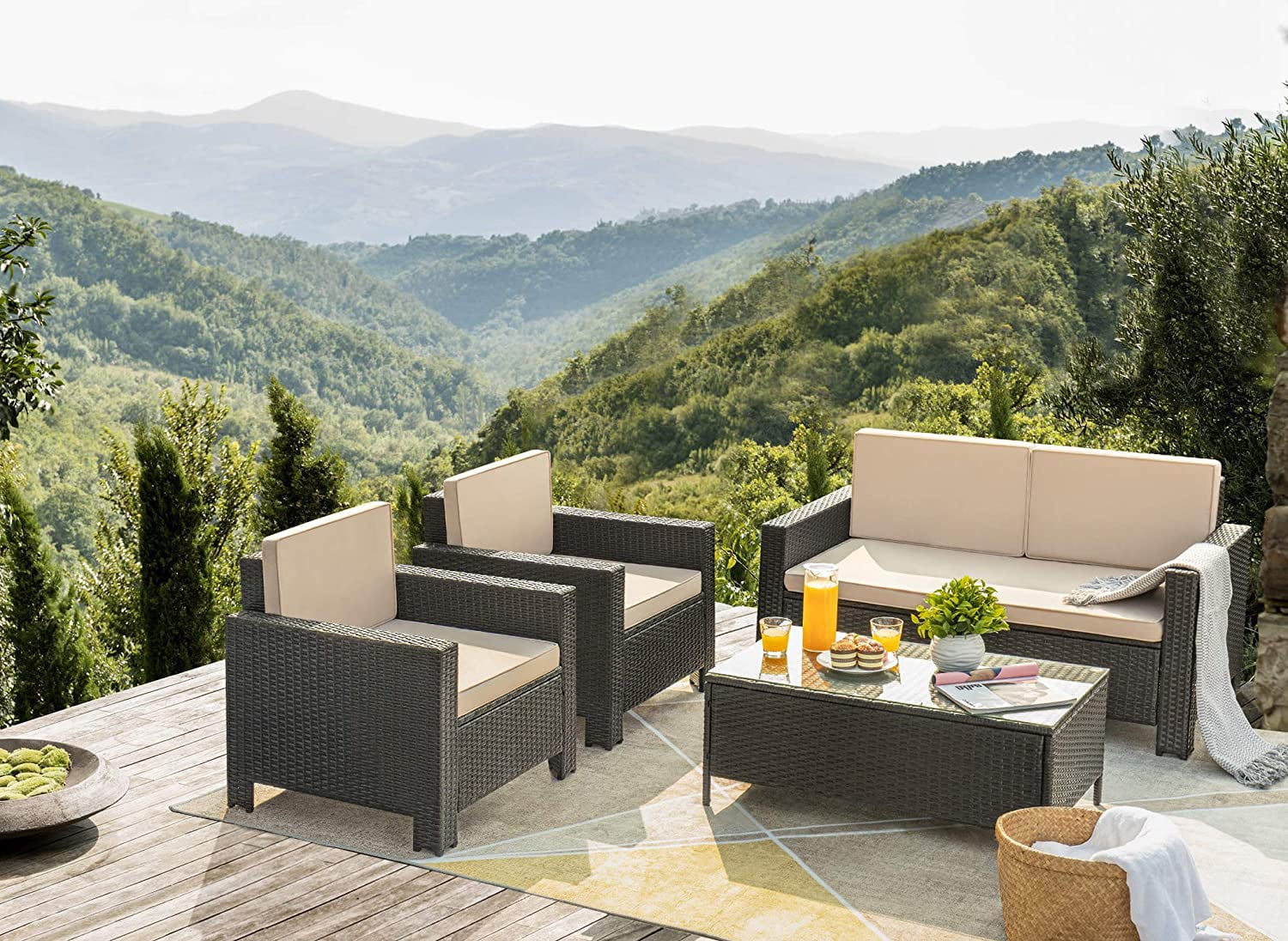 Vineego 4-Piece Wicker Outdoor Patio Conversation Set with Cushions, Black/Beige