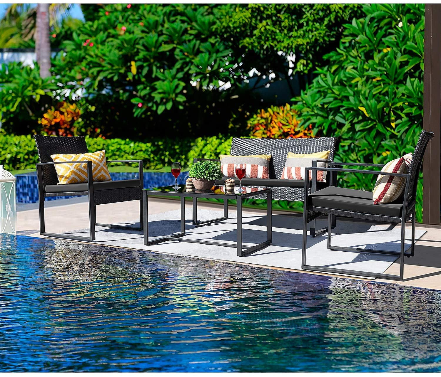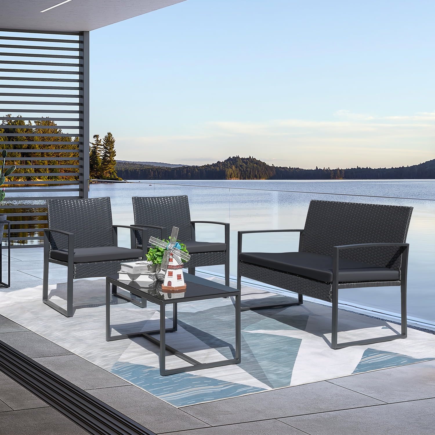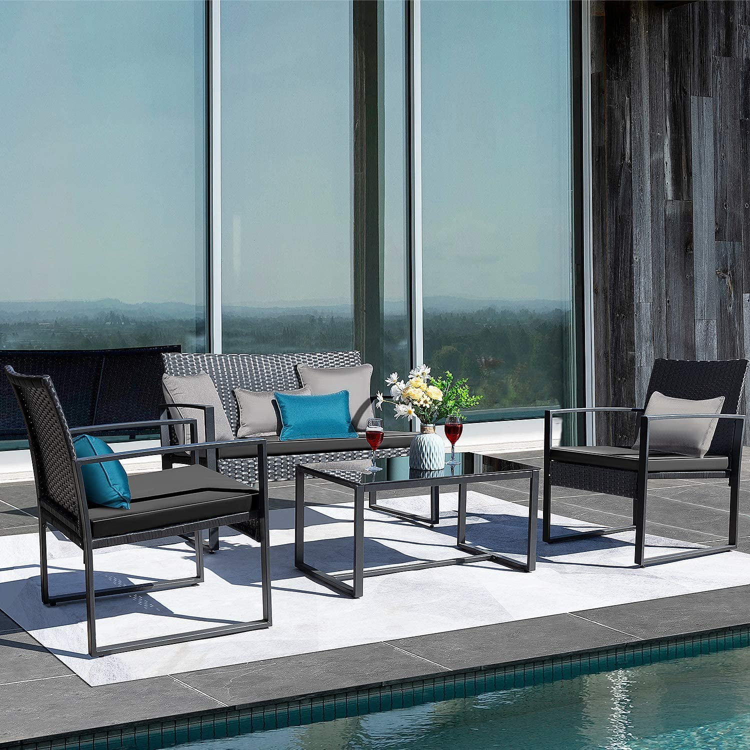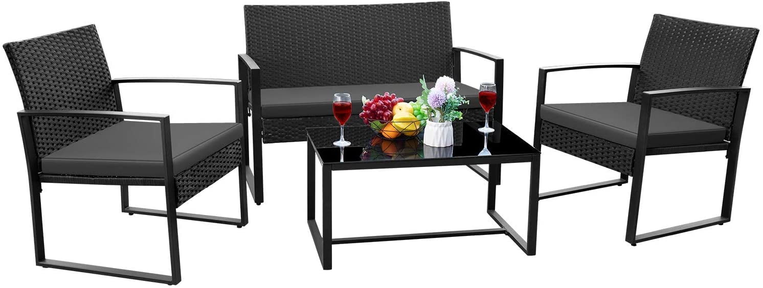 Vineego 4 Pieces Patio Conversation Sets PE Rattan Chairs with Loveseat and Table,Black