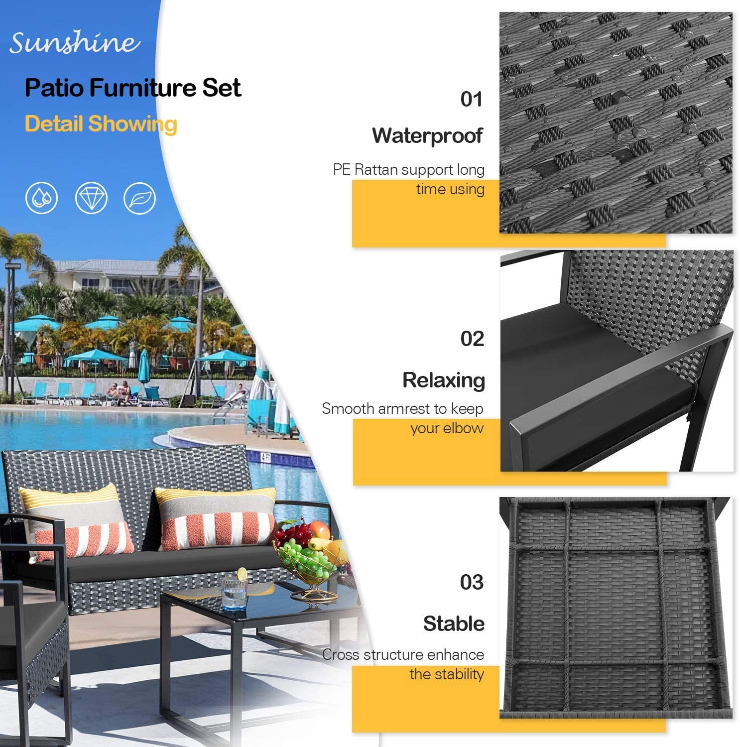 –Sturdy&durable: the sturdy frame and high-quality rattan make it resistant to any weather changes. The tempered glass is strong and easy to wipe, the removable and washable cushion allows you not to worry about accidentally getting it dirty. –Free combination: This outdoor patio furniture set is composed of a loveseat, two armchairs and a coffee table. You can adjust it to the any form you want, singly use or use in combination, without worrying about being restricted by space. Terraces, gardens, poolsides, backyards, you can place them wherever you want to enjoy the ¢sun¢. –Enjoy leisure time: The thickened cushions and the flexibility of the combination make you comfortable whether you are sitting or lying down. It is very suitable for family gatherings or entertaining guests. The table is equipped with tempered glass, you can put beverages, fruits, books, etc. (Please note: the waterproof capacity of the cushion is insufficient, so it is recommended that you can put them away or cover them when not in use) —Specifications— Table: Removable tempered glass top All weather brown PE rattan wicker and strong steel frame Table dimensions: 29.5″L x 17.6″W x 15″H Chairs: Weight capacity: 330 LBS per chair All weather brown PE rattan wicker and strong steel frame Armchair dimensions: 22.5″L x 21.3″W x 30″H Loveseat dimensions: 42″L x 21.3″W x 30″H Cushions: Black polyester fabric and sponge padded Removable cushion cover Attention Please: 1.If you put it outdoor, advise you to put it outside with a cover to protect it in rain or snow weather, avoid reducing service life. 2.¢If you have any questions, please feel free to contact us~ Customer service email: [email protected]