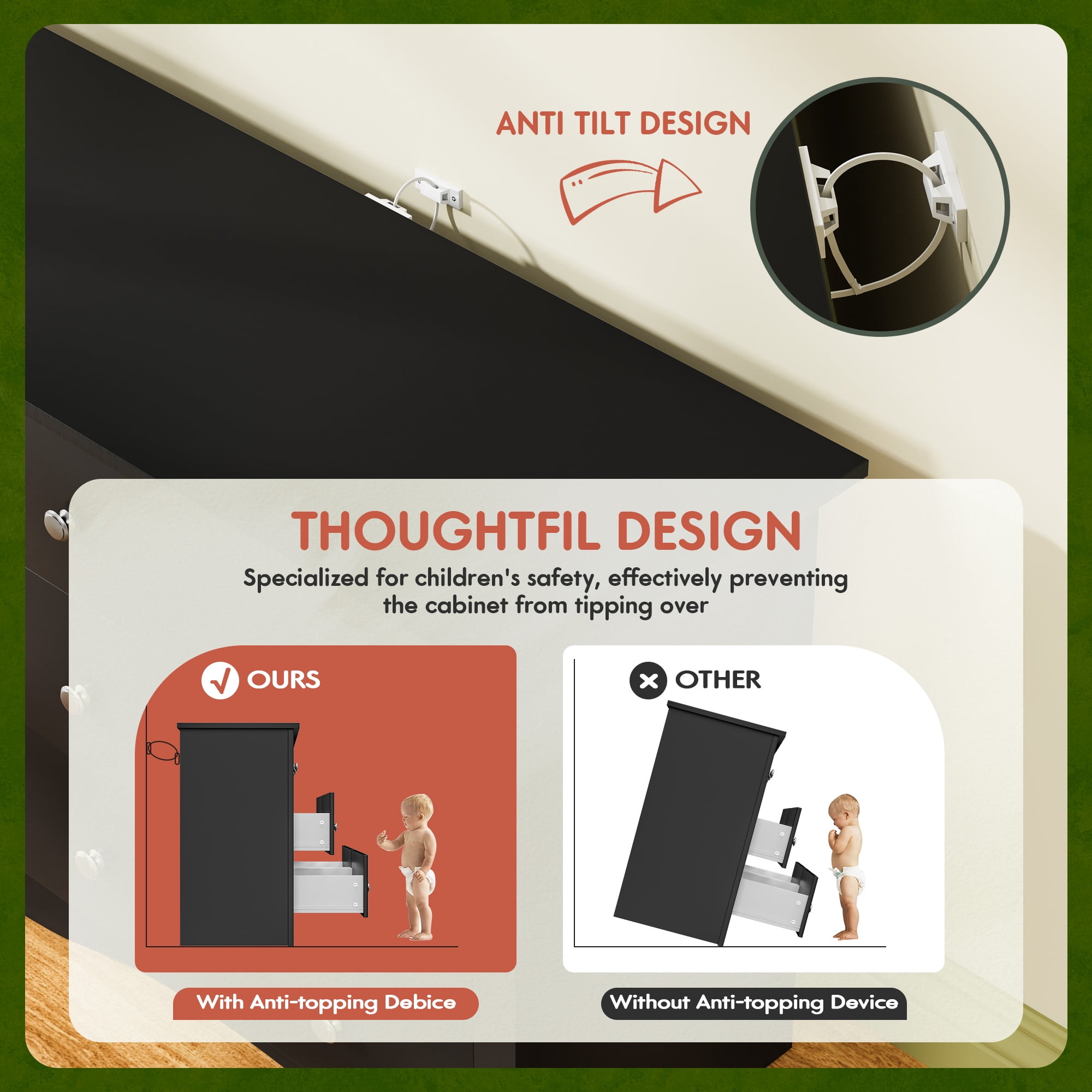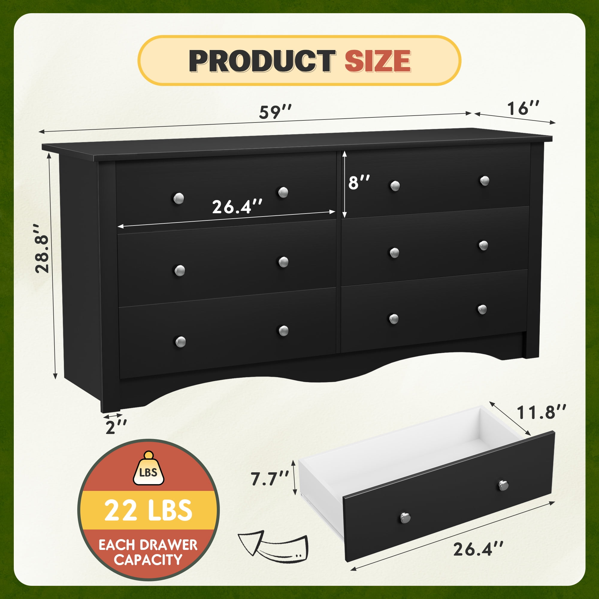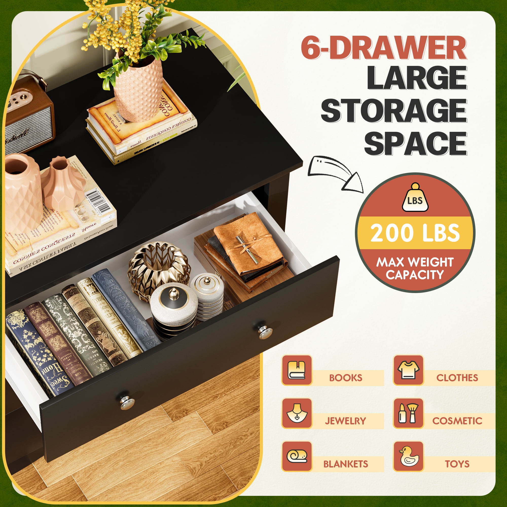 Ample Storage Space: Our dressers are made up of 6 drawers to help you easily organize your room and are suitable for storing toys, books, clothes and more. Wide Range of Applications: this wood can be used as a dresser in the bedroom, can be used as a TV cabinet in the living room, and can be placed in the porch as a storage rack. Anti-tipping Device: for reducing furniture tip-over hazards and better using experience, we add the anti-dumping accessories to the dresser to prevent incidents that make dresser stand more stable. Durable Material: built from high quality woods, this drawers stands as a sturdy and firm piece of bedroom furniture, which ensure the stability. Smooth tracks and water-resistant surfaces make for a better experience. Easy to Assemble: easy-to-use instructions are included so that the installation of dresser will be effortless. According to our clear instruction, just follow the steps in the instruction and put all pieces together.