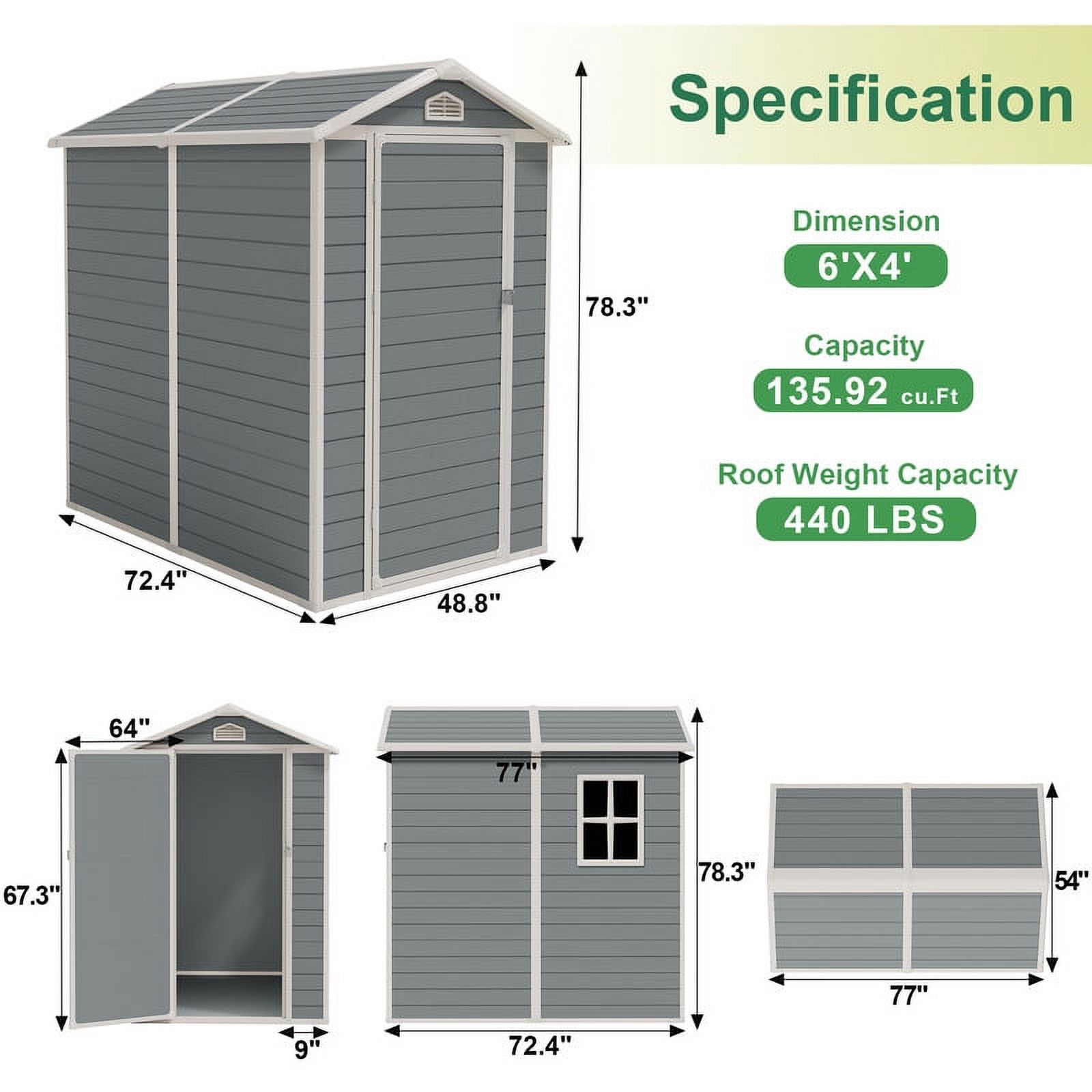Vineego 6×4 Outdoor Resin Storage Shed with Reinforced Floor, All-Weather Plastic Shed with Lockable Doors,Gray