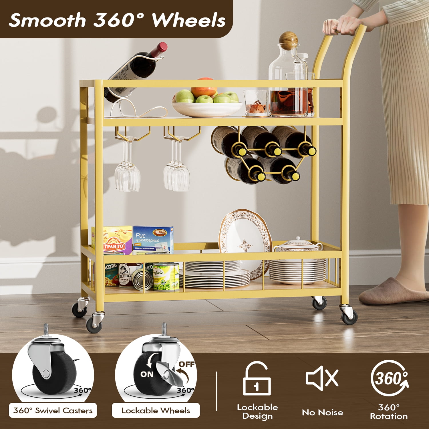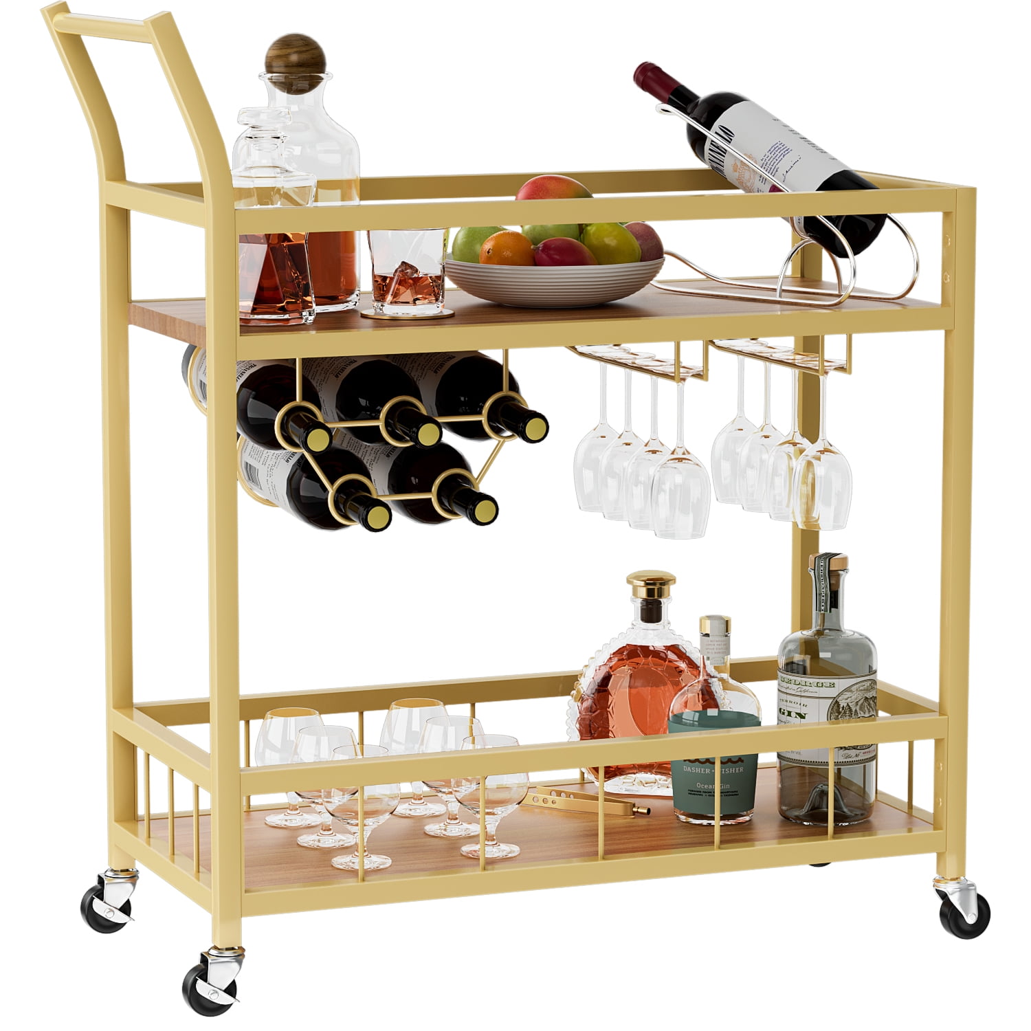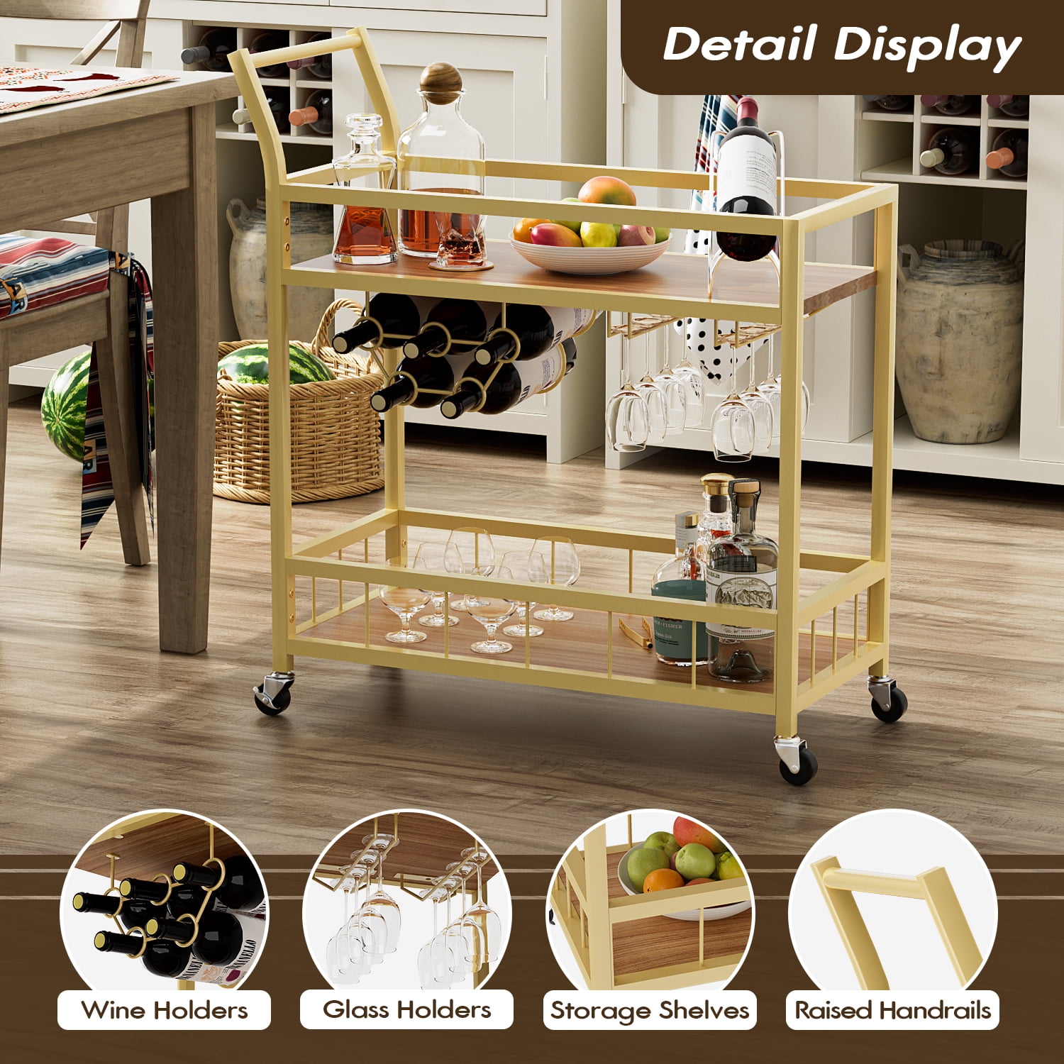 Vineego Bar Cart Home Industrial Mobile Bar Cart Serving Wine Cart on Wheels with Wine Rack and Glass Holder 2 Wood Storage Shelves for Living Room, Kitchen, Party (Gold)