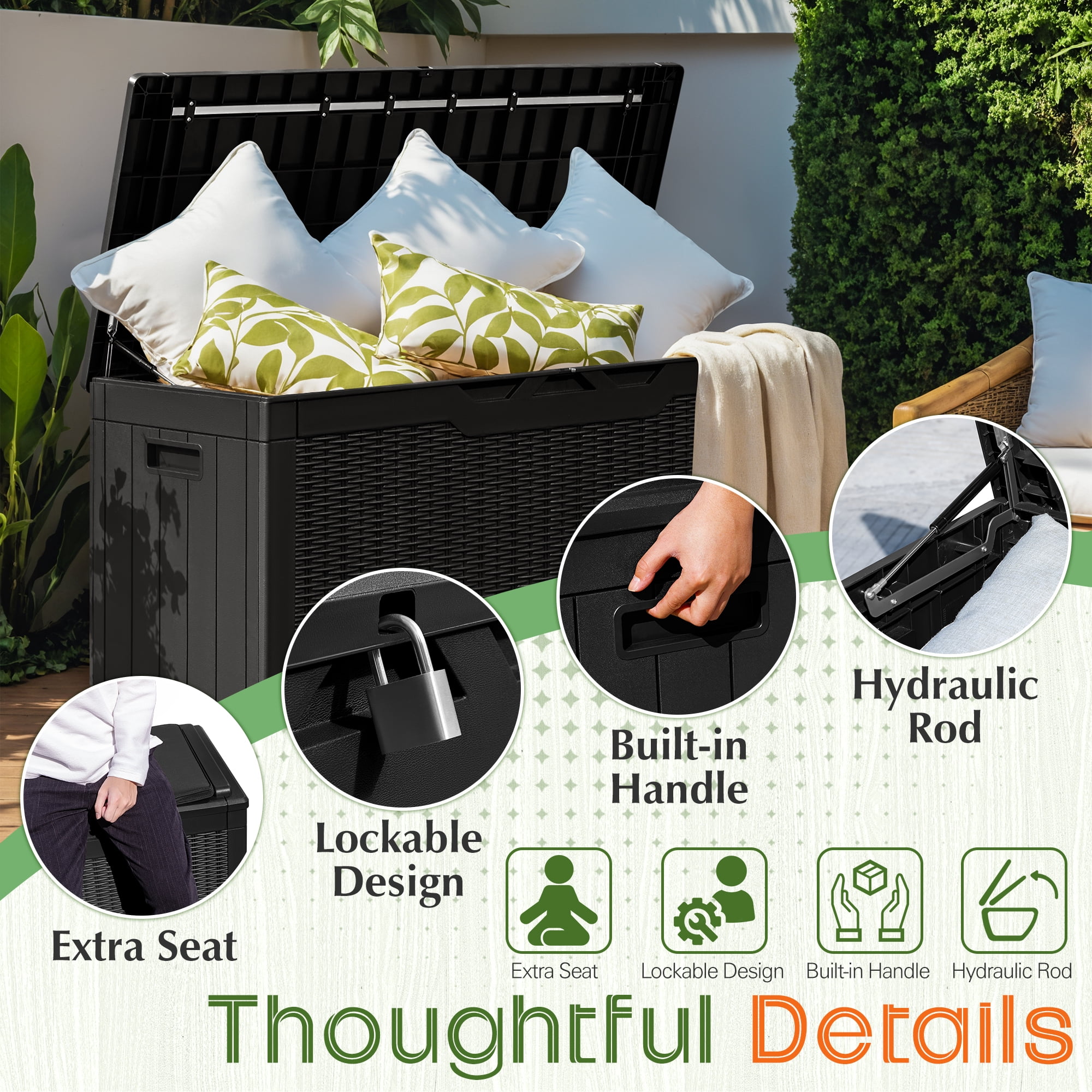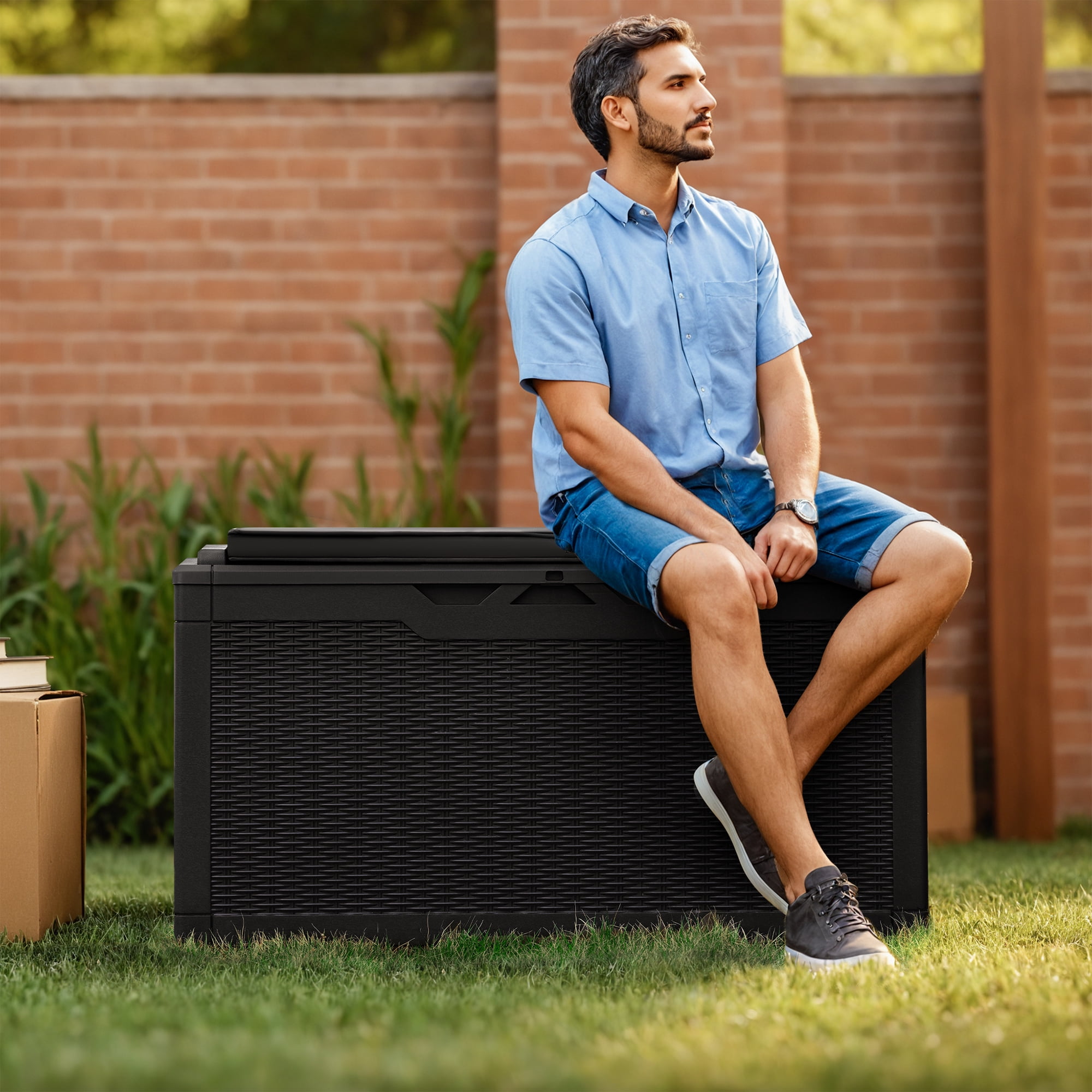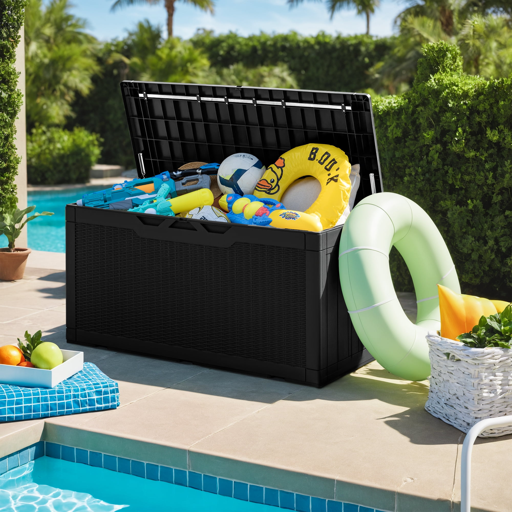 Vineego Classic Outdoor 100 Gallon Resin Deck Box with Cushions, Lockable Storage Container, Black High Quality Material: Made of weather-resistant polypropylene resin, ensuring durability and resistance to fading, rust, flaking, and bending Extra Large Storage Capacity: Offers a generous 100-gallon storage capacity, ideal for organizing outdoor furniture cushions, pool toys, and garden tools Thoughtful Design: Features two hydraulic levers for a gentle opening and closing lid, preventing hand trapping; the lockable lid provides added security for your belongings