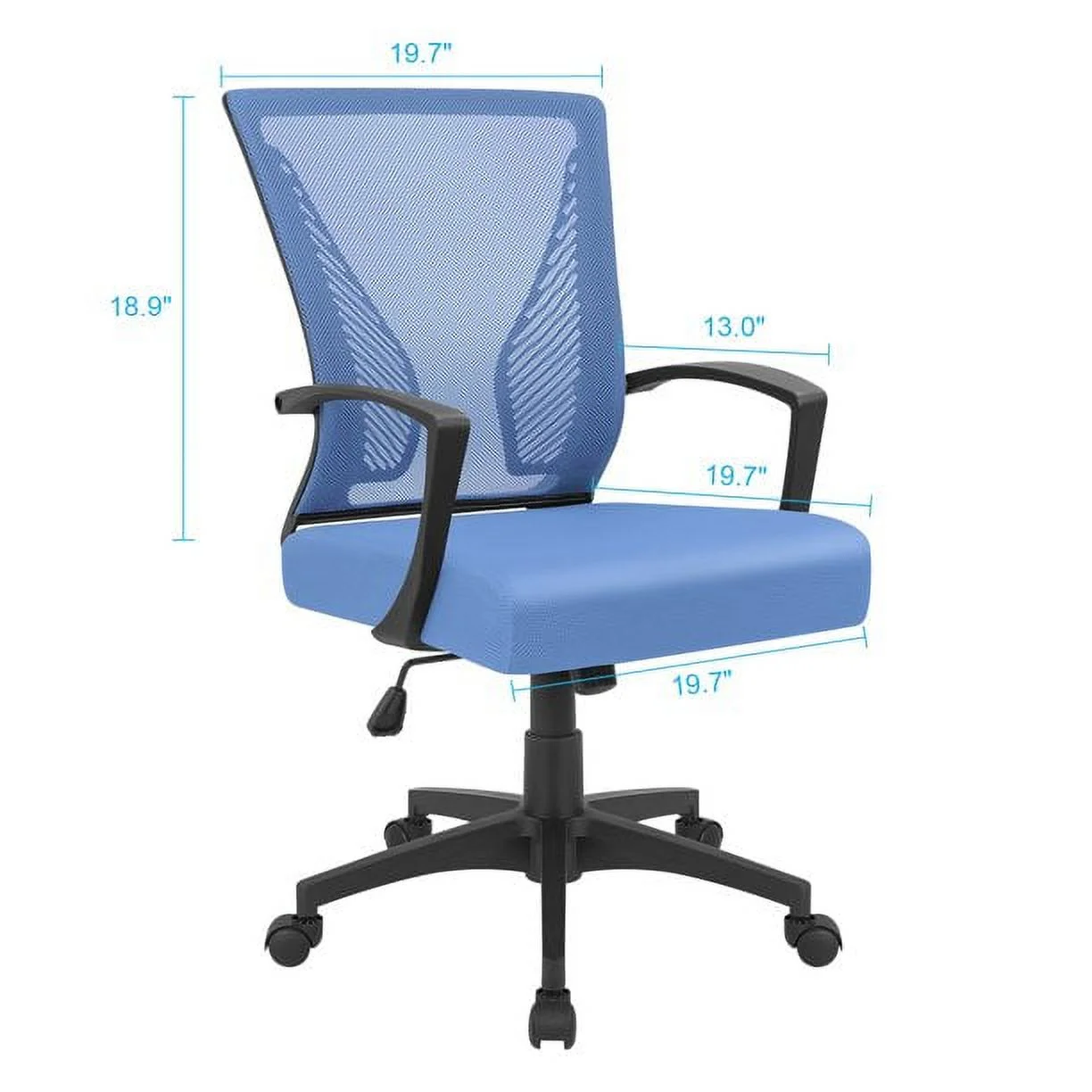–Cosy&Health: Wing-back design offers lumbar support ergonomic design make you sit comfortably while working. Breathable mesh surface and high-density sponge not only provide excellent experience but also guaranteed it is not deformed easily. – Adjustable Function: The angle of tilt can be adjusted using the knob under the chair and the sitting height can be lifted up and down with a handle under the chair. Adjust to different form to meet sitting preferences. – Reliable Quality: Certificated gas lift and chair legs make it more reliable and sturdy, maximum capacity up to 265 lbs. 5 star heavy duty base with 360 degree swivel wheels, running smoothly on floors. – Multiple occasions available: This basic mid-back office desk chair is good value. Simple and classic design can fit any decor style. Every home and office can take it. – What We Offer: A new office chair, Complete installation tools, An installation instruction. ????If you have any questions, please feel free to contact us~ Customer service email: [email protected] –Specifications: Color: Blue Material: Mesh & Steel Seat Dimensions: 21.3” x 21.3” x 39” (L x W x H) Adjustable height: 3.7″ Load Capacity: 250 lbs –Package Included: 1 x Mid Back Office Chair 1 x Installation Hardware 1 x Installation Tool 1 x Installation Manual Vineego Mid-Back Office Chair Matching Desks –If you prefer office style, please click 43inch office desk with storage bag 47inch office desk with storage bag and shelf –If you want to increase space utilization, please click L-shape gaming desk L-shape office desk –If you want a healthier lifestyle, please click 43inch electric standing desk 55inch electric standing desk –If you prefer gaming style, please click 43inch/55inch T-shaped legs gaming desk 63inch T-shaped legs gaming desk Another style 55inch T-shaped legs gaming desk 43inch Z-shaped legs gaming desk