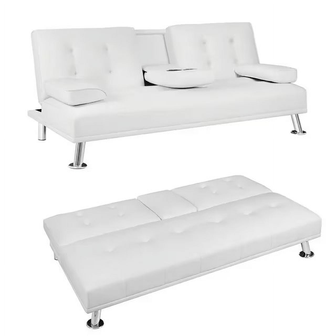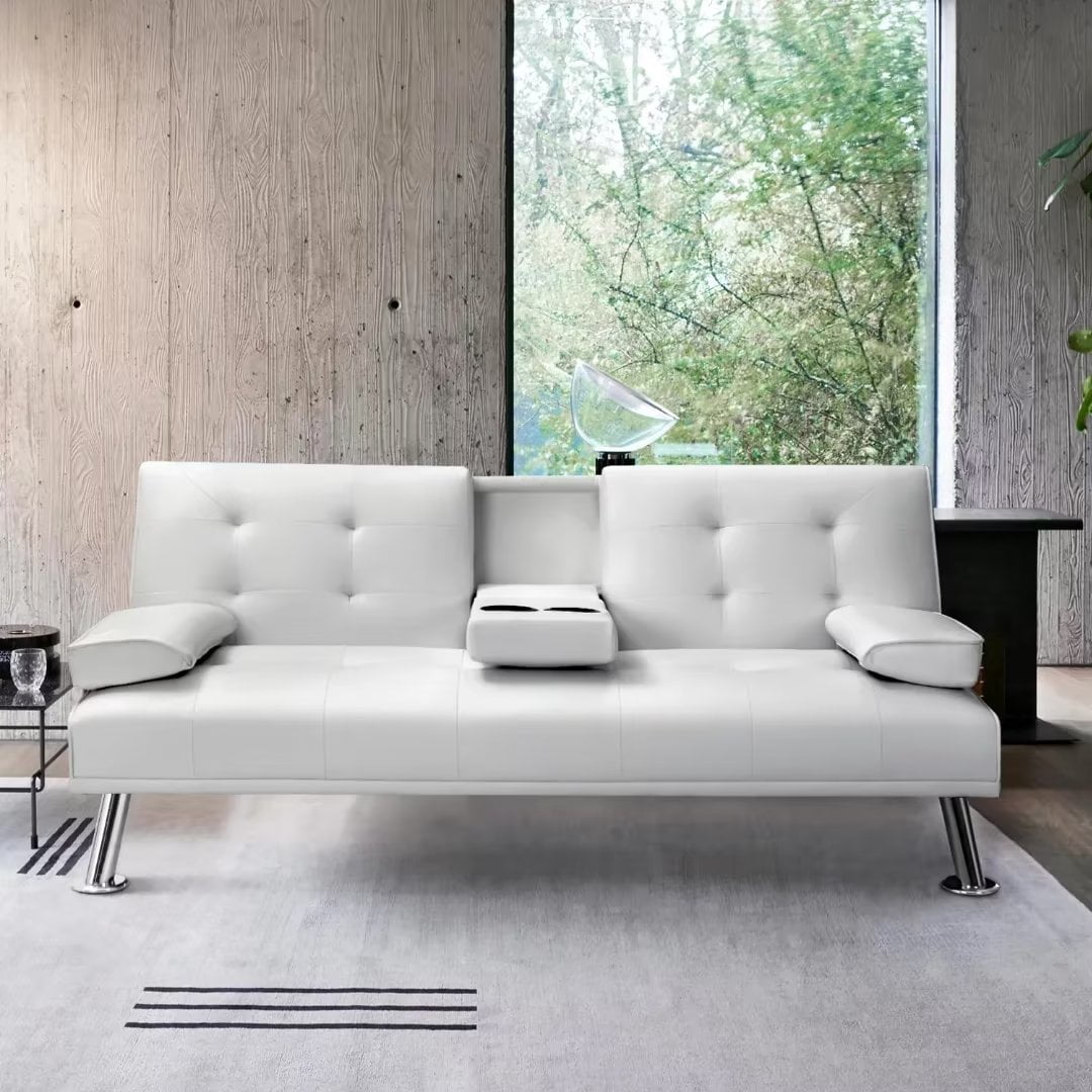 Vineego Modern Faux Leather Couch Convertible Folding Futon Sofa Bed with 2 Cup Holders,White