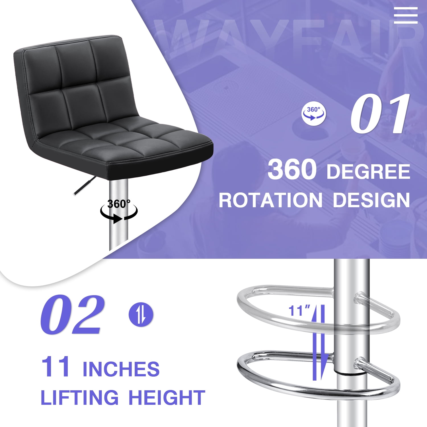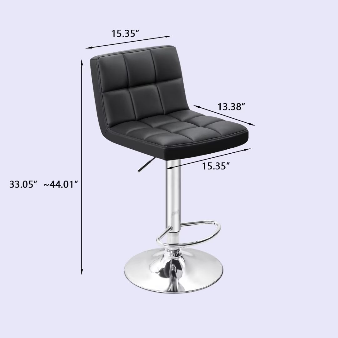 Adjustable Design:Our bar features a 360° swivel seat, making it easy to grab something or chat with others without having to stand up, turn around or move around frequently. The chair height can be adjusted from 33.05-44.01 inches to meet different needs. Modern style and padded bar stool bring you comfortable and enjoyable usage experience Easy to install and touch: with detailed instruction installed the stools less than 20 mins. Specifications: 360 degree rotation Material: Premium PU leather and metal Seat size: 16″(L) x 15.4″(W) Height adjustment range: 33.5″-44.01″ Rubber ring at the bottom to prevent scratching the floor Quadrangular cushion, filled with high-density three-dimensional foam Pneumatic adjustable height, easy and safe to adjust Base and footrest, made of chrome-plated steel, durable and stable