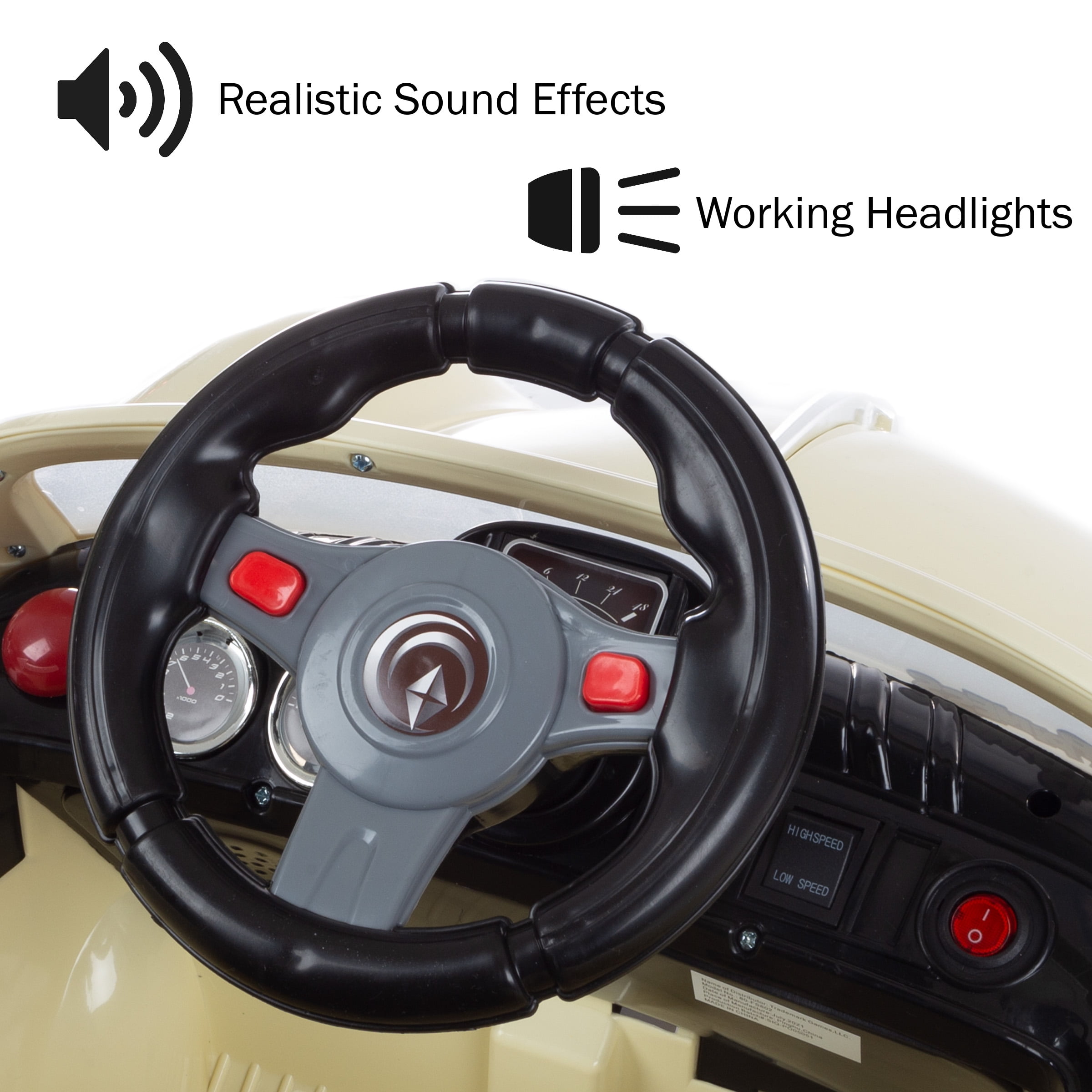 KIDS ELECTRIC CAR – This classic kids’ car is smooth and simple to ride for children aged 3 to 6. Charge the included 6V battery according to the provided ride on car instruction manual, turn it on, and your child can press the pedal and start driving. REALISTIC FEATURES – The 6-volt electric car has both forward and reverse functions, high and low gears, headlights, a driver’s door that opens, an auxiliary port to play MP3s, a horn, sound effects, and cruises at a safe speed between 2-3 miles per hour. PARENTAL REMOTE CONTROL – This electric car for kids allows parents to fully operate the toy car by remote control or assist their child as they learn to drive. Perfect for outdoor and indoor playing, this car can be used on any hard, flat surface. SAFE AND DURABLE – Made from rugged high-quality plastics with chrome trim, this ride on car with remote control is great for boys or girls. The Lil’ Rider cars for kids are free of banned phthalates and provide healthy exercise and plenty of fun. PRODUCT DETAILS – Materials: Plastic. Dimensions: (L) 36″ x (W) 22″ x (H) 15.5″. Specs: 15W, 6V 4.5ah Rechargeable Battery. Output: DC12V 500mA. Speed: 2 to 3mph. Requires 2AA Batteries. Assembly Required. Use Under Adult Supervision. Color: Cream.