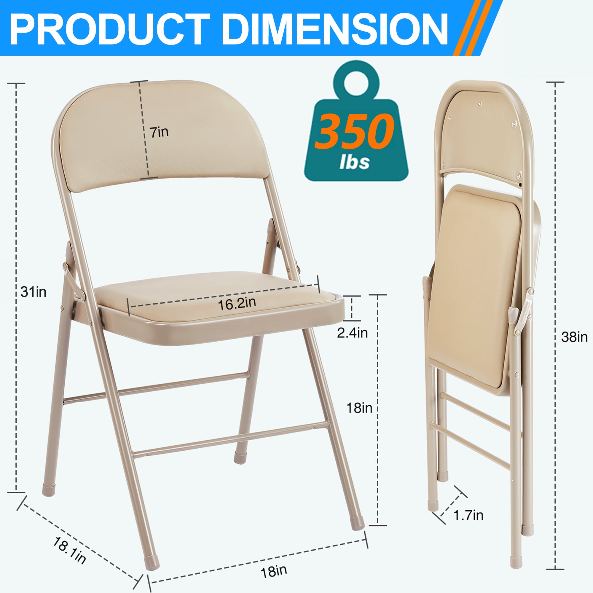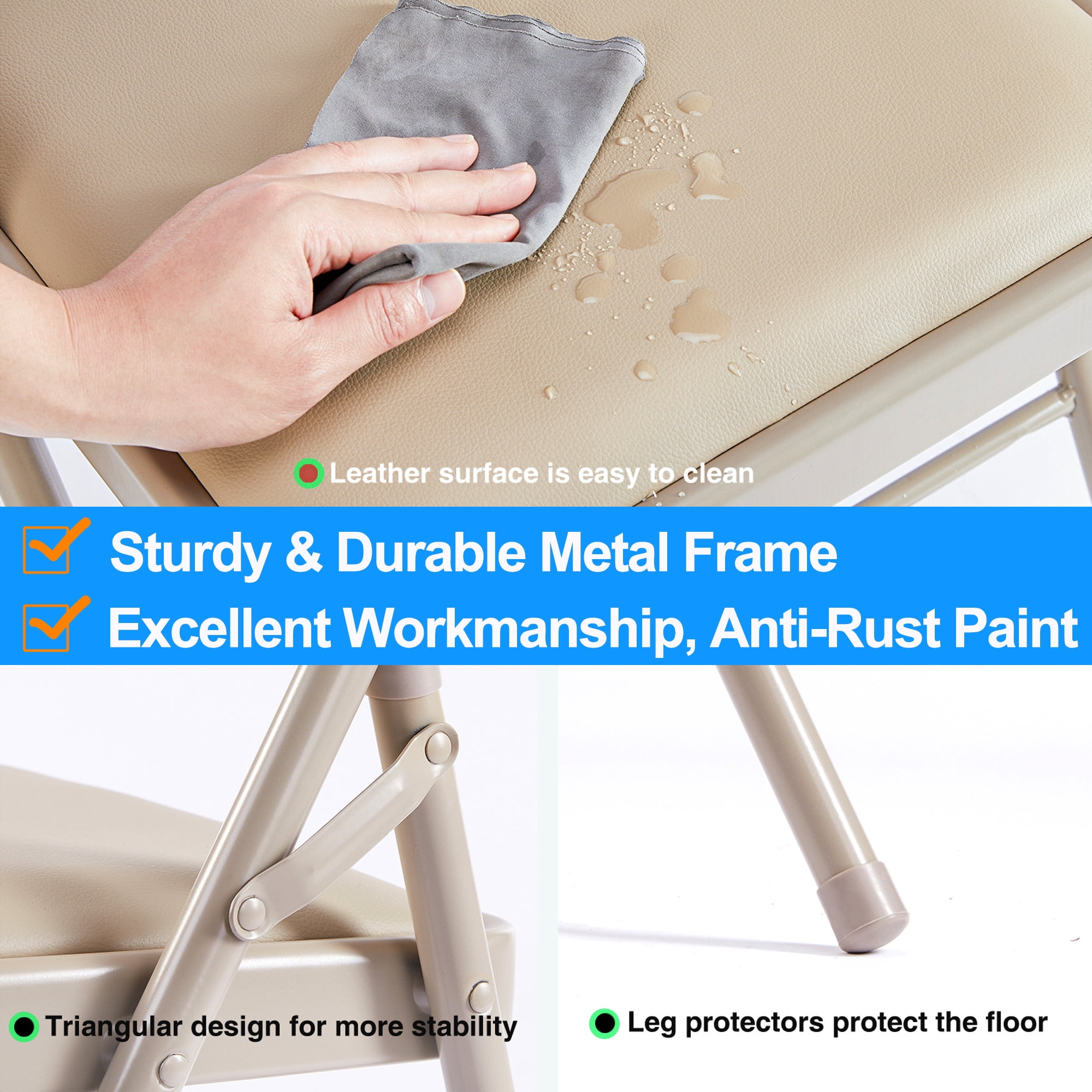 ????【Superior Comfort】The folding chair’s backrest and seat cushion feature high-density sponge padding, providing exceptional comfort for you or your guests. The premium quality PU leather used gives an excellent touch and provides an impressive sitting experience, making this chair soft and comfortable yet durable and easy to maintain. ????【Robust & Stable】The folding chair is made with a high-quality metal frame treated with plastic spray to prevent rust. Side reinforcement bars form a triangular structure for added stability. The high-quality leather is durable,water-resistant,and easy to clean. ????【Easy to Carry & Store】This folding chair for for outside is lightweight, weighing only 8.1 lbs, making it easy to move around. It can be folded up easily when not in use, saving you valuable space. Its practical design makes it ideal for events such as large outdoor and indoor banquets. ????【Classic and Stylish】The chair boasts a sleek black framework complemented by black leather upholstery. This subdued yet sophisticated design allows the chair to blend seamlessly with any décor, bringing a touch of elegance to your surroundings. ????【Convenient to Use】The folding chairs require no assembly, and it can be easily opened and folded in seconds. It’s the perfect chair for meeting rooms, reception areas, weddings, gatherings, church, and other events.