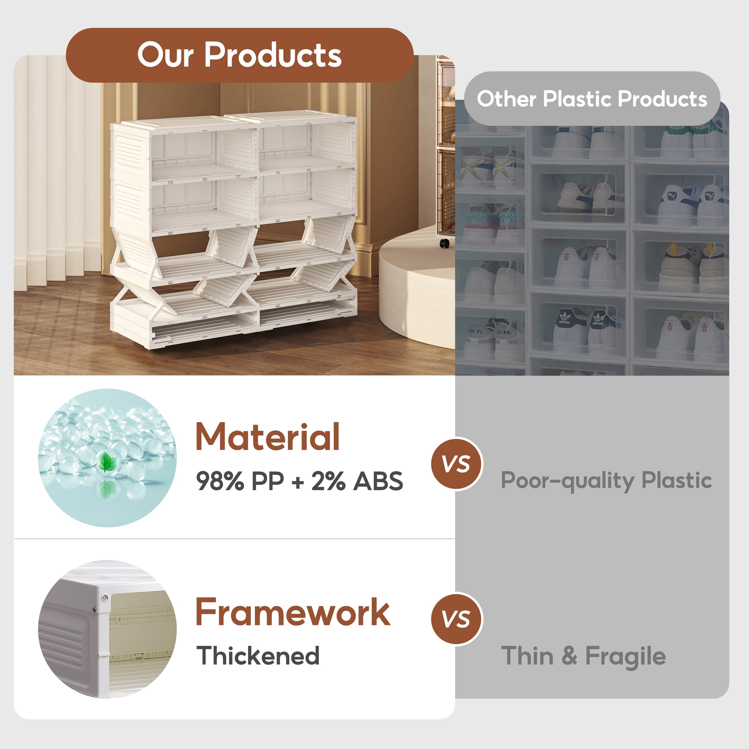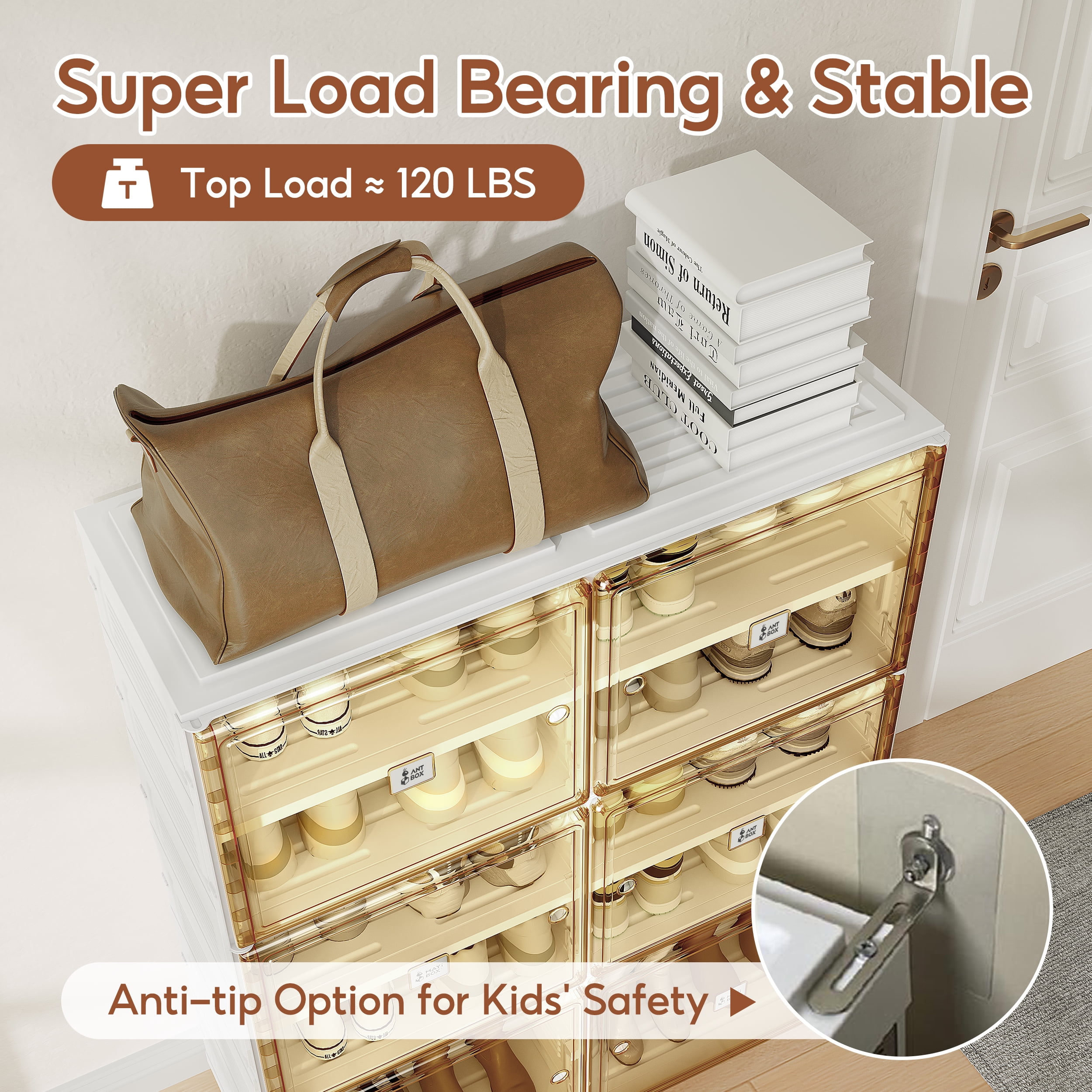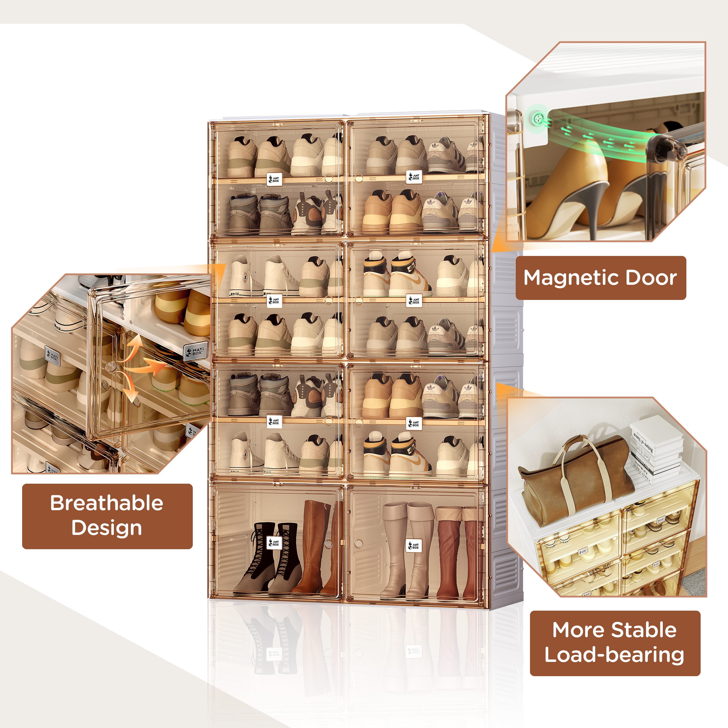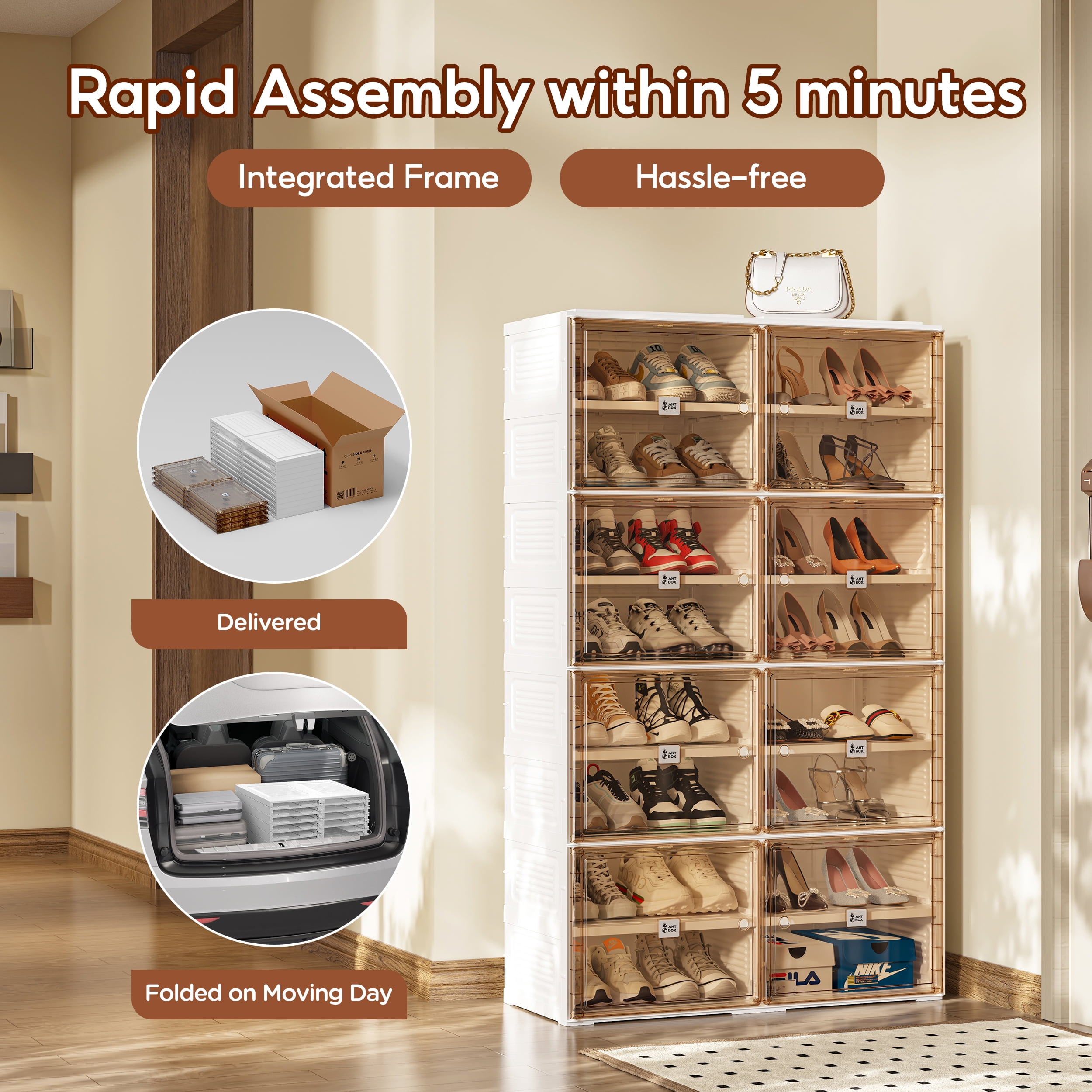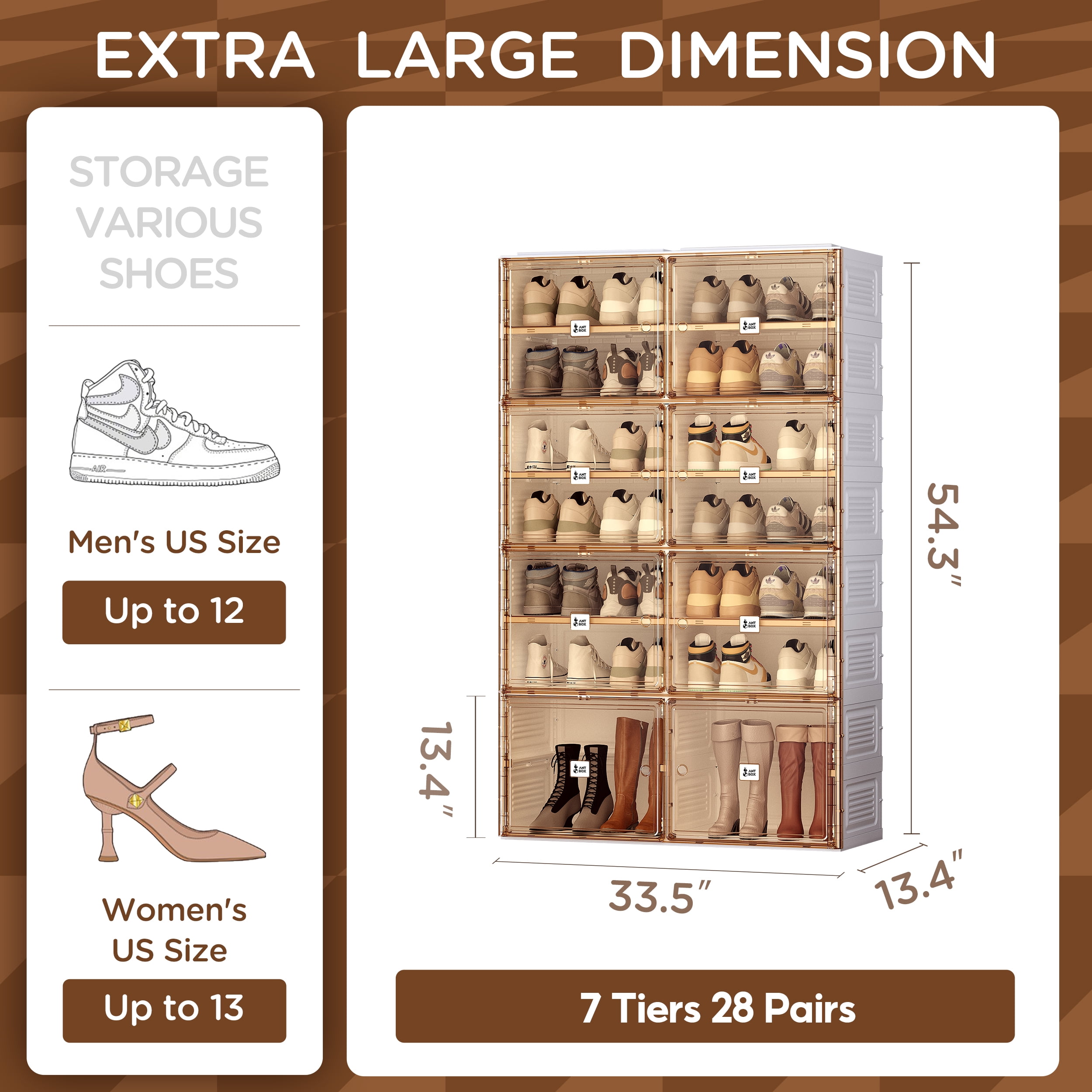 Specification Color: Clear brown, white Material: 98%PP+2%ABS Product Dimension: 33.46” x 13.39” x 54.33” (L x W x H) Maximum Capacity of Top: 132 lbs Net Weight: 31.15 lbs Package includes: 1 Plastic Shoe Organizer 8 clear brown doors 1 pair of assembly gloves 1 assembly instruction 1 screw kit for anti-tip installation [Easy Assembly and Disassembly]: The foldable shoe rack cabinet is ingeniously made into a one-piece structure, providing you the experience of rapid installation and fast folding in just 5 minutes. Easy for you to store, carry and move. [Extra Large Capacity]: The shoe organizer box can store up to 28 pairs of shoes. It boasts enough space, catering to many kinds of storage needs from standard-sized men’s and women’s shoes like sneakers, high heels, etc., to daily items like toys, collections, etc. Save your space and keep your home well-organized. [Strong Sturdiness and Durability]: VIPBOX plastic shoe storage box is made of high quality plastic material (PP+ABS) and with solid construction, ensuring excellent load resistance and durability. You can also place storage items at the top. [Easy to Care and Identify]:The clear sneaker boxes with light brown magnetic doors is easy to clean. The doors with strong suction make it convenient to close, and effective to prevent water spill, dust accumulation, pet mischief. The breathable design makes it a well-ventilated shoes box. The clear doors meet display needs and make it easy to locate your items. [Odor-Free]: This kids shoe cubby is designed without any irritating odors, ensuring a pleasant storage experience. It’s pet-friendly, offering a safe and secure space for your furry companions and kids without causing any harm.