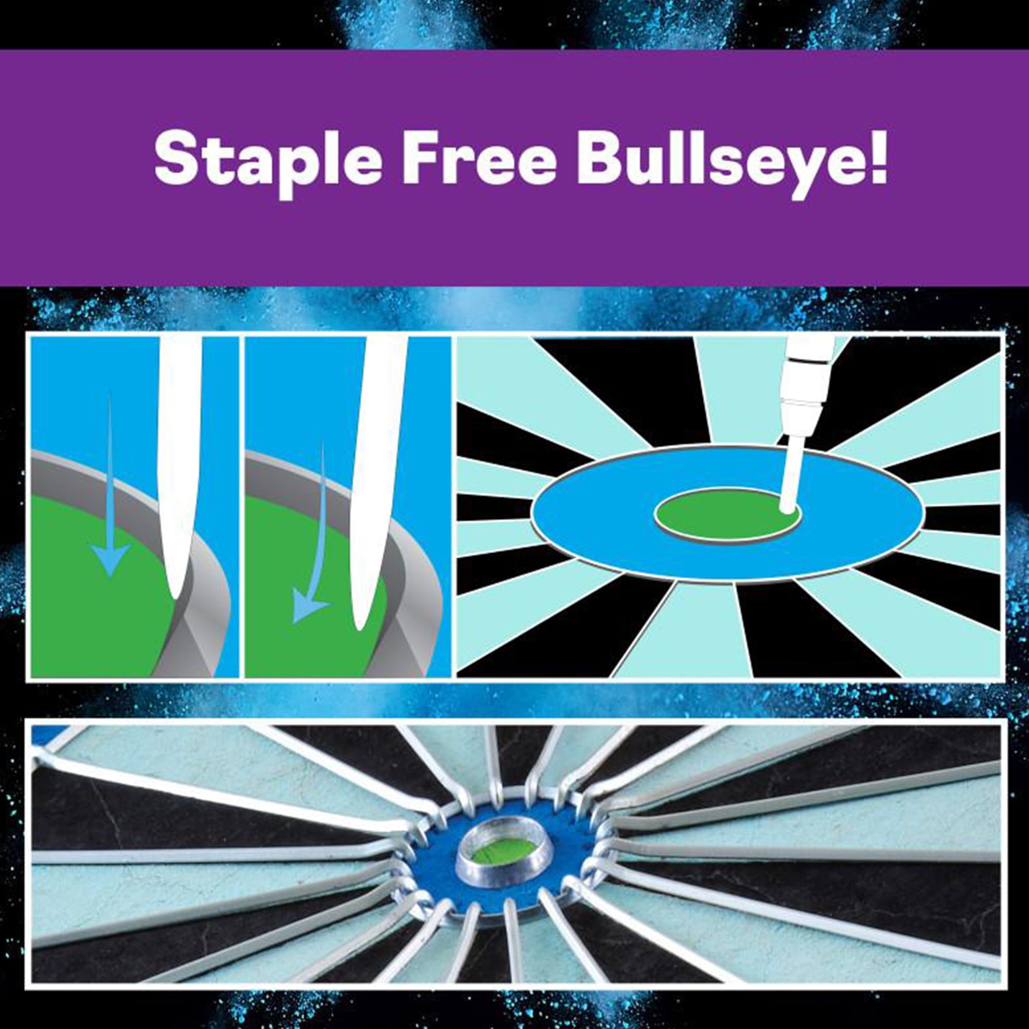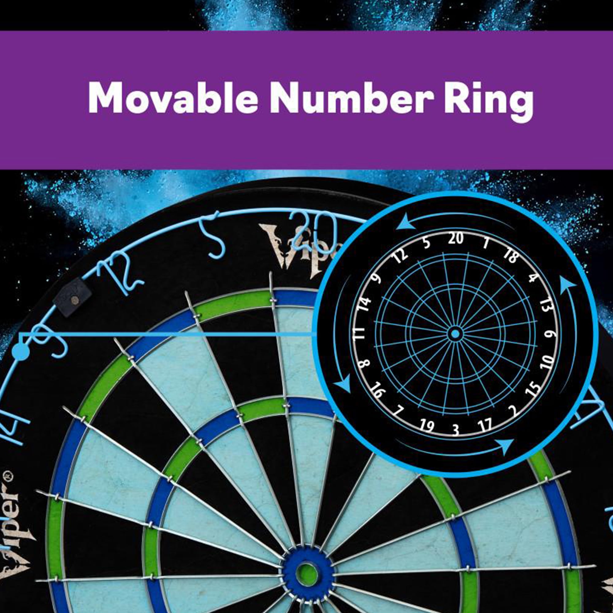 Wall-mounted dartboard featuring a regulation-size 17.75-inch diameter scoreboard surface Self-healing sisal fiber surface works with both steel and soft-tip darts Moveable number ring lets you easily rotate the dartboard and give fibers time to heal Galvanized spider and staple-free bullseye keeps bounce-outs to a minimum Vibrant blue and green tones draw the eye and match your modern decor Dimensions (L x W x H): 18 x 2 x 18 inches Weight: 11 pounds Manufacturer warranty: 90-day warranty