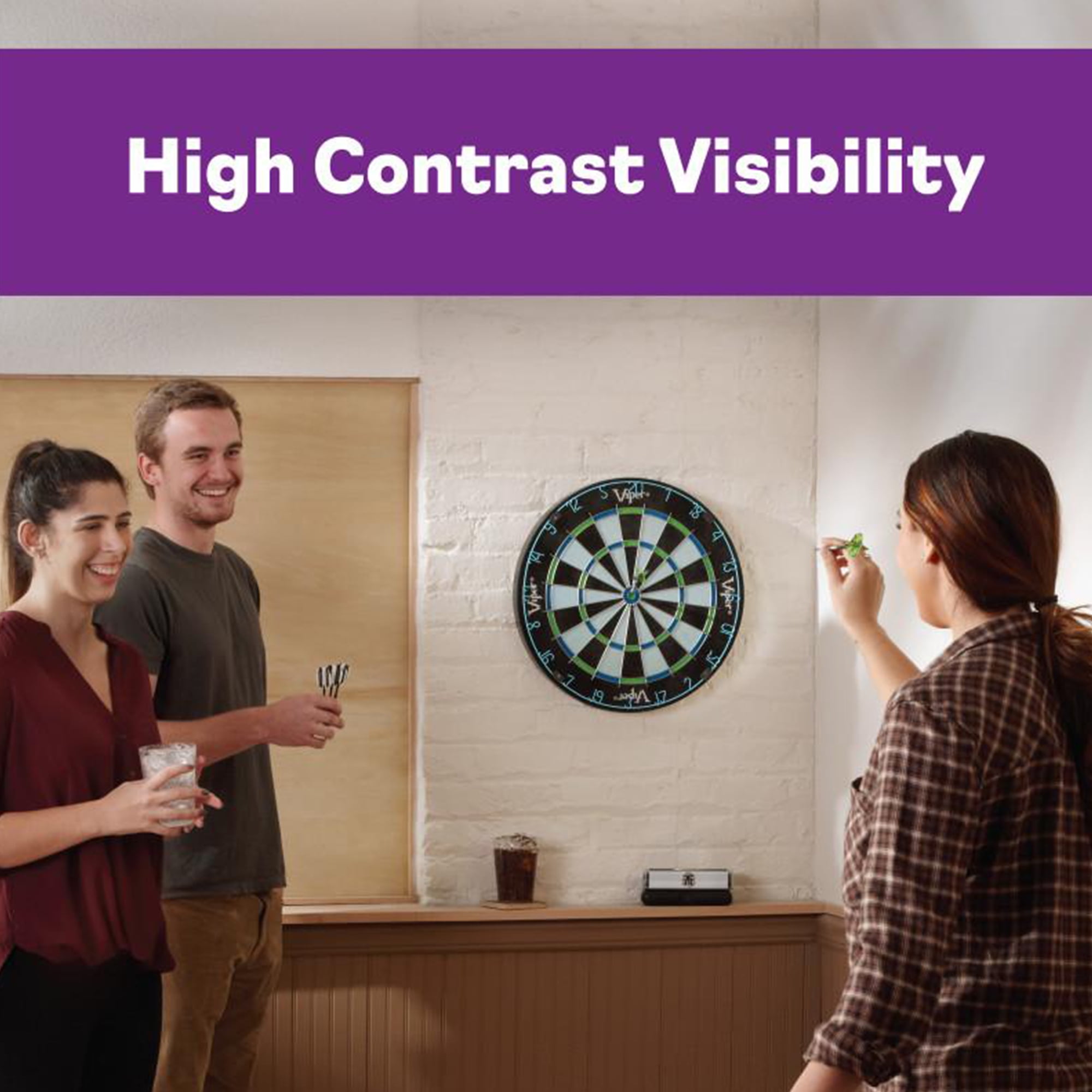 Host a pro tournament or just challenge your friends to a casual game between pints with the Viper Chroma Regulation Size Tournament Quality Sisal Dartboard. This classic dartboard has a heavy-duty design with a wide catch-ring border that’s built to stand up to aggressive play night after night, making it a perfect addition to your barroom wall or man cave decor. The scoreboard boasts a thin galvanized steel spider for a broader scoring area and a staple-free bullseye to prevent bounce-out. Made from self-healing sisal, the backing accommodates both soft-tip and steel-tip darts. A rotating number ring that lets you move the board surface and give the fibers time to heal between games. Best of all, the board comes in brilliant electric blue and green tones that match your modern interior design to a tee. Add the Viper Chroma Regulation Size Tournament Quality Sisal Dartboard to your rec room accessories and enjoy hours of head-to-head fun with all your friends.