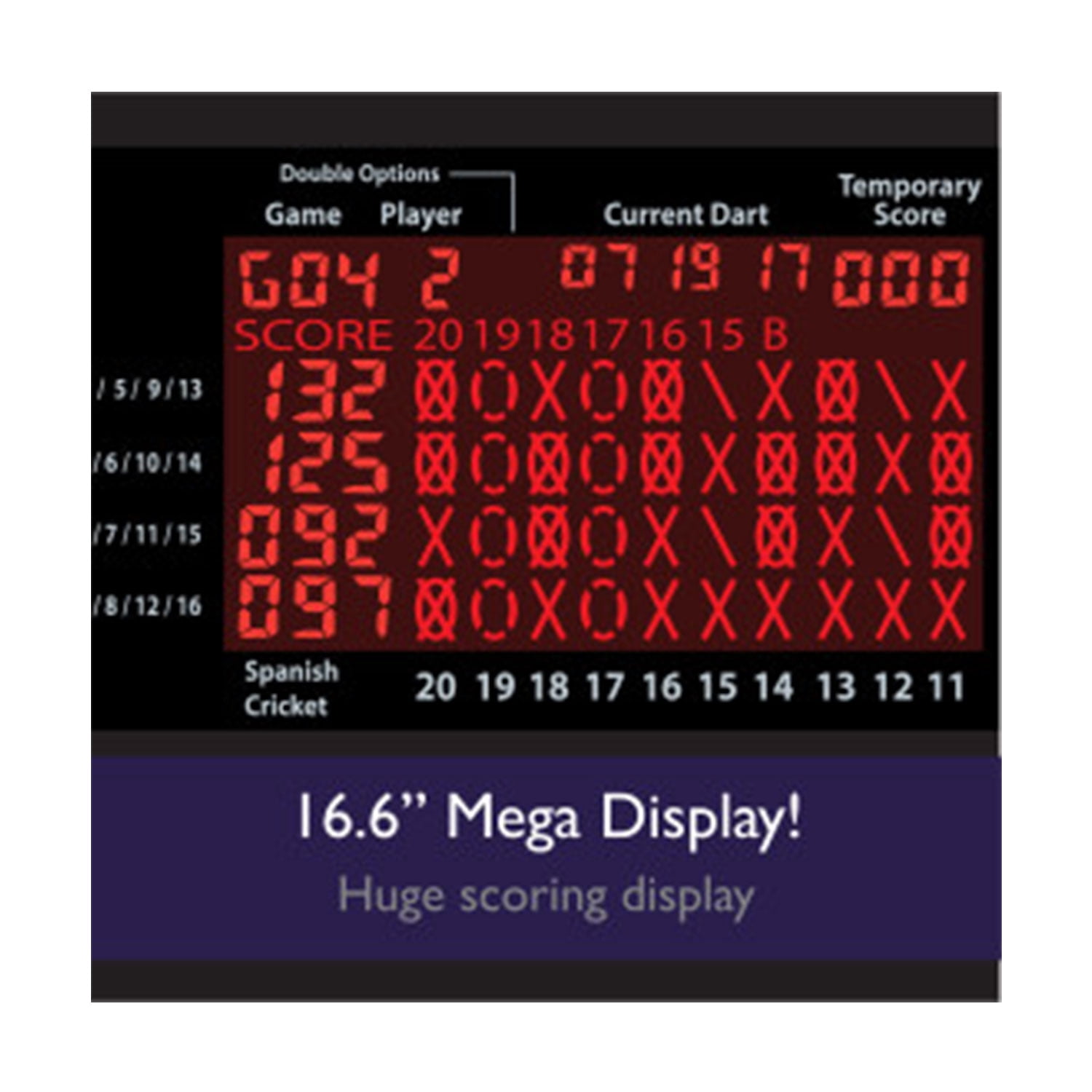 Tournament quality regulation 15.5 inch target face Practice against the computer and improve your skills with 5 levels of difficulty Target Tested Tough segments withstand your toughest throws again and again Up to 16 player multiplayer, including team play 57 games with over 307 options with exclusive Minnesota and Spanish Cricket games Includes single in/out, double in/out, and double bull Includes 6 soft tip starter darts and 24 tips Backlit LCD scoreboard tracks game points and per dart and per round average points 10 key interface Keys include on/off, game, option, player, next, miss/double, bounce out, handicap, quick 301/cricket, eliminate score, and volume Colors: Red, silver, and black Dimensions: 24.3 x 19.6 x 1.3 inches Weight: 4.8 pounds Manufacturer warranty: 1-year warranty
