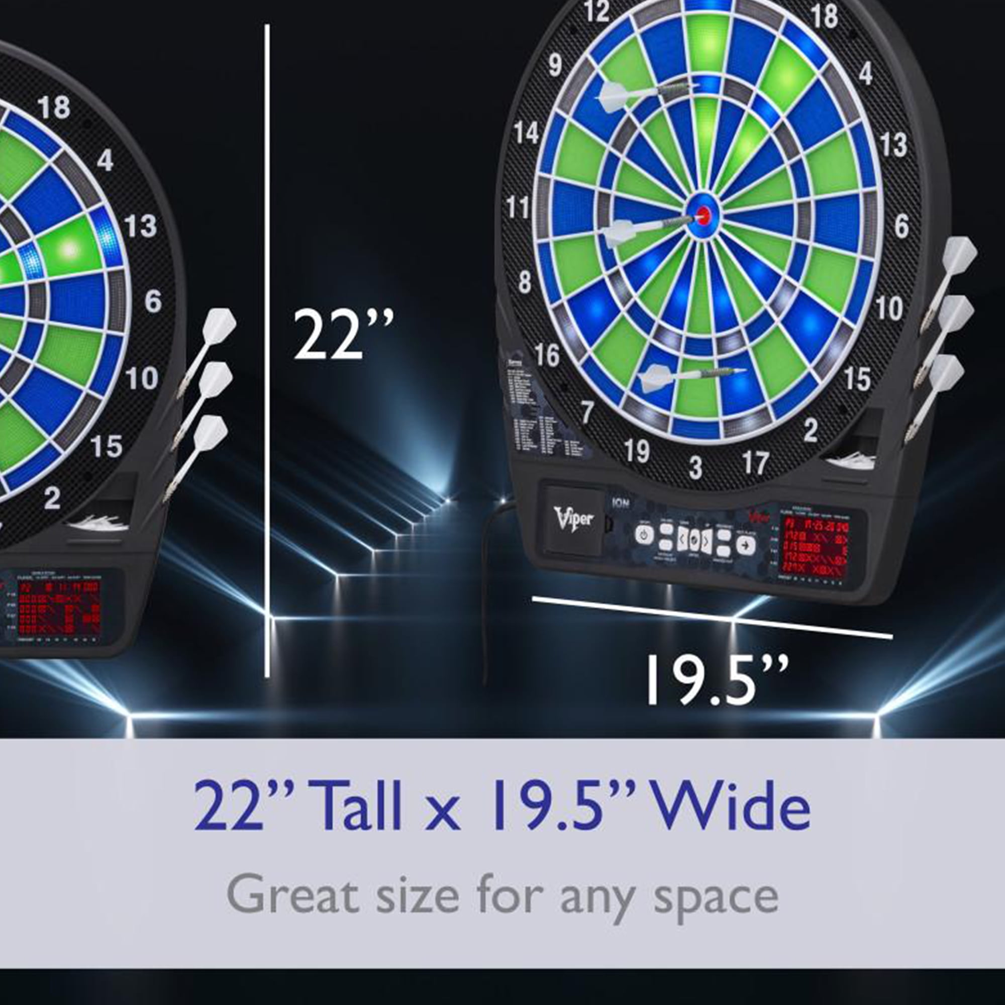 Modern wall-mounted dartboard featuring an LED-illuminated scoreboard surface Challenge up to 8 friends with 48 games with 315 variations, including 17 light-based games with moving targets Durable segments designed to stand up against repeated use and hard throws again and again Automatic scorekeeper keeps track of your hits so you don’t have to Includes 6 soft tip darts, mounting hardware, 6 spare tips, and instruction manual Dimensions (L x W x H): 22 x 1.2 x 19.5 inches Weight: 4 pounds Manufacturer warranty: 90-day warranty