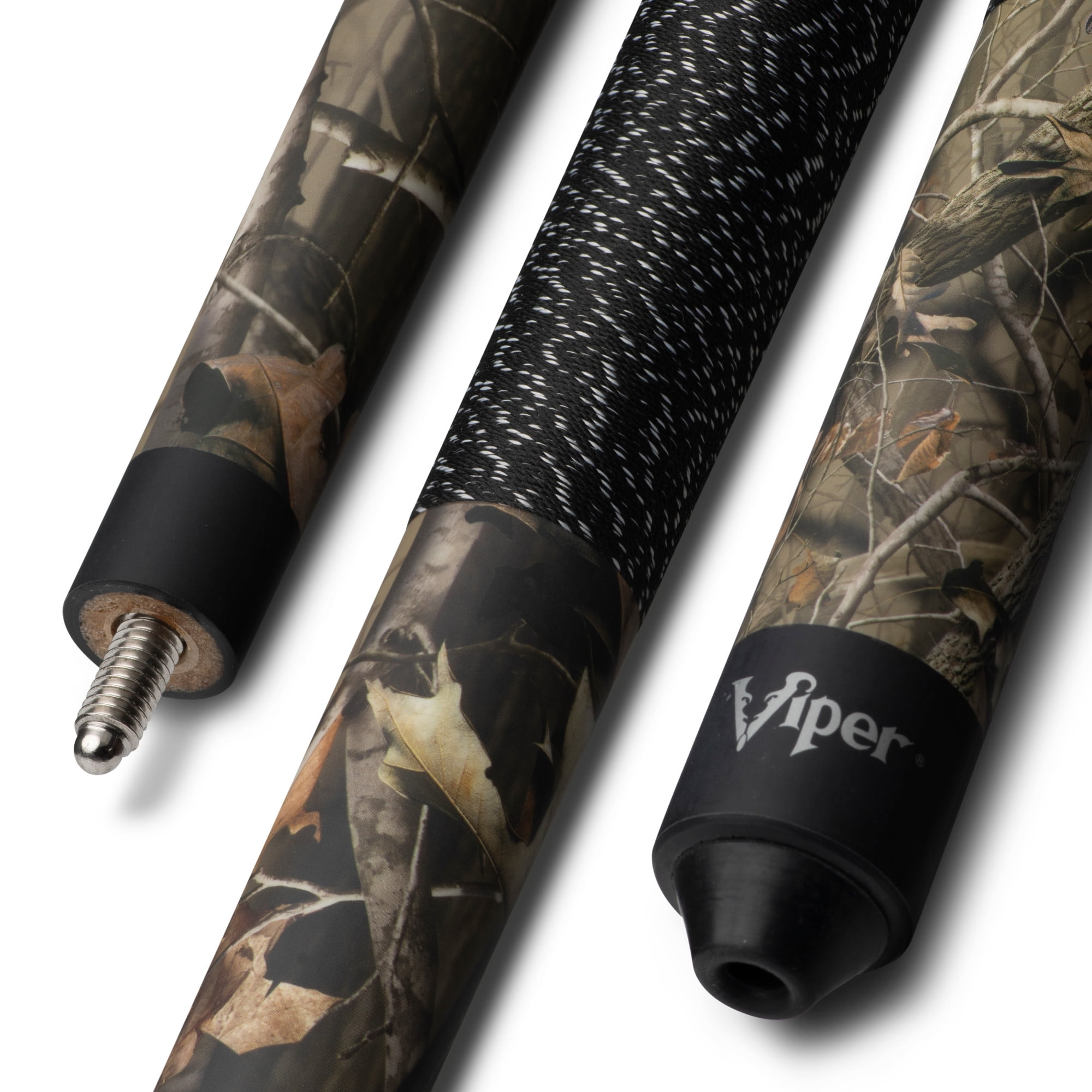 Bring your favorite outdoor hobby together with your favorite indoor hobby with the Signature Realtree Billiard Cue Sticks from Viper. Fashioned from Canadian maple hardwood to withstand years of use, the Signature Realtree billiard cues stand out from the rest with officially licensed Realtree camouflage graphics. These cue sticks feature all the performance-enhancing qualities youve come to expect from exceptional cues. A Le Pro leather tip ensures a solid grip on the ball, reducing miscues, and a gradual taper gives a natural and comfortable feel across your stroke. The shaft and butt combine with durable ABS joints, secured with brass pins, to give consistent feedback on every shot.